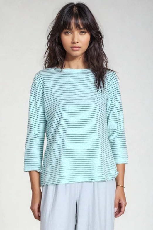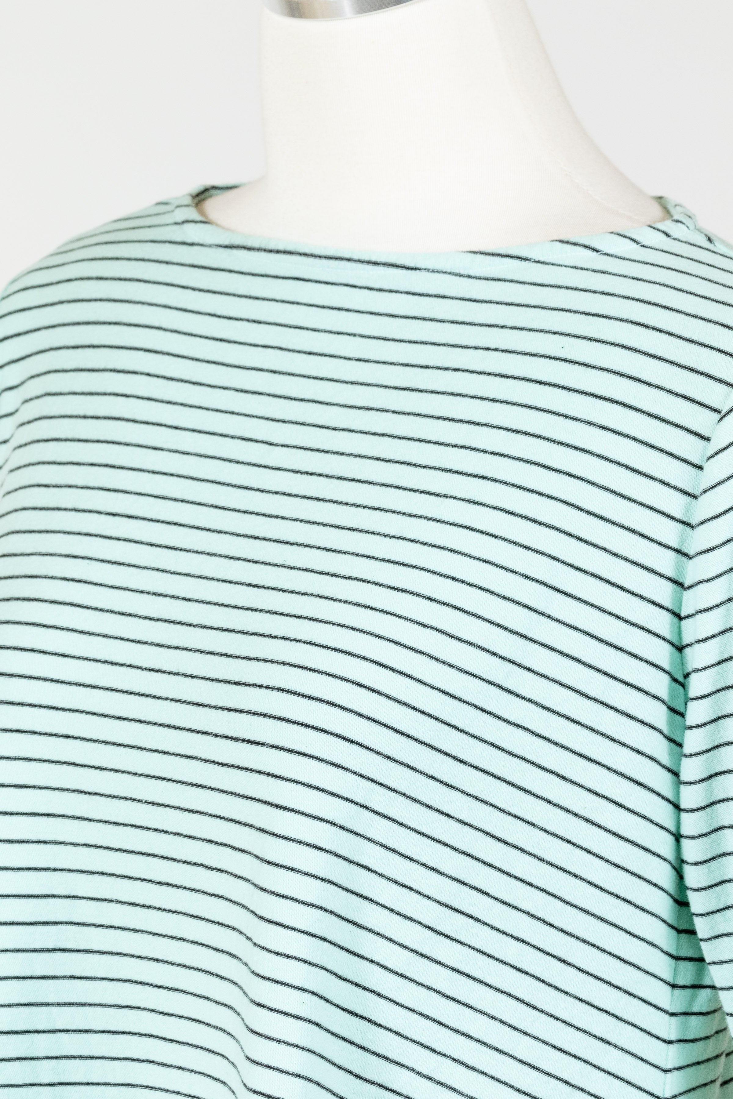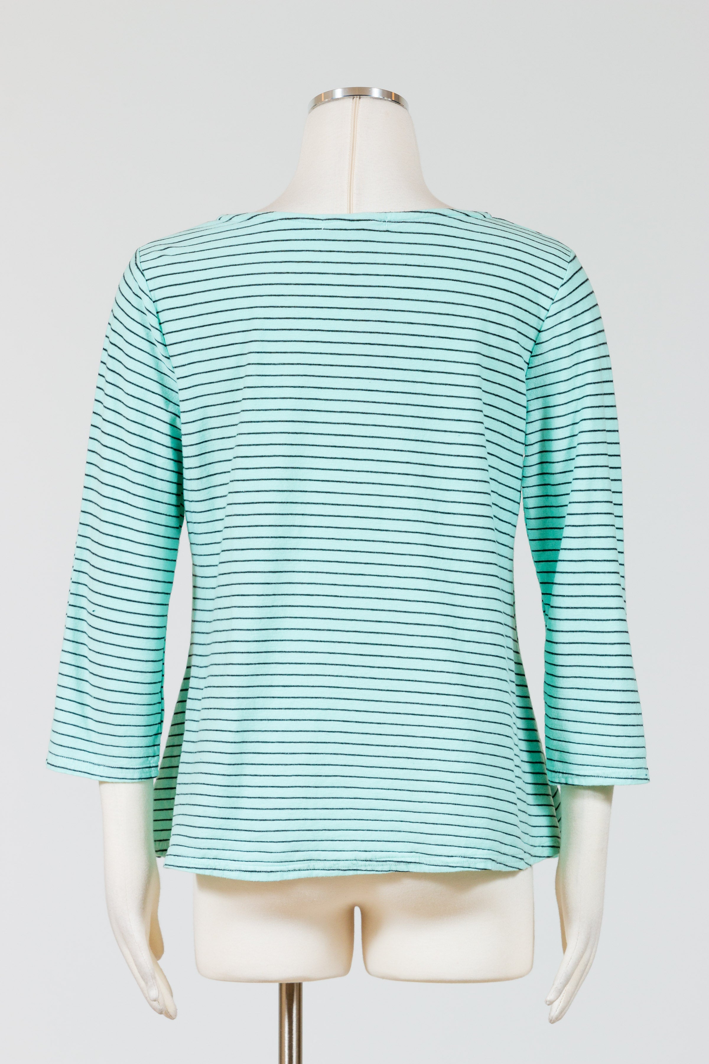 Get ready to add a versatile must-have piece to your wardrobe with Cut Loose’s 3/4 Sleeve A-line Boat Neck Top! This striped tee is a must-have for summer with a flattering boat neckline, three quarter length sleeves and swing shape. Falls over the waist to about mid hip with a nice drape. Don’t miss out on this spring/summer wardrobe essential! Offered in Fountain, a mint green with an angled thin black stripe. Â