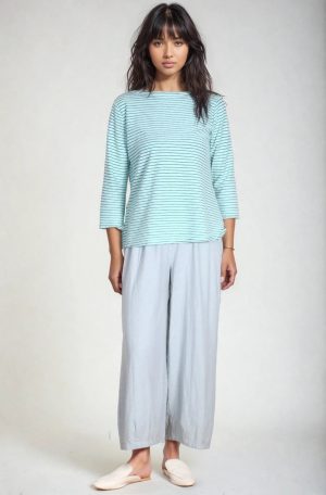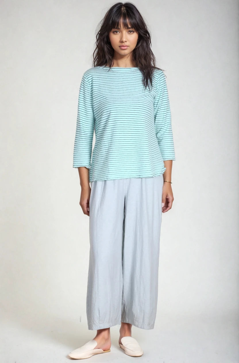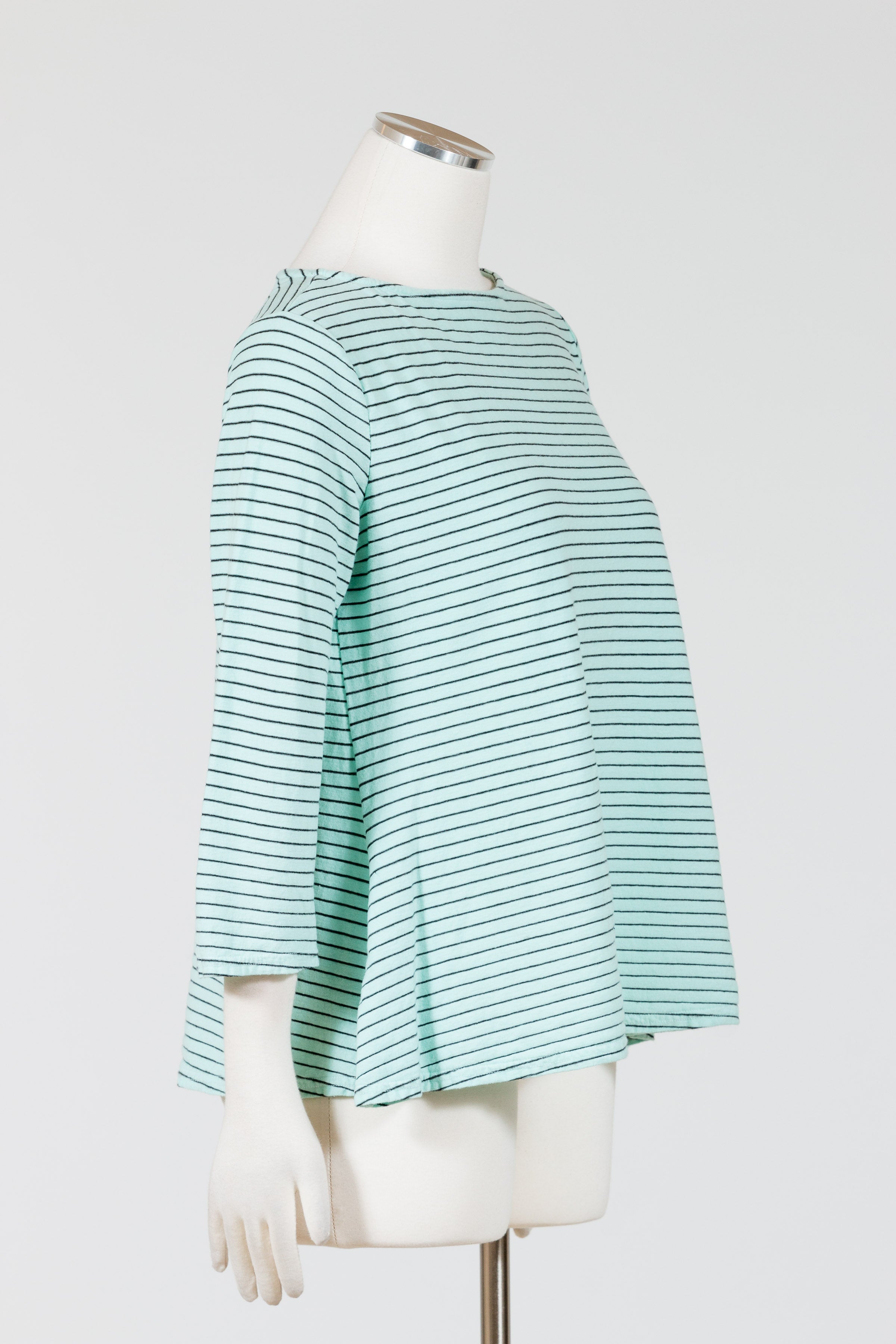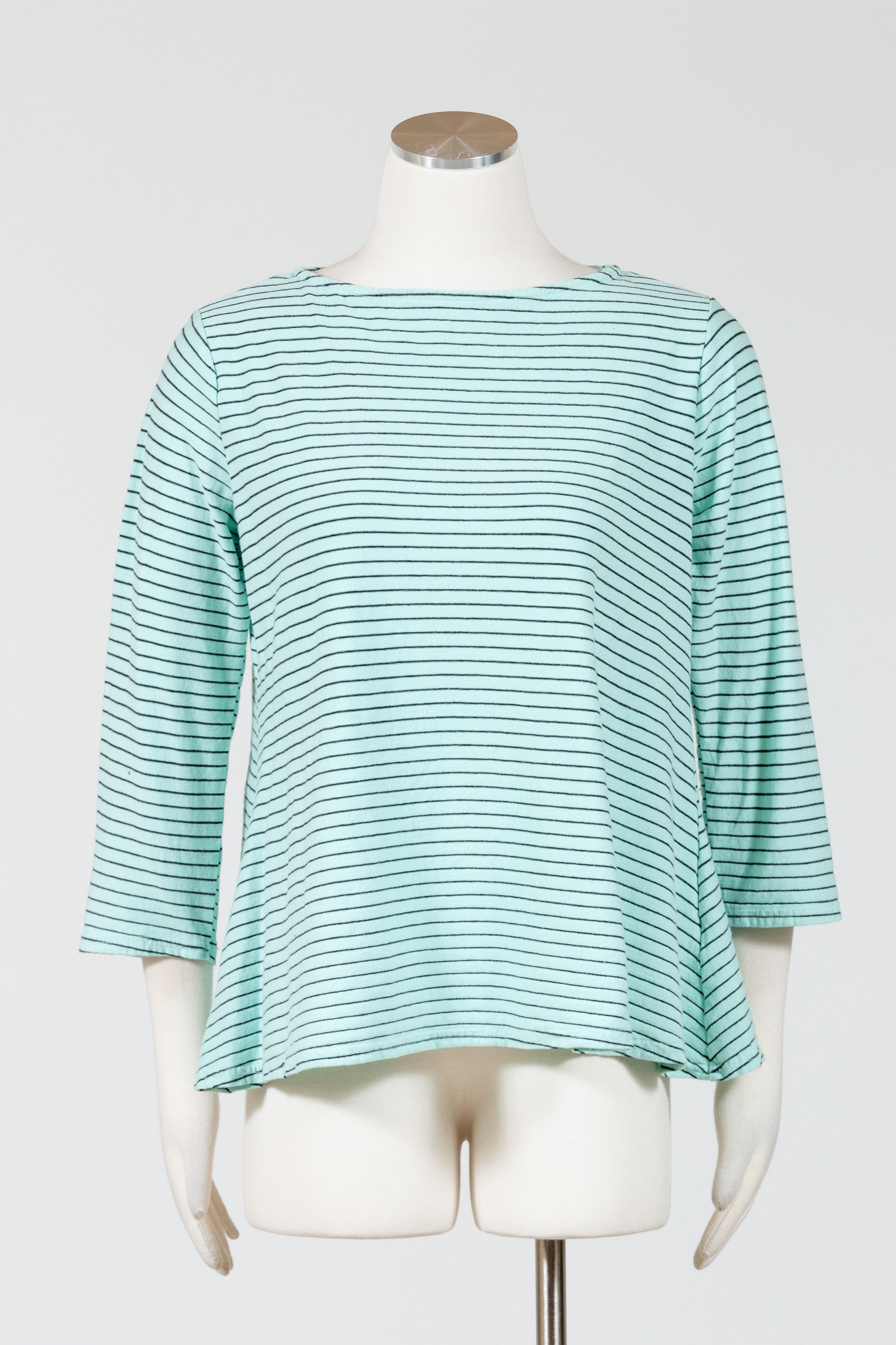Get ready to add a versatile must-have piece to your wardrobe with Cut Loose’s 3/4 Sleeve A-line Boat Neck Top! This striped tee is a must-have for summer with a flattering boat neckline, three quarter length sleeves and swing shape. Falls over the waist to about mid hip with a nice drape. Don’t miss out on this spring/summer wardrobe essential! Offered in Fountain, a mint green with an angled thin black stripe. Â