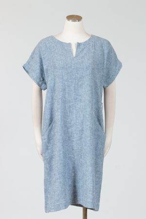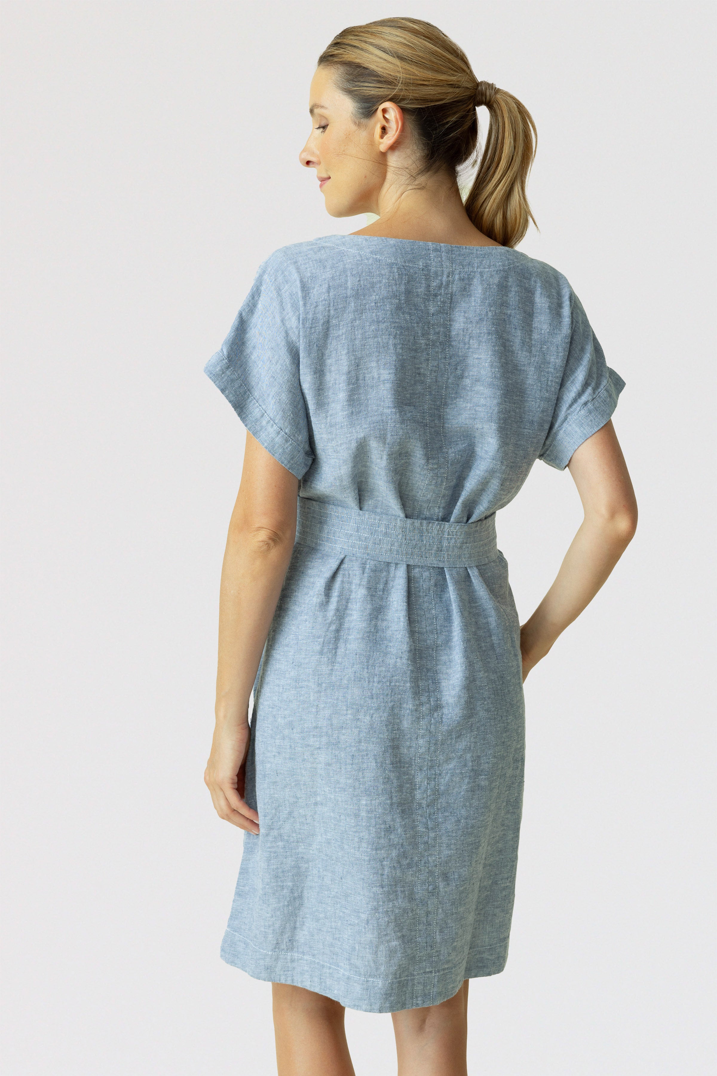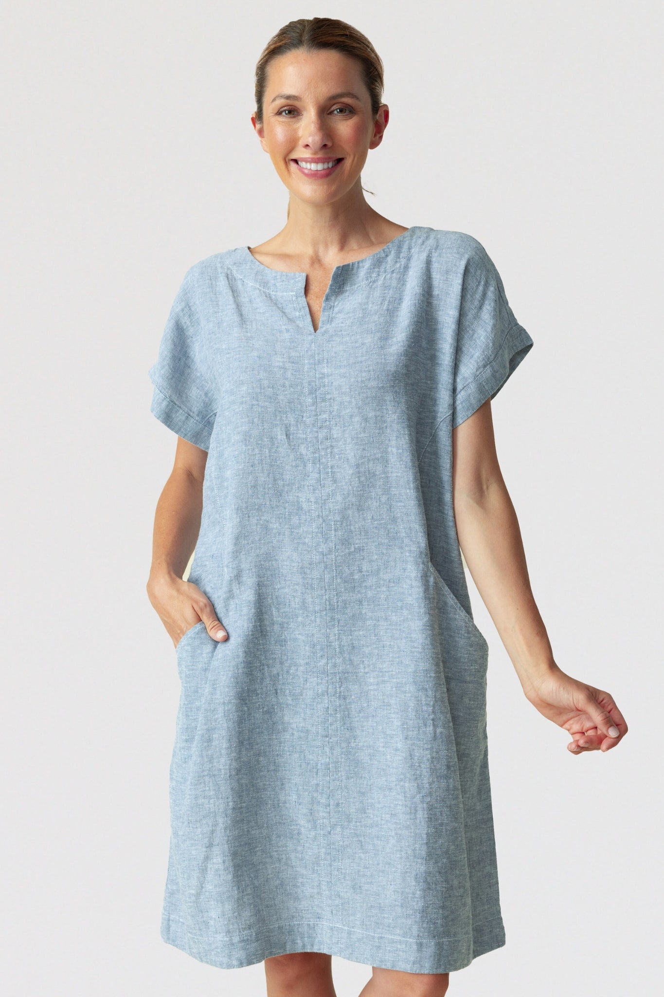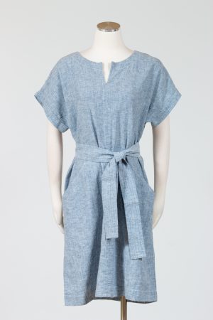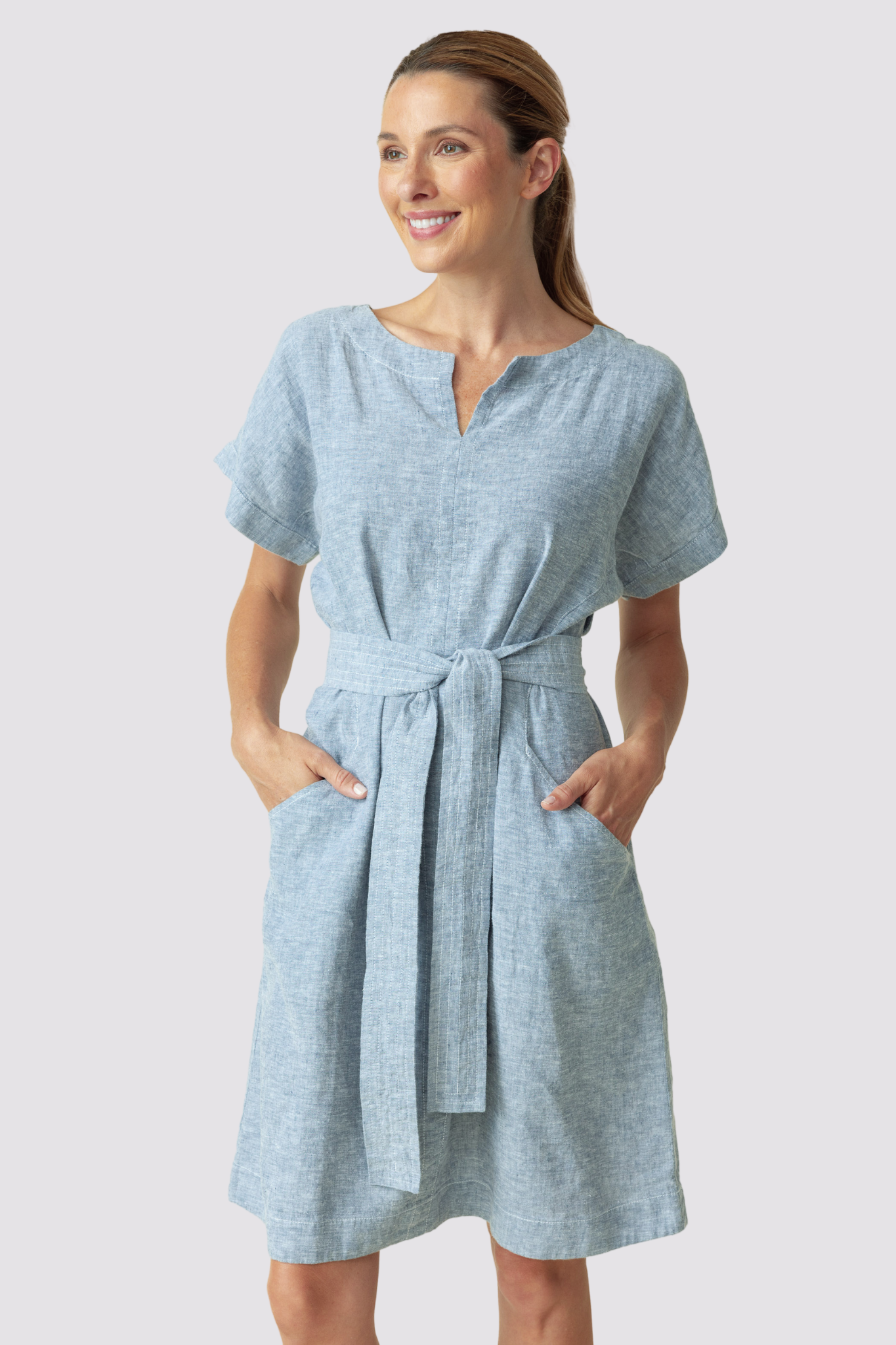 Experience supreme comfort and effortless style in Habitat’s Bethany Dress. This knee-length shift dress comes in a beautiful blue chambray linen and features a notched V-neck and short sleeves. It also includes a fabric belt to cinch in at the waist for a flattering fit. Plus, with two curved side pockets and front seaming, you’ll have all the functionality you need without sacrificing style.