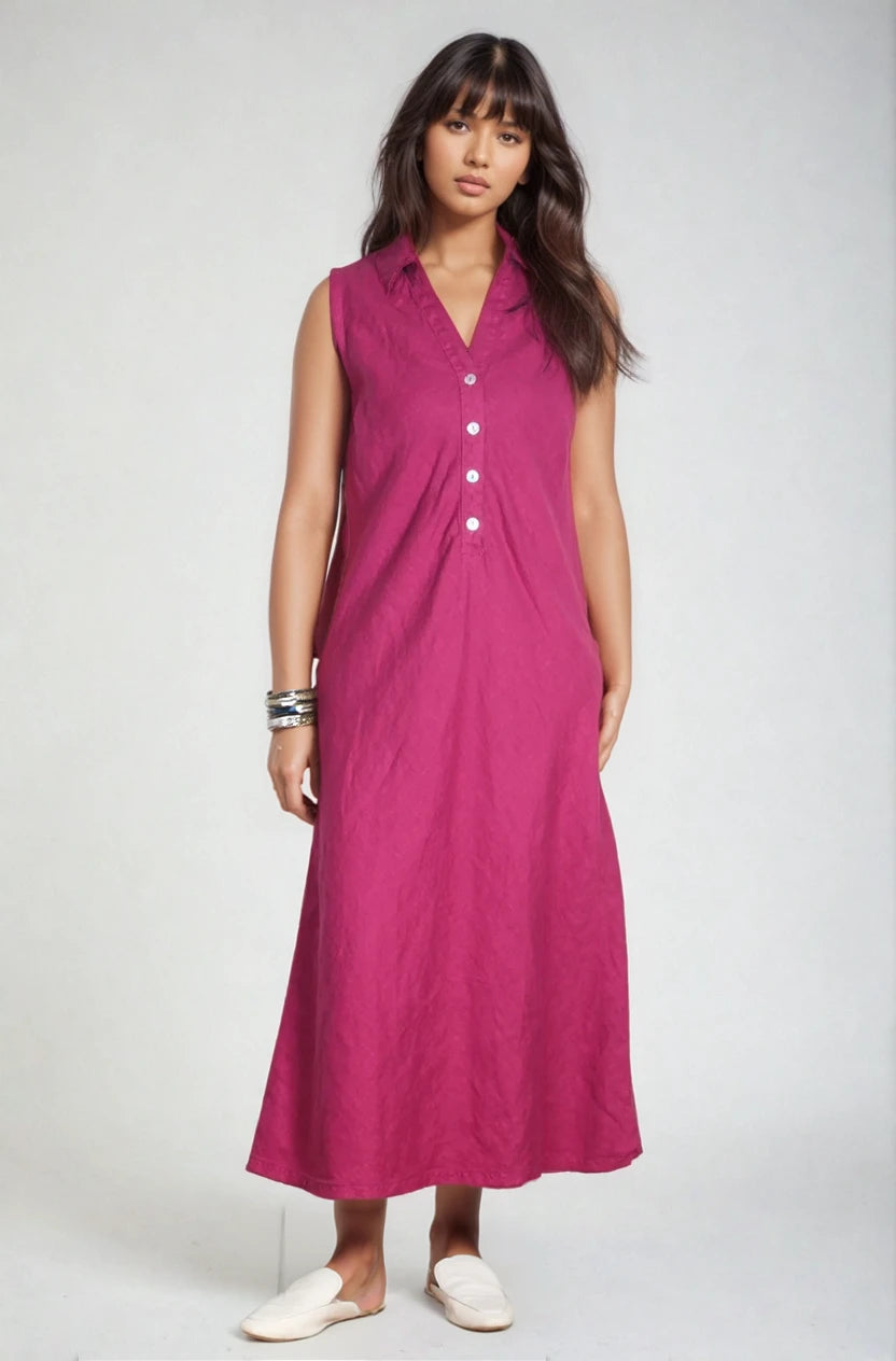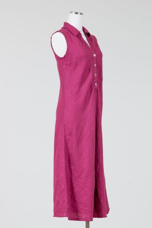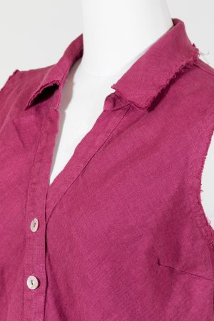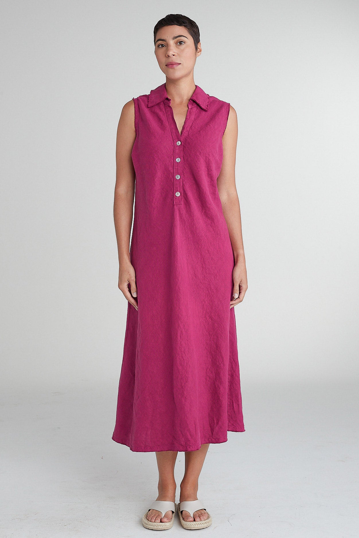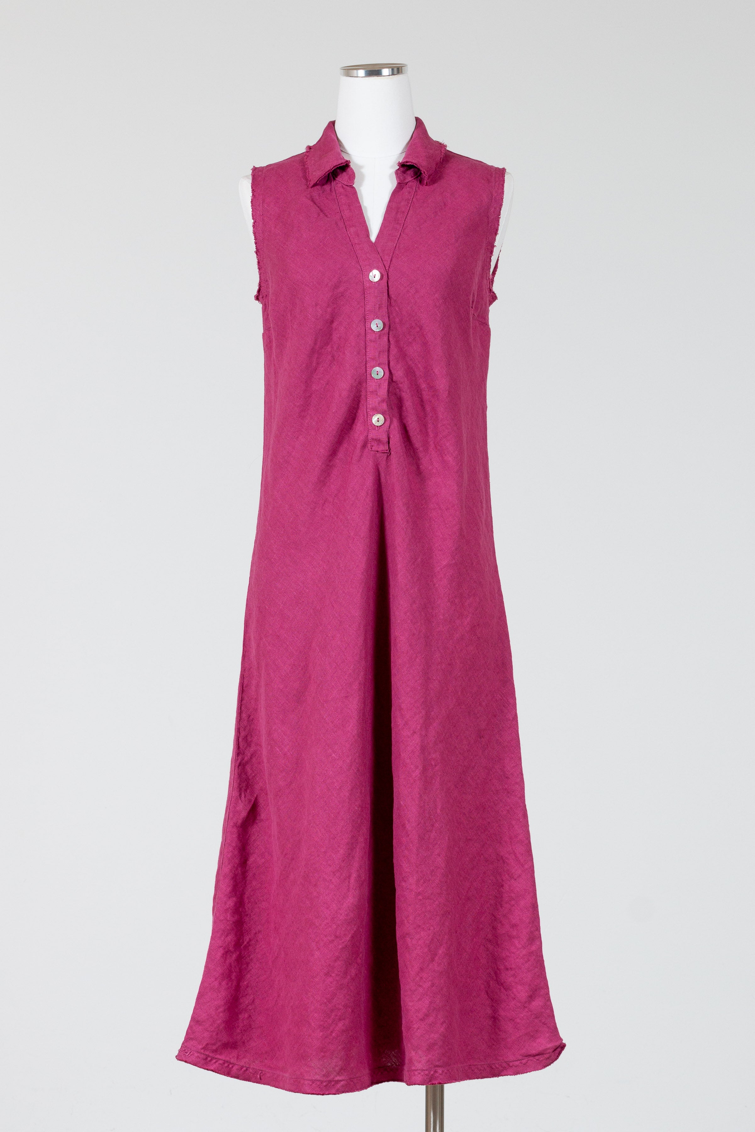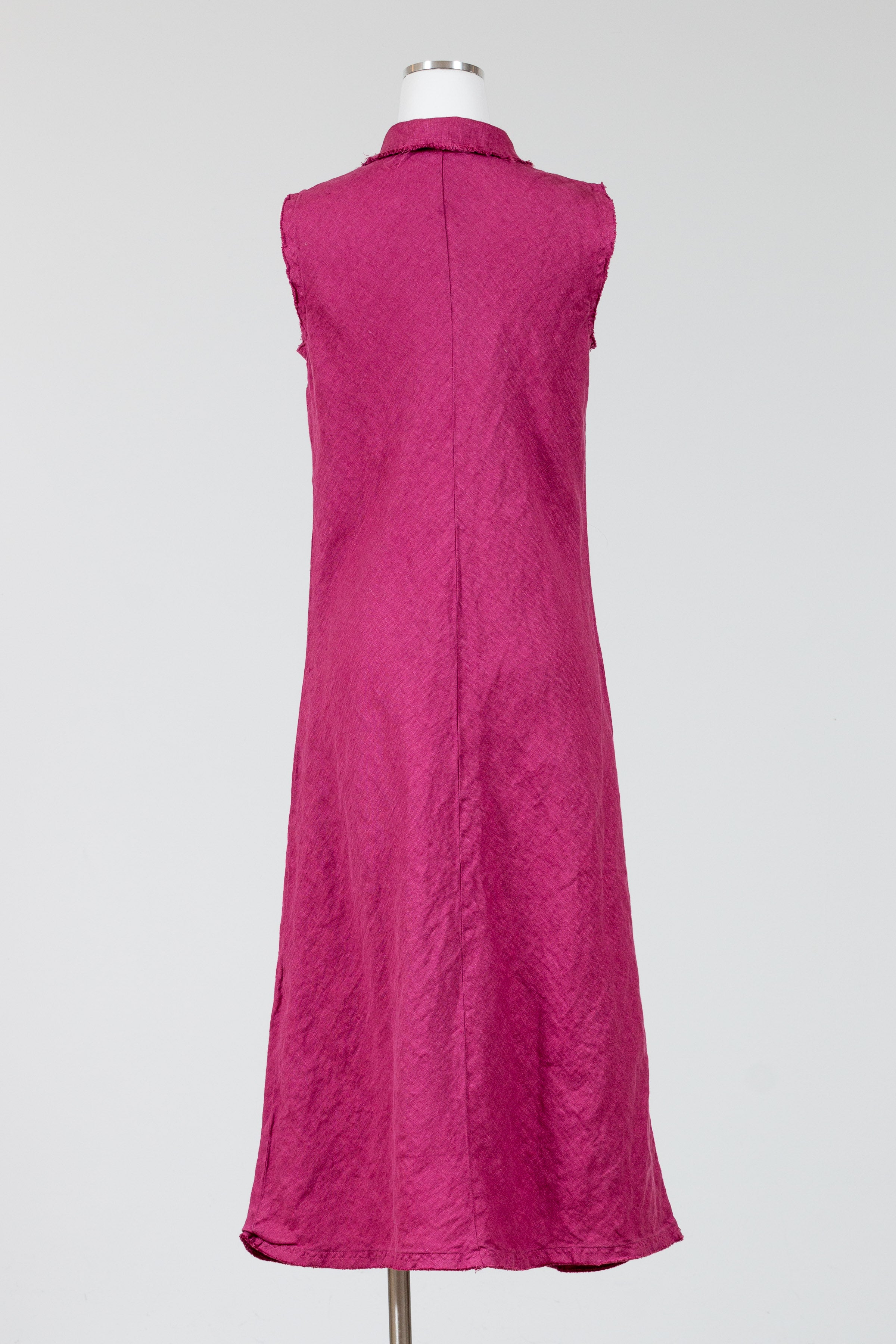 The Bias Placket Dress from Cut Loose is a chic and airy woven linen dress. Featuring a stylish V-neckline and a Mother of Pearl button placket, this sleeveless dress is accented with frayed edges on the collar, arms, and hemline. Designed with a flattering bias cut and darts on the chest, this dress hugs the body beautifully and falls gracefully below the knees. Plus, it’s pocket-free for a sleek and streamlined look. Offered in Rhubarb, a berry color.Â