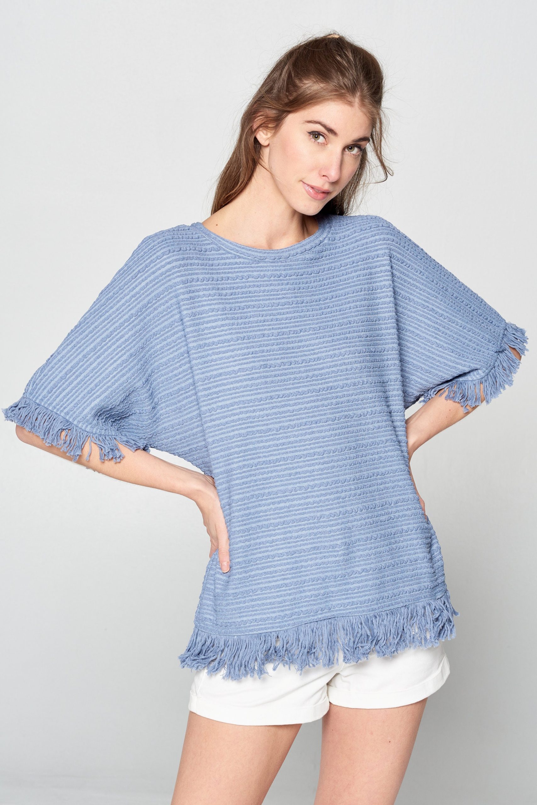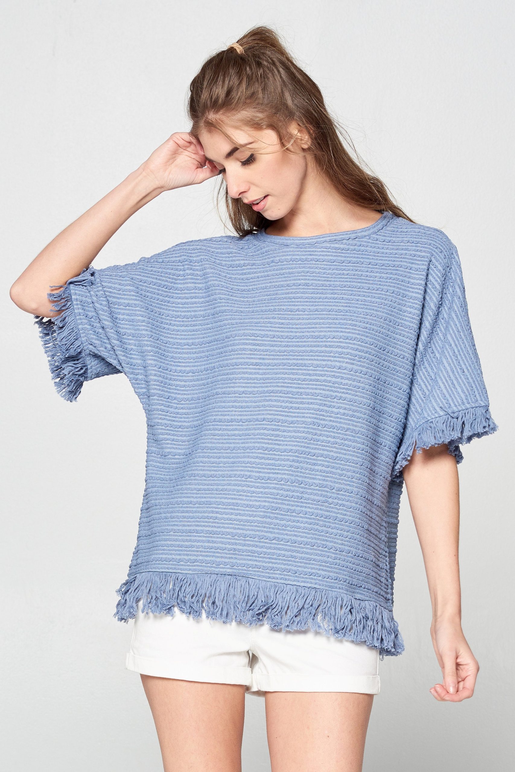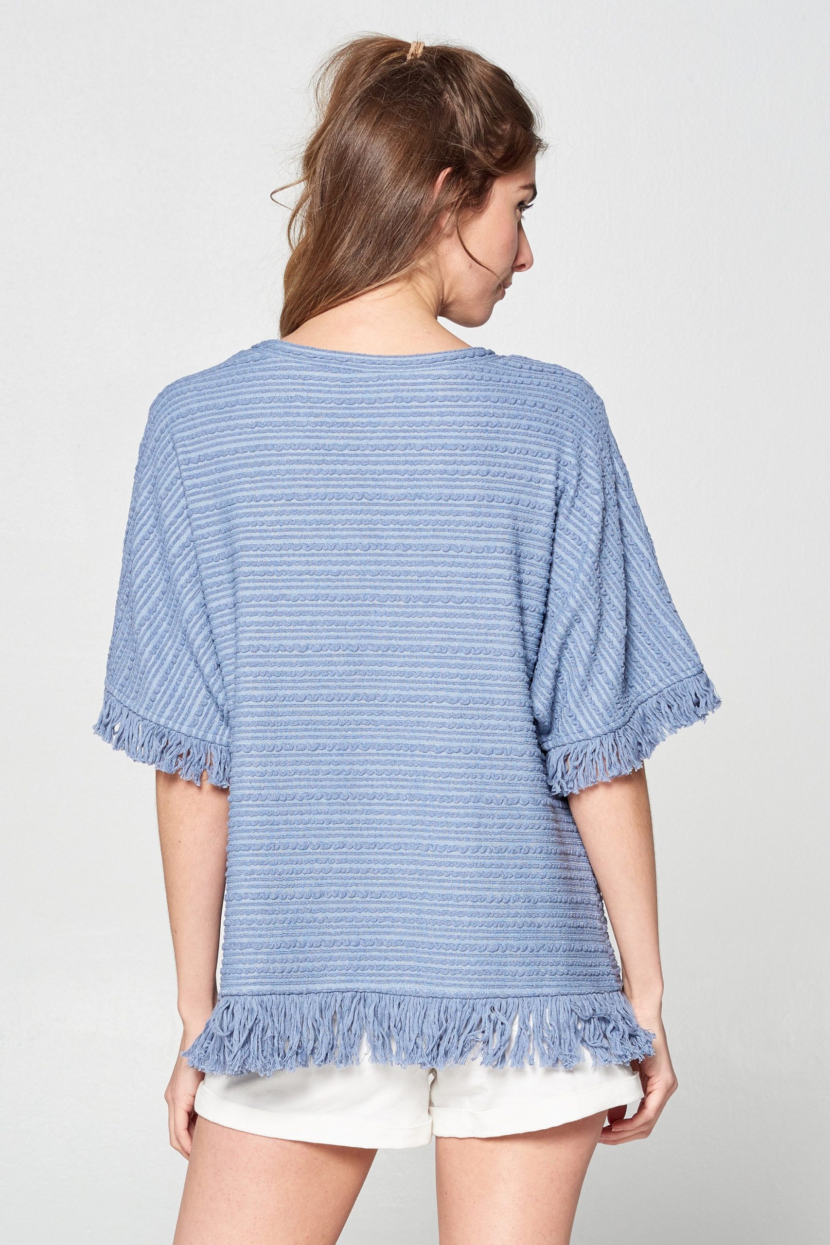 Boho Fringe Knit Top Short Sleeve Round Neck