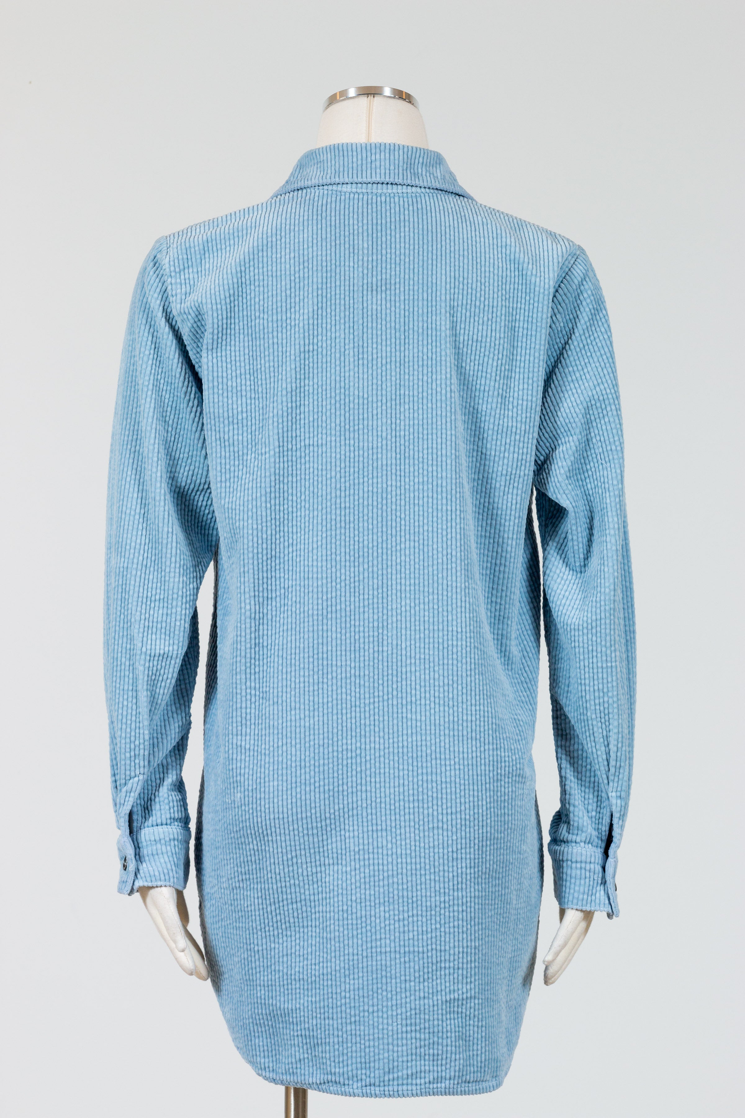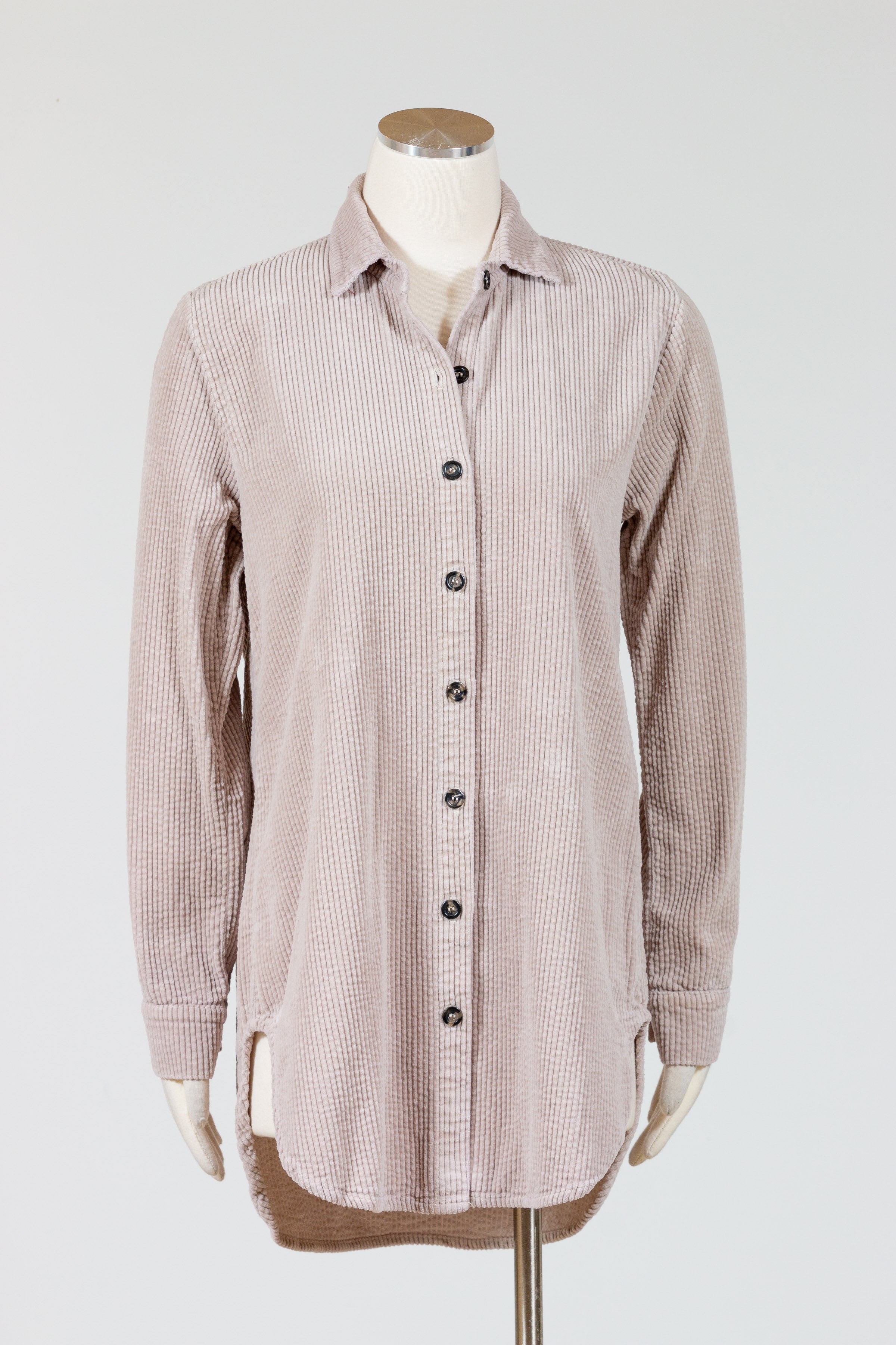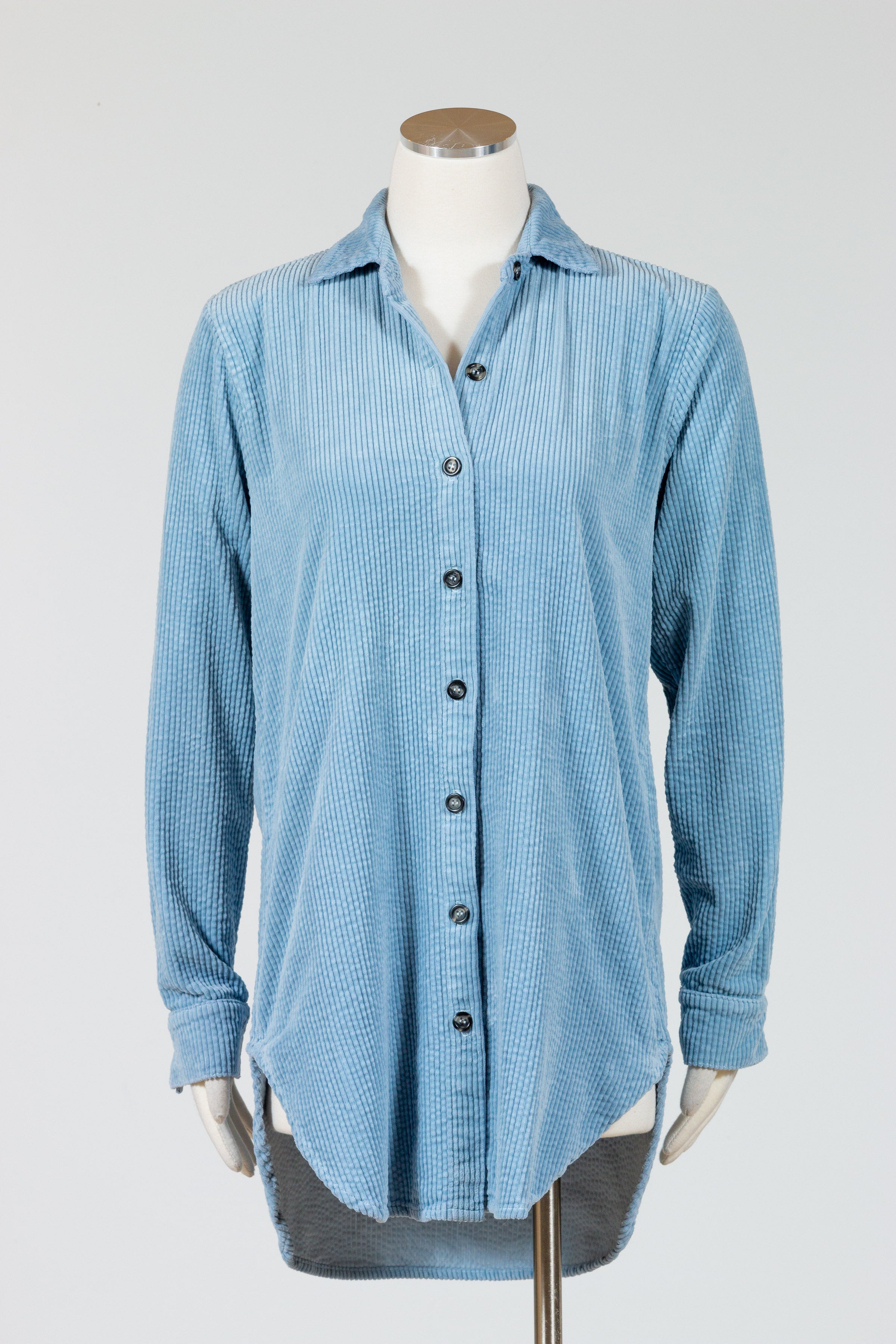 Cut Loose’s Corduroy Long Shirt is offered in a wide wale corduroy with a collared neck and full-length sleeves. Its straight silhouette falls below the hips and features a curved hemline, longer in the back. This shirt button ups in front with buttoned cuffs, perfect as a standalone or layered over another shirt. No pockets to distract from its cool, easy style.