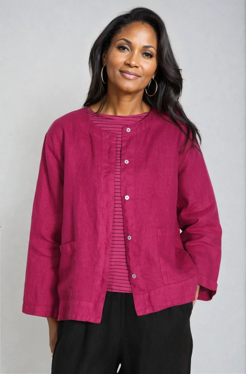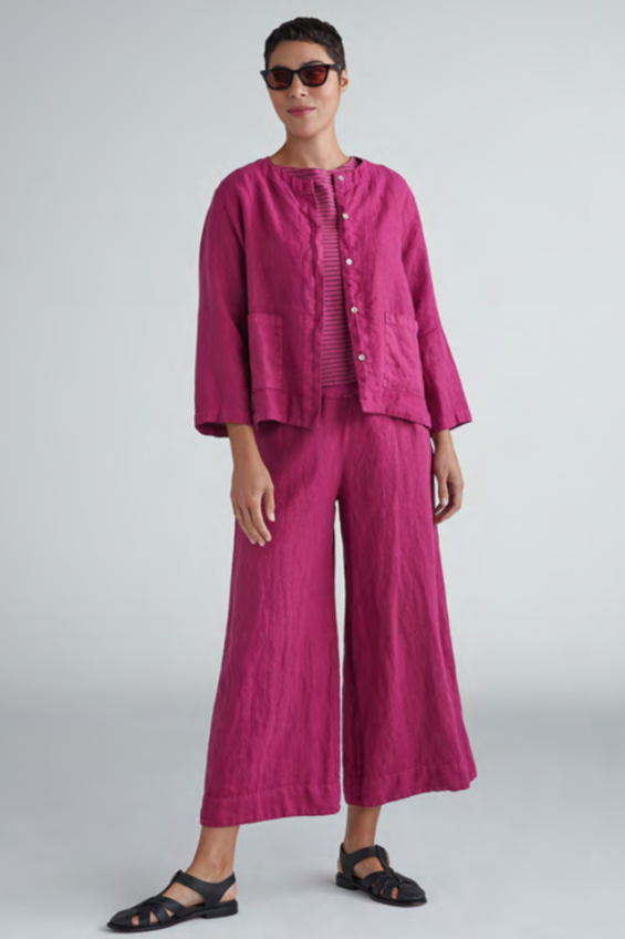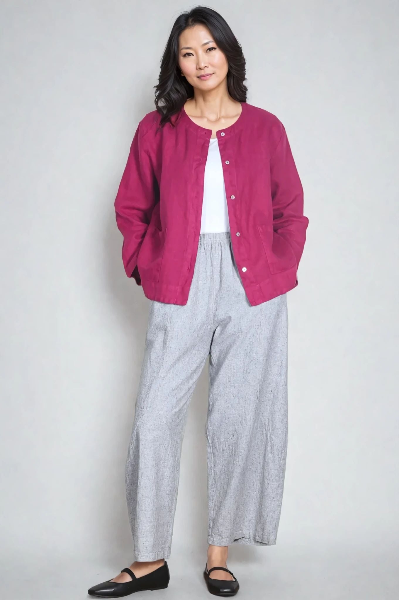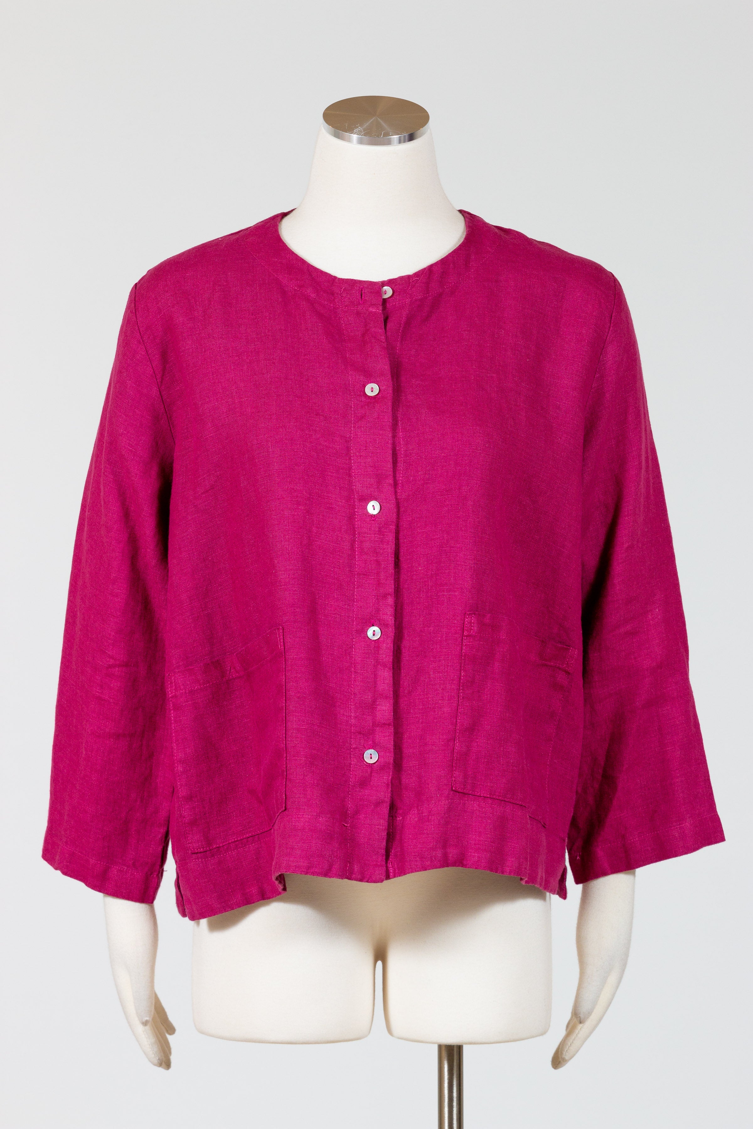The Cropped Jacket from Cut Loose features a button front and collarless design with bracelet length sleeves, providing excellent coverage for cooler days. Its bold color and lightweight woven linen construction is complemented by elegant Mother of Pearl buttons, giving it a casual and timeless look. Falls just over the tops of the hips. Two front patch pockets.Â