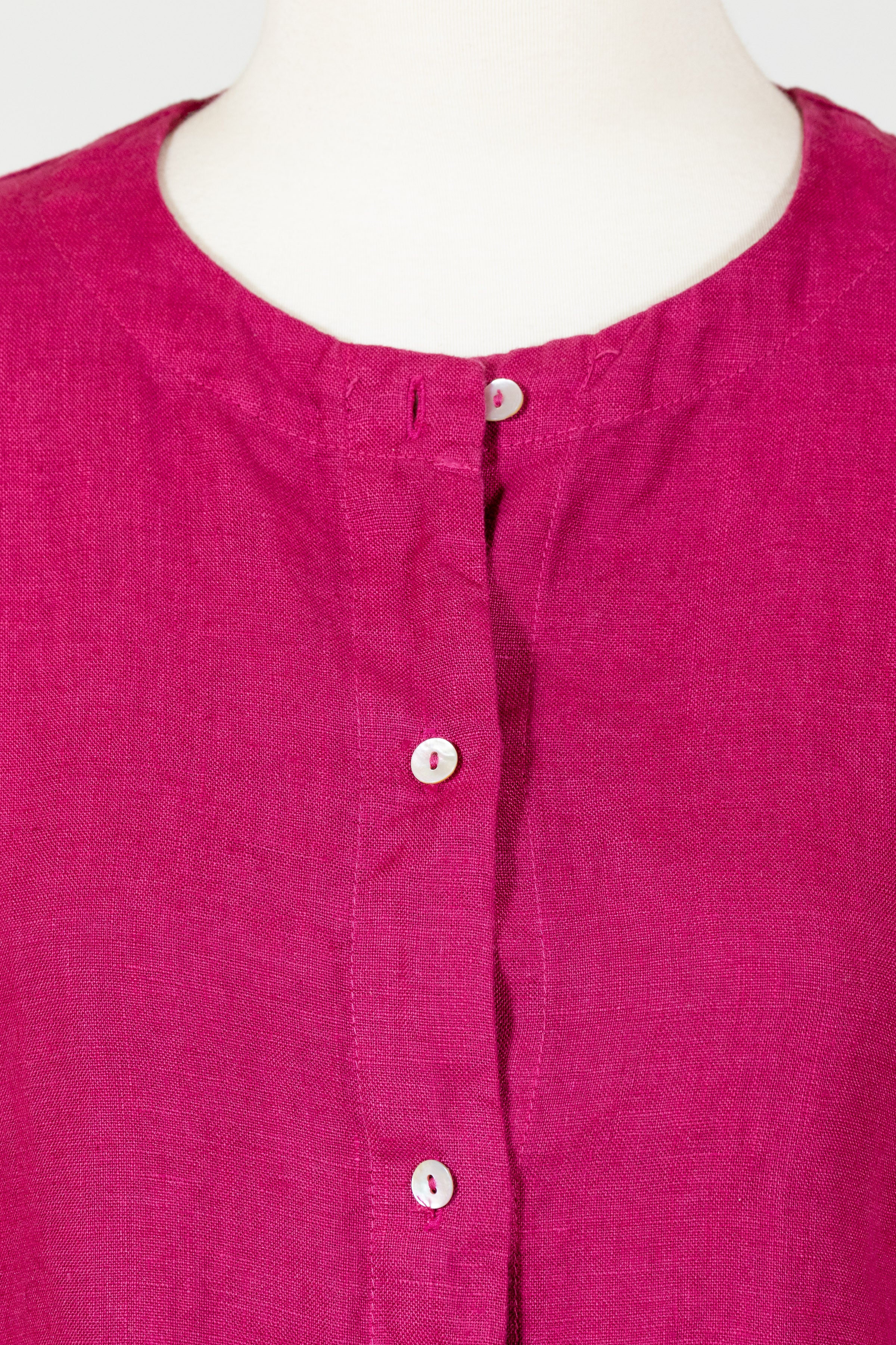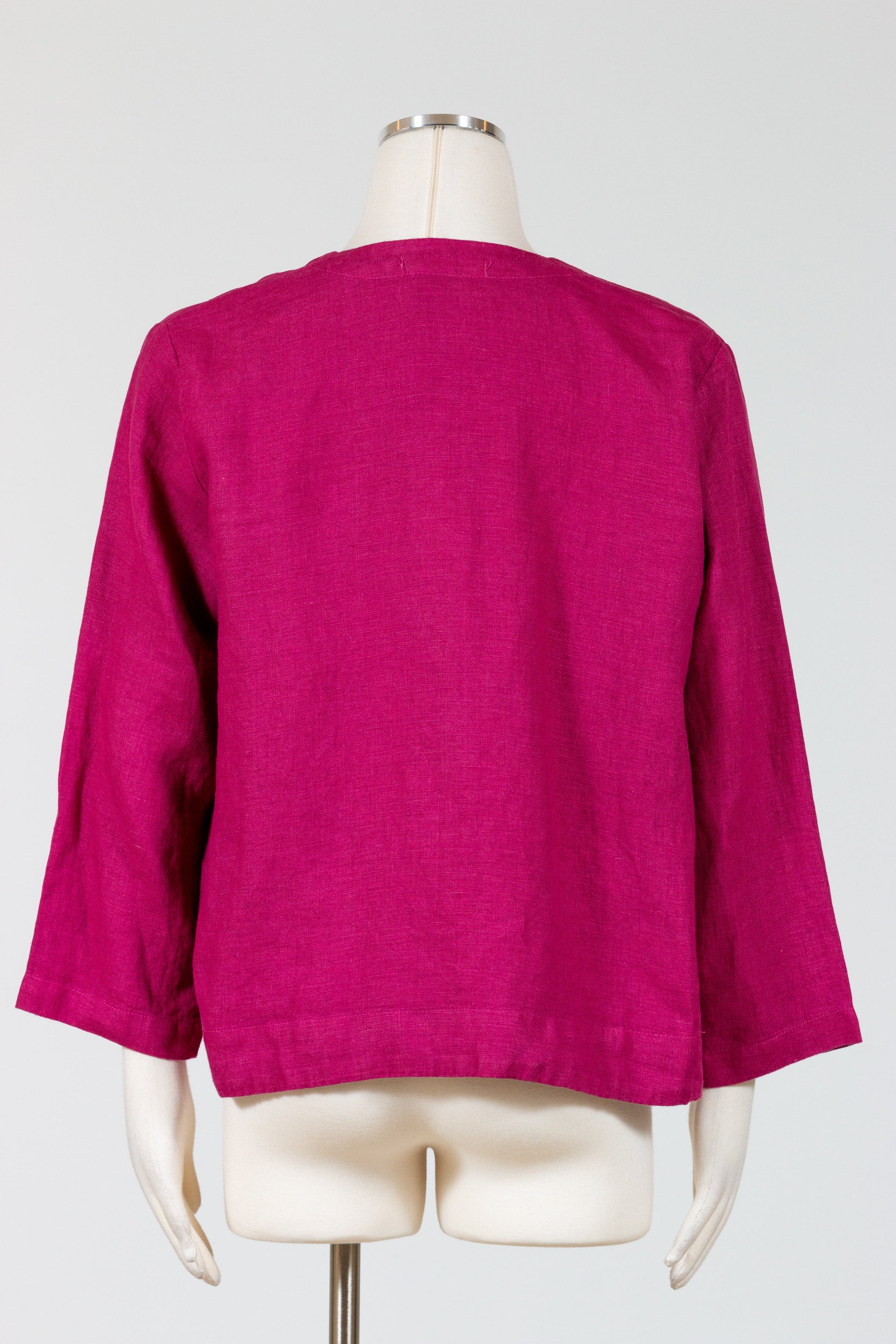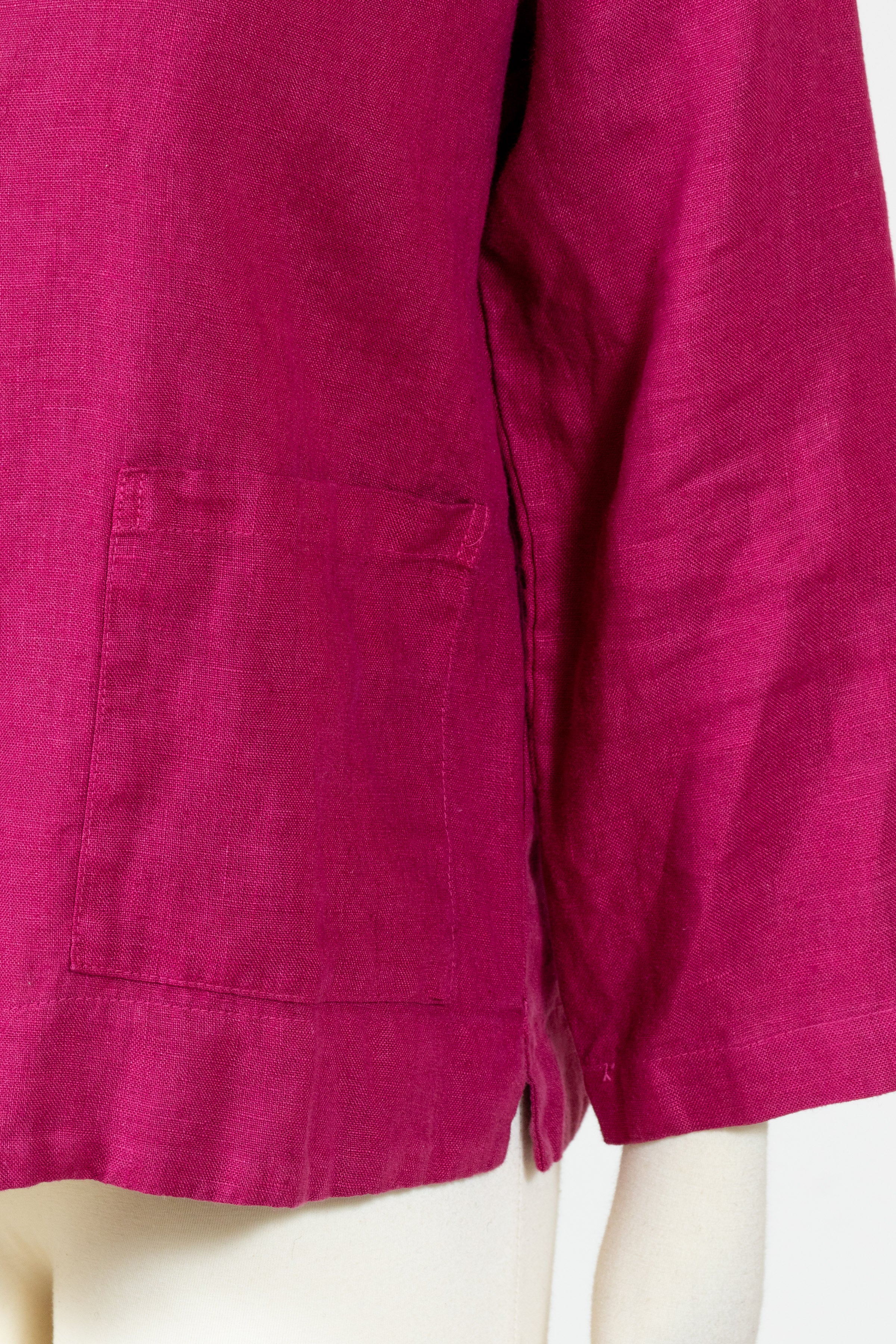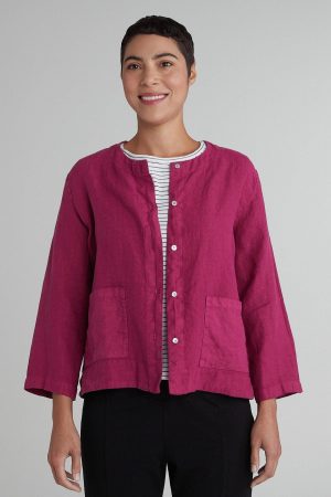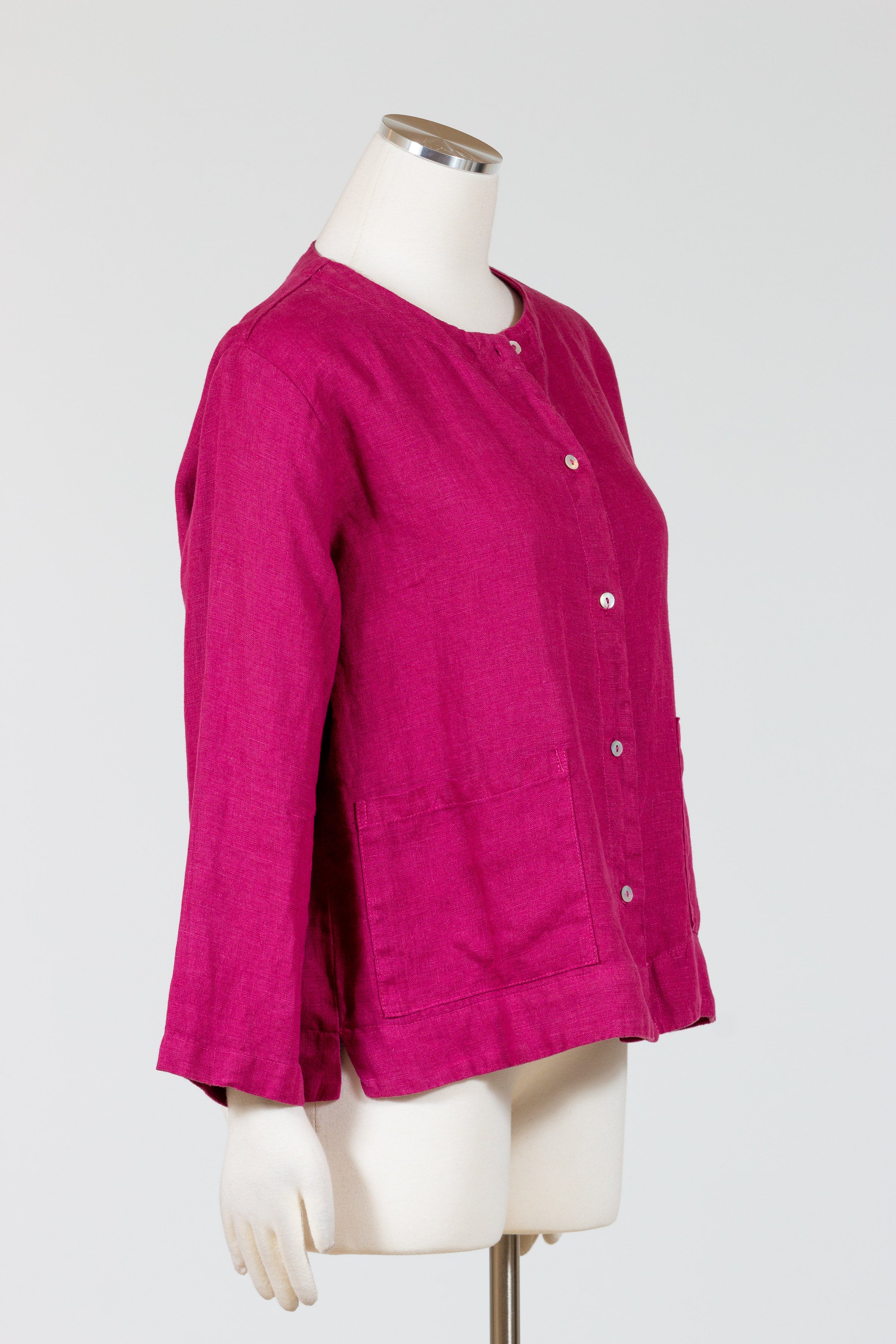 The Cropped Jacket from Cut Loose features a button front and collarless design with bracelet length sleeves, providing excellent coverage for cooler days. Its bold color and lightweight woven linen construction is complemented by elegant Mother of Pearl buttons, giving it a casual and timeless look. Falls just over the tops of the hips. Two front patch pockets.Â