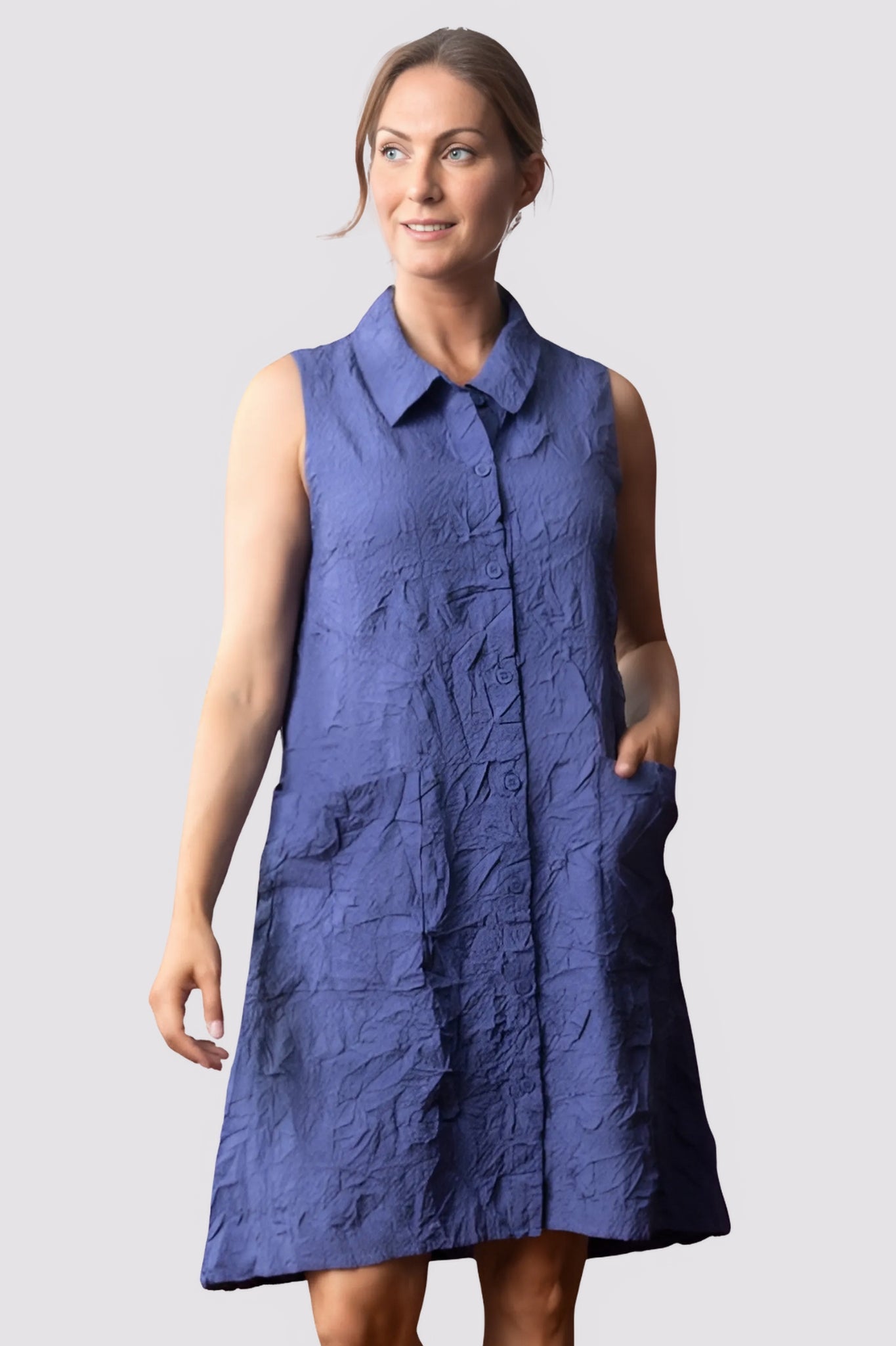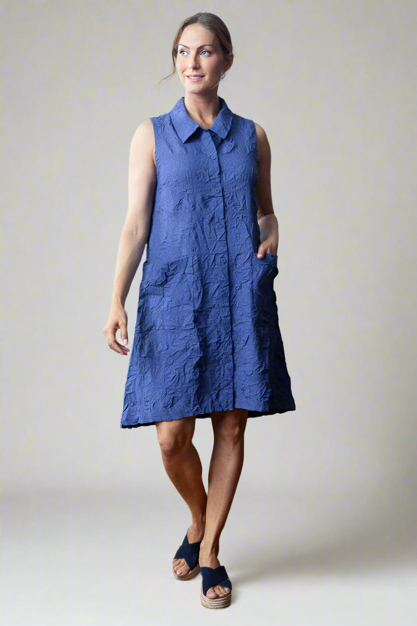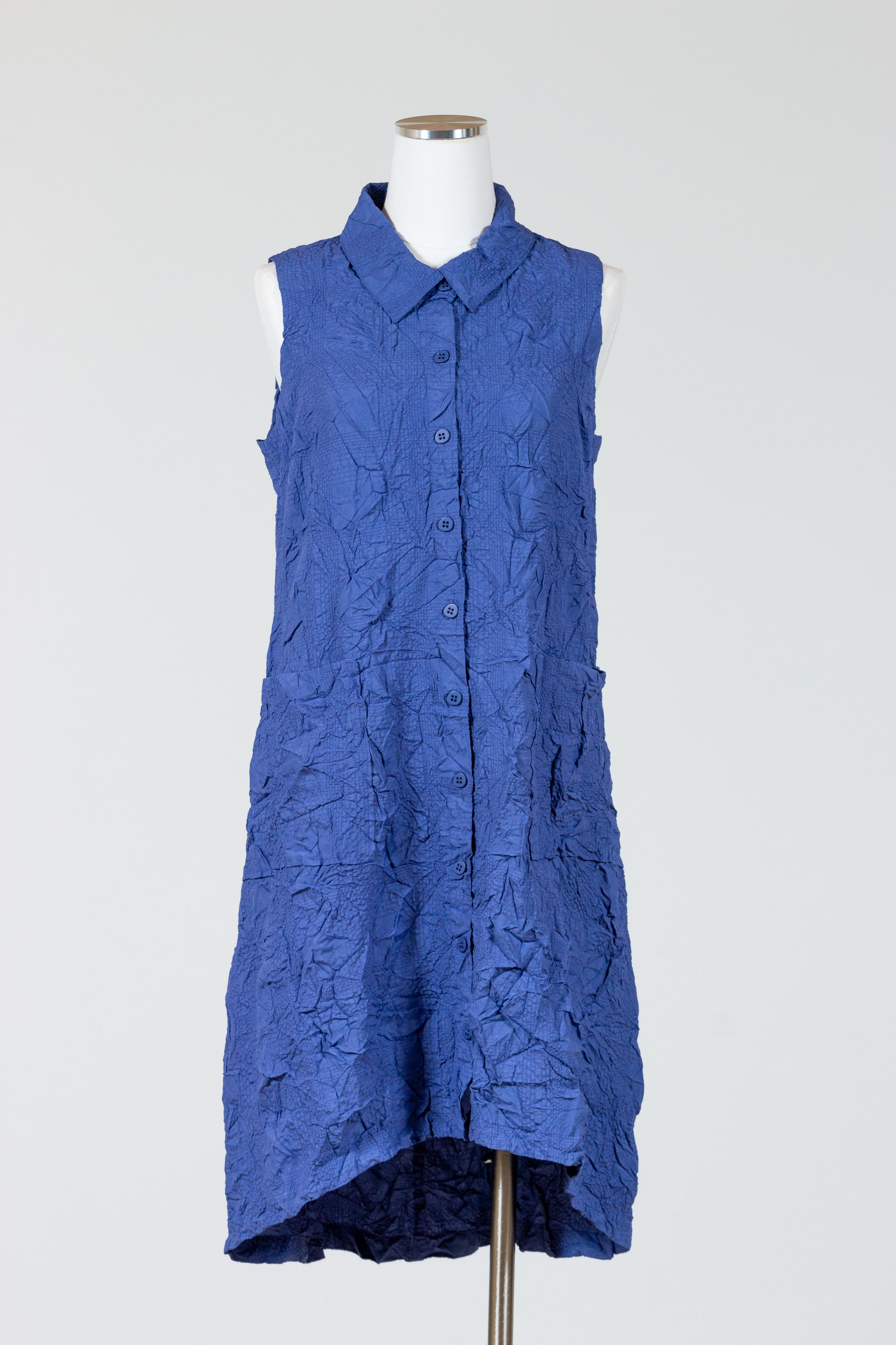 Olivia by Habitat’s Crush Hi-Lo Pocket Dress is a sleeveless, collared, shirtdress made with a soft crushed puckered fabric. This dress offers an easy and comfortable fit with a relaxed silhouette. Buttons down the front with tonal buttons, and features two front patch pockets. Crushed fabric has a tonal windowpane stripe for texture. Falls about knee length on most, a little longer in the back. Add it to your collection today!