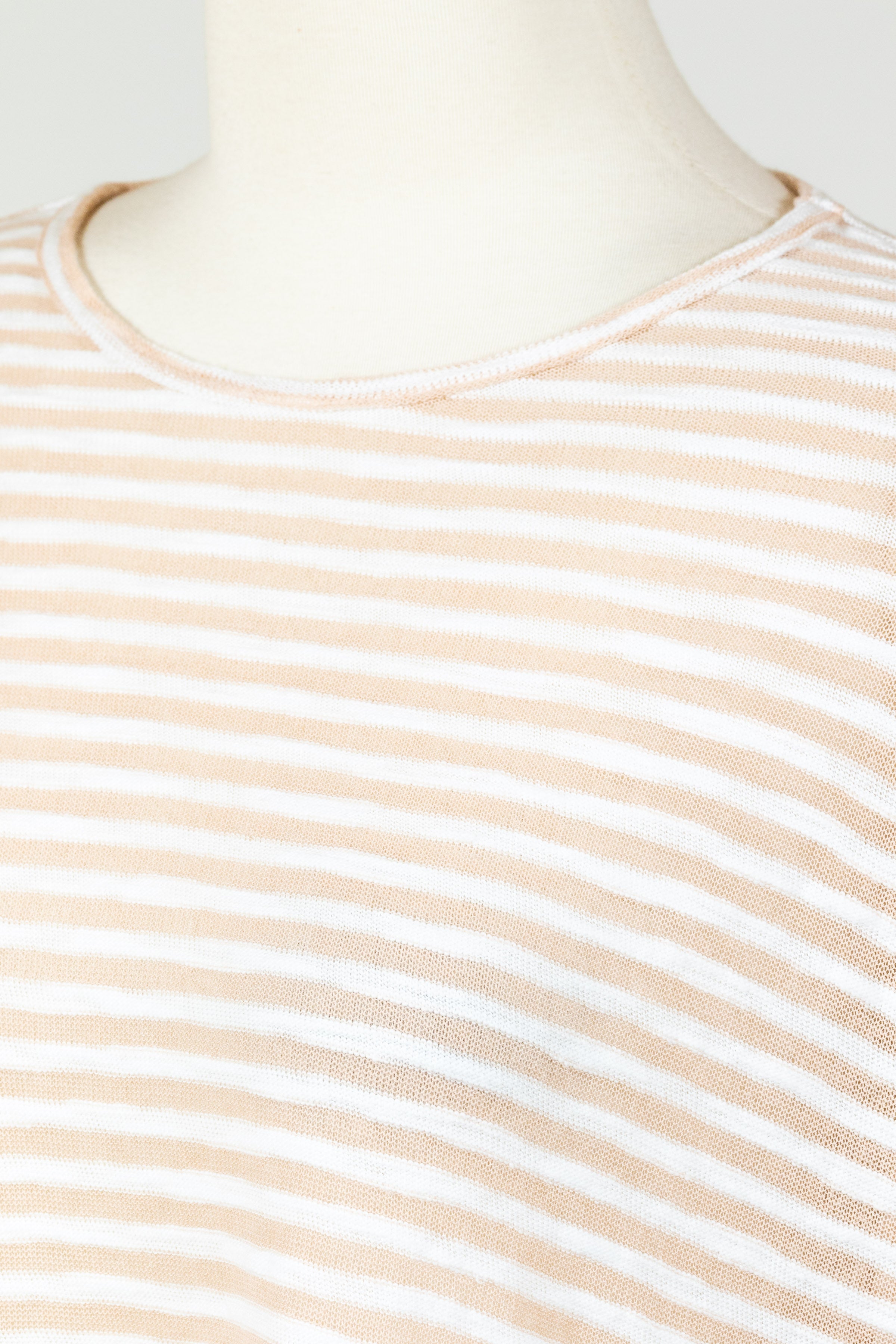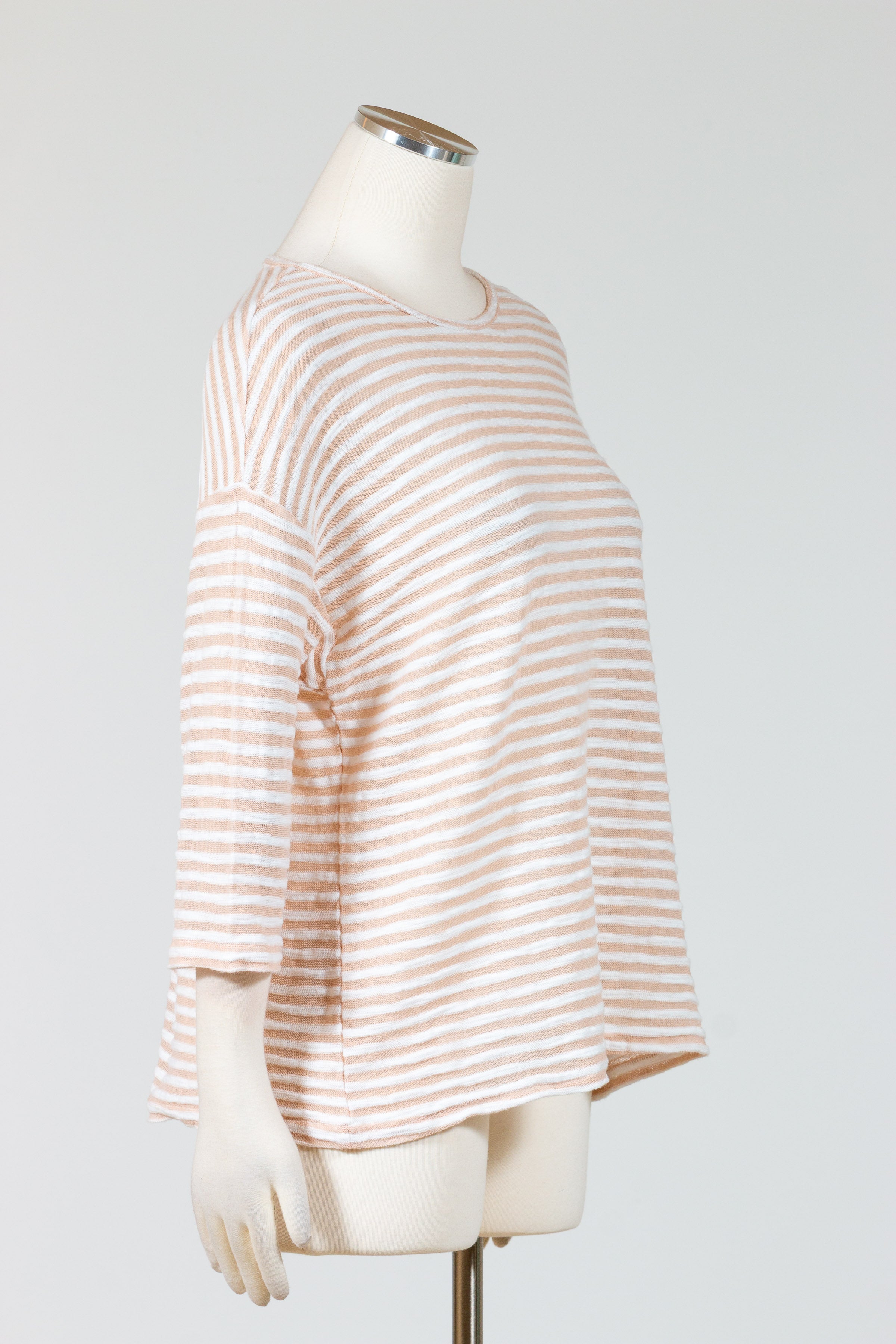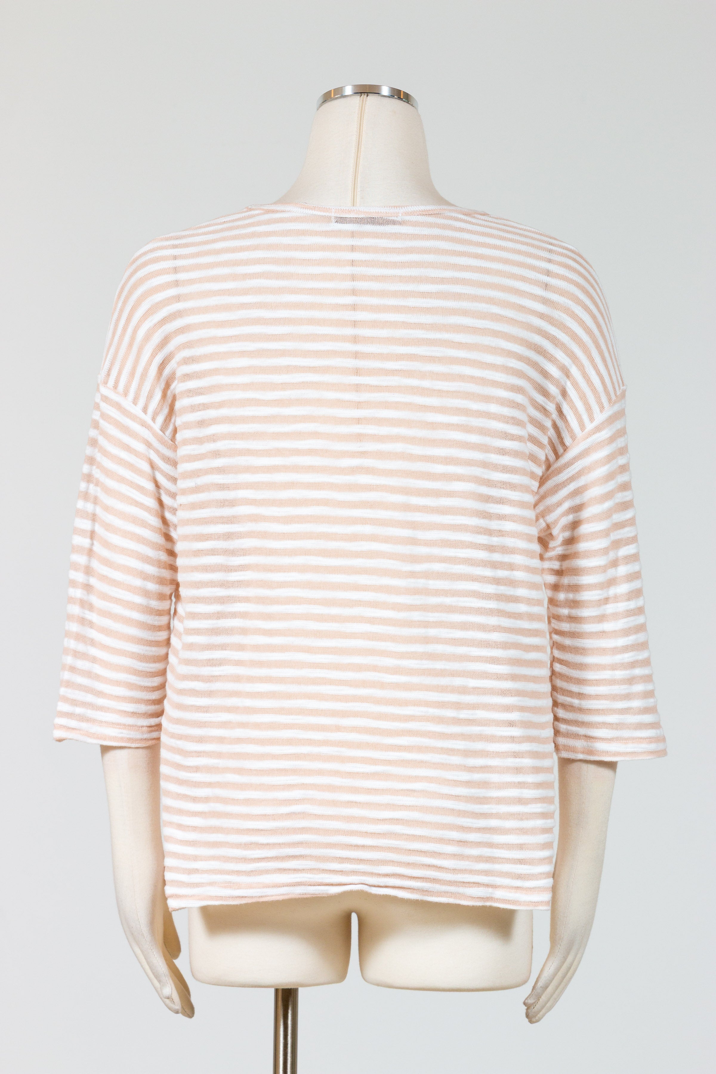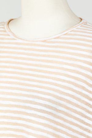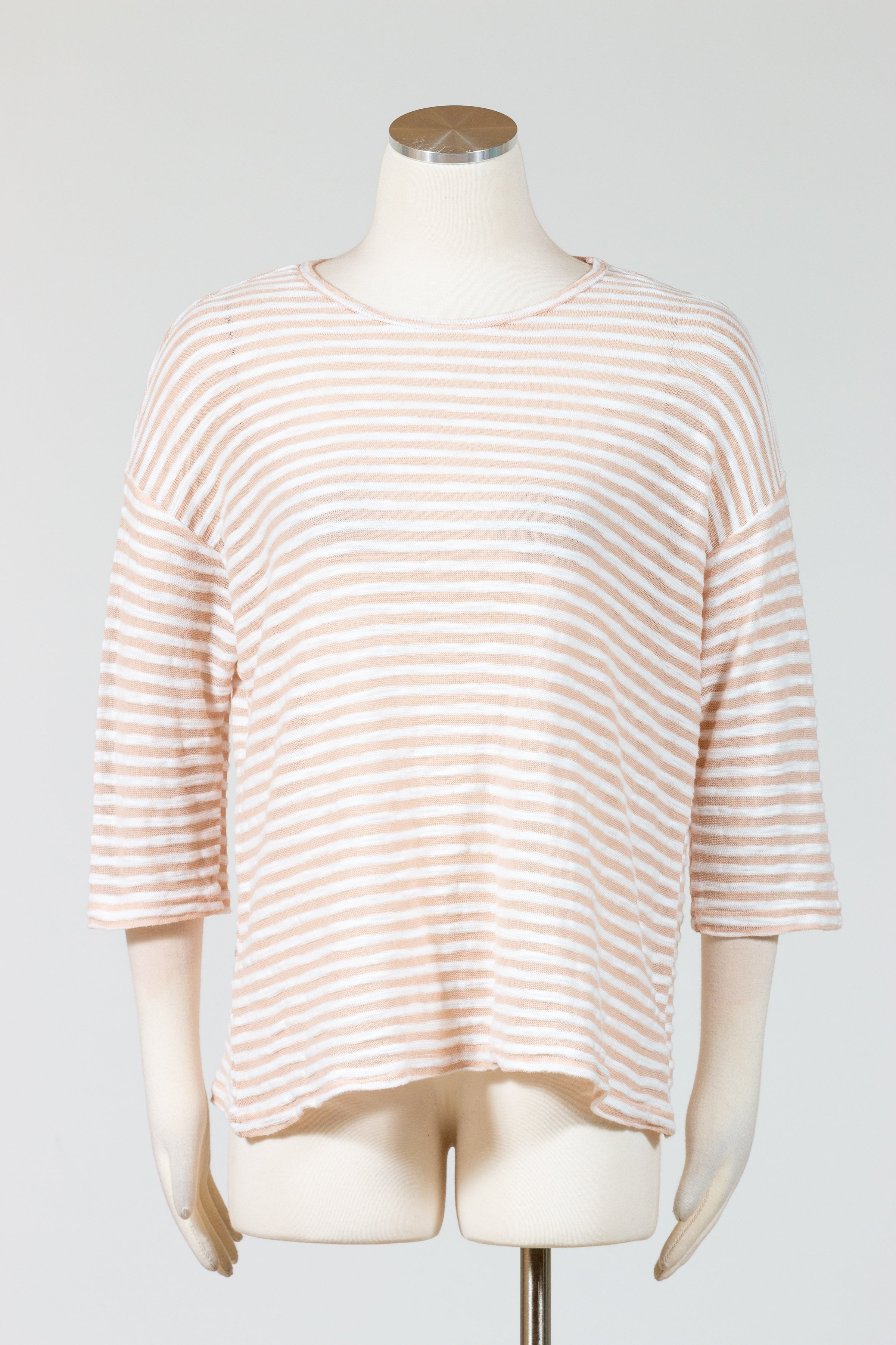 Experience the ultimate summer staple with Cut Loose’s Drop Shoulder Tee! This striped tee is expertly crafted from a burnout stretch knit material, making it a must-have for the sunny season. Featuring a crew neckline, three quarter length sleeves, and a relaxed fit, it falls just over the waist for a flattering drape. Don’t wait to add this essential piece to your spring/summer wardrobe! Offered in white and burnout tan stripes.Â