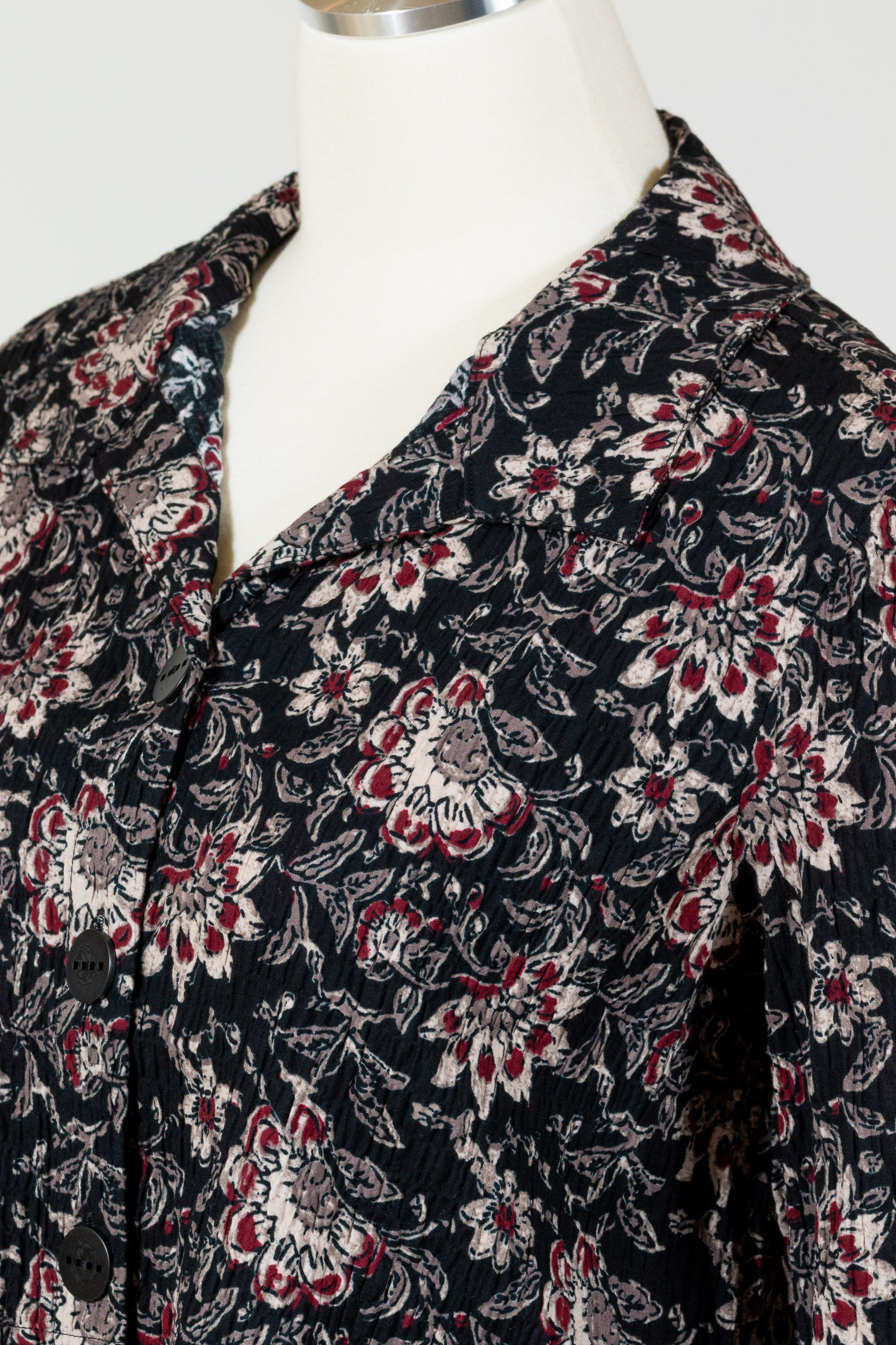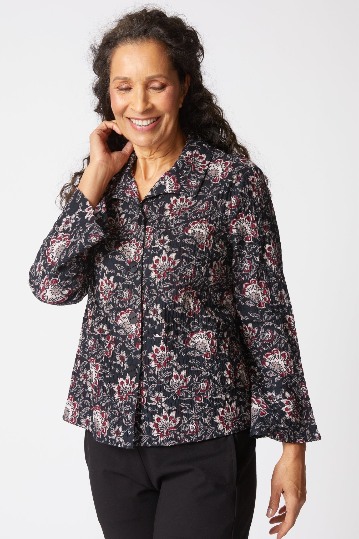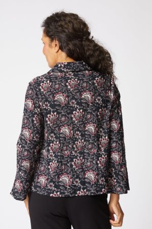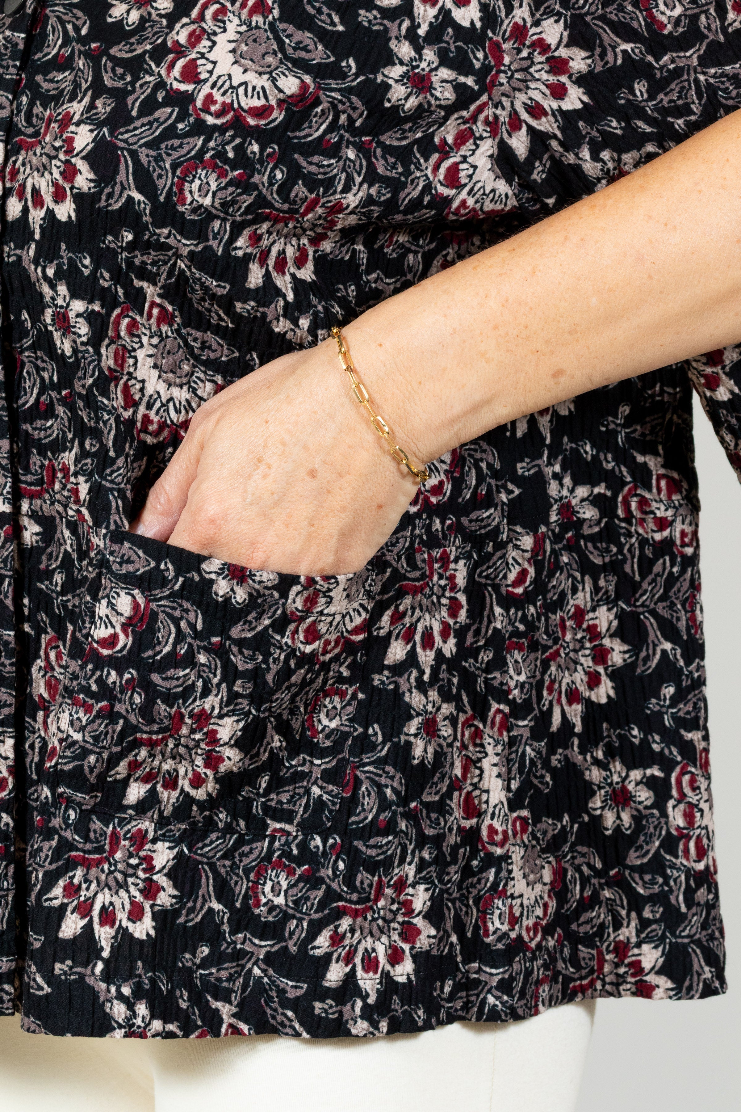Feminine and versatile, Habitat’s Flounce Jacket is crafted from puckered cotton in a delicate floral block print. Designed with a slightly flared shape and curved hemline that flatters the hips, this lightweight layer features charming ruffled cuffs for a touch of softness and style. Wear it buttoned as a shirt or open as a casual jacket — a timeless piece that effortlessly blends ease and elegance. Front patch pockets. Offered in a black base with tan, beige and burgandy flowers.Â