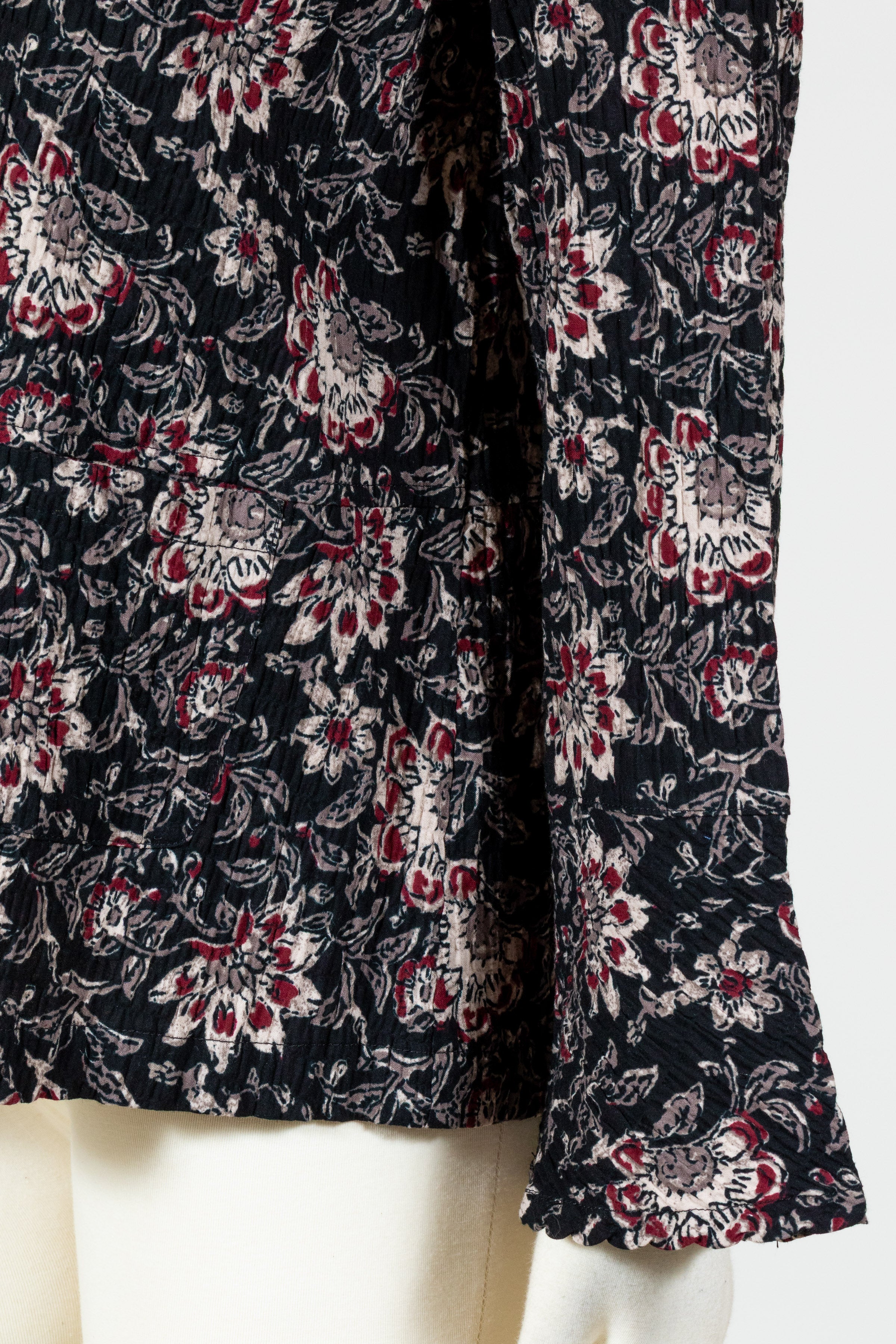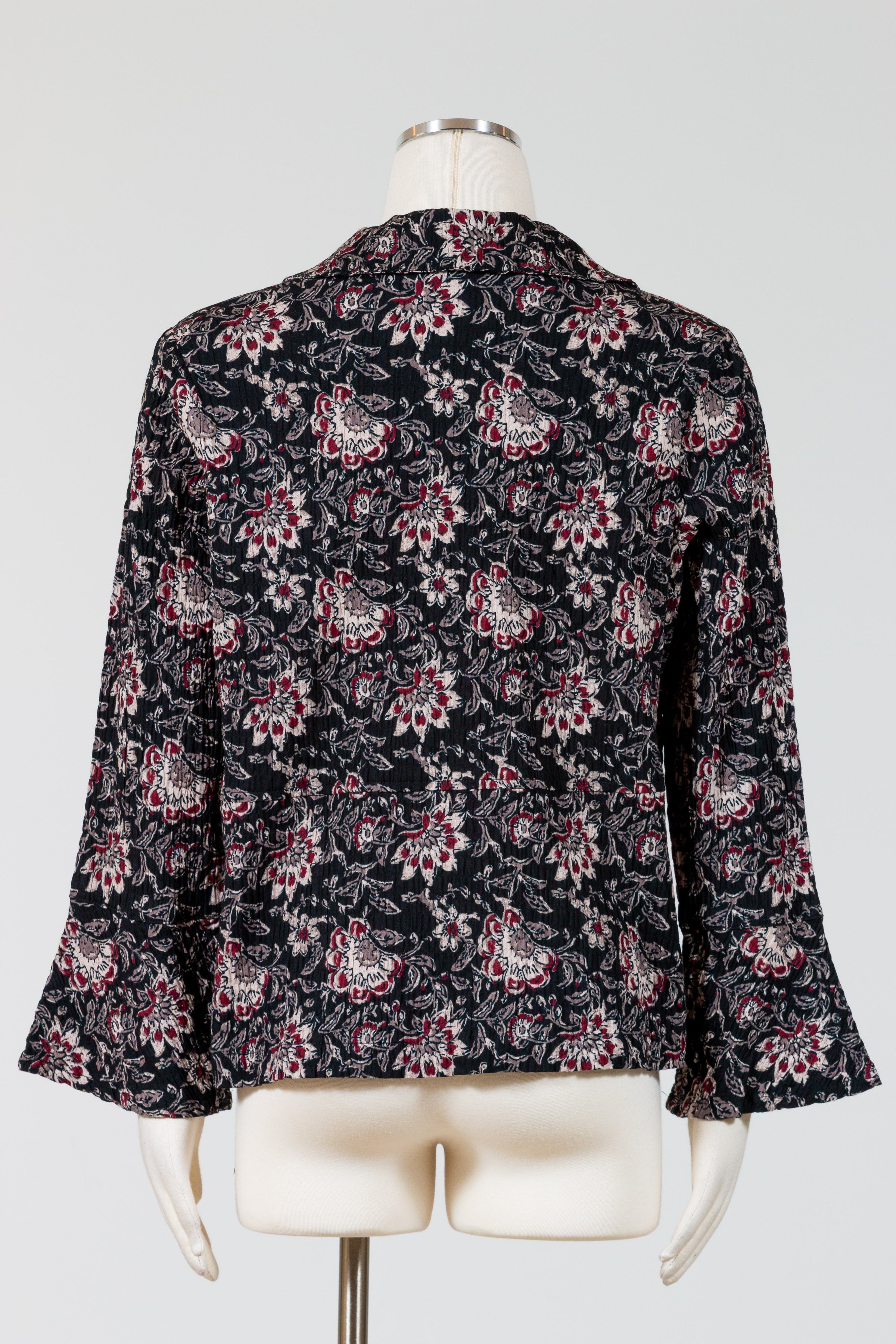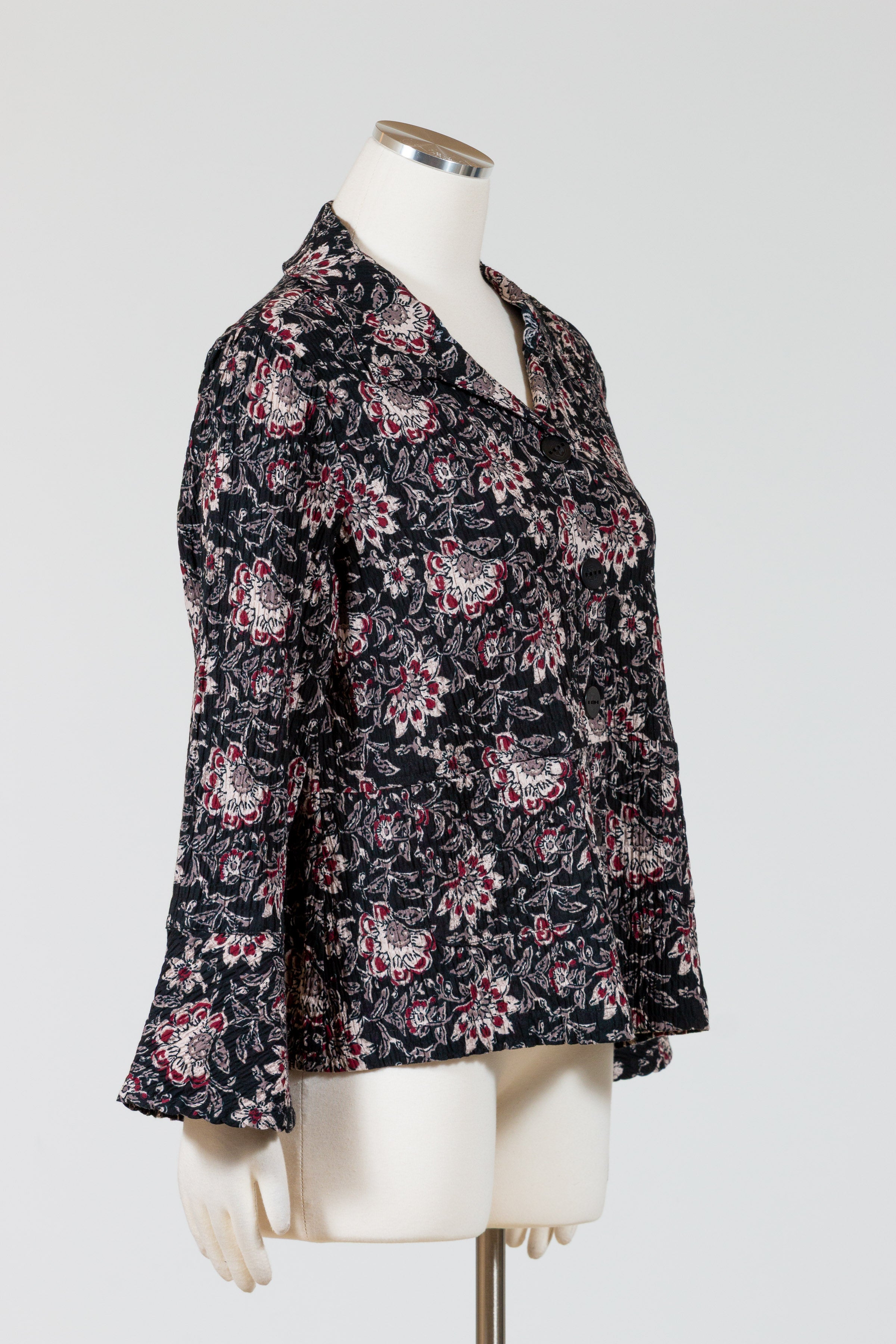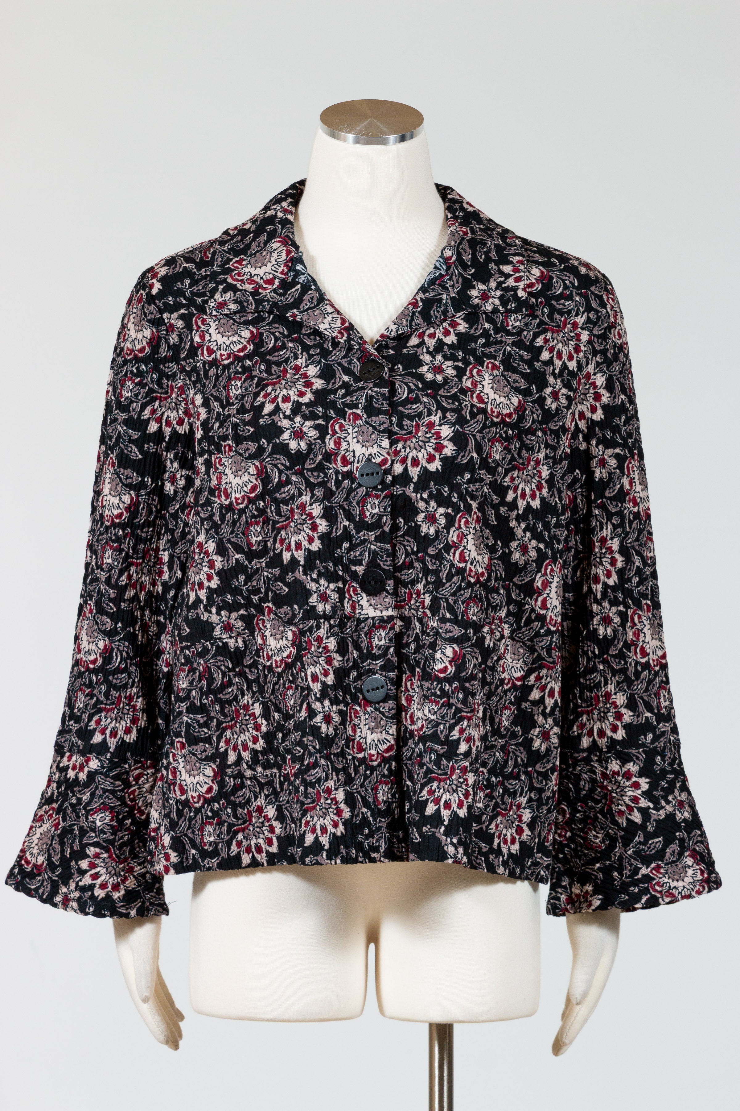 Feminine and versatile, Habitat’s Flounce Jacket is crafted from puckered cotton in a delicate floral block print. Designed with a slightly flared shape and curved hemline that flatters the hips, this lightweight layer features charming ruffled cuffs for a touch of softness and style. Wear it buttoned as a shirt or open as a casual jacket — a timeless piece that effortlessly blends ease and elegance. Front patch pockets. Offered in a black base with tan, beige and burgandy flowers.Â