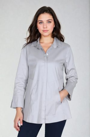 Habitat’s Hidden Placket Shirt is a relaxed button down collared shirt, streamlined with a hidden button placket. Made of a stretch woven cotton shirting fabric for a very comfortable feel.  Sleeves are three-quarter length with a banded slit cuff that can be worn folded up or left down for length. Falls well over hips to be worn untucked. Curved hemline. Angled front seaming with invisible on-seam front pockets.  Â