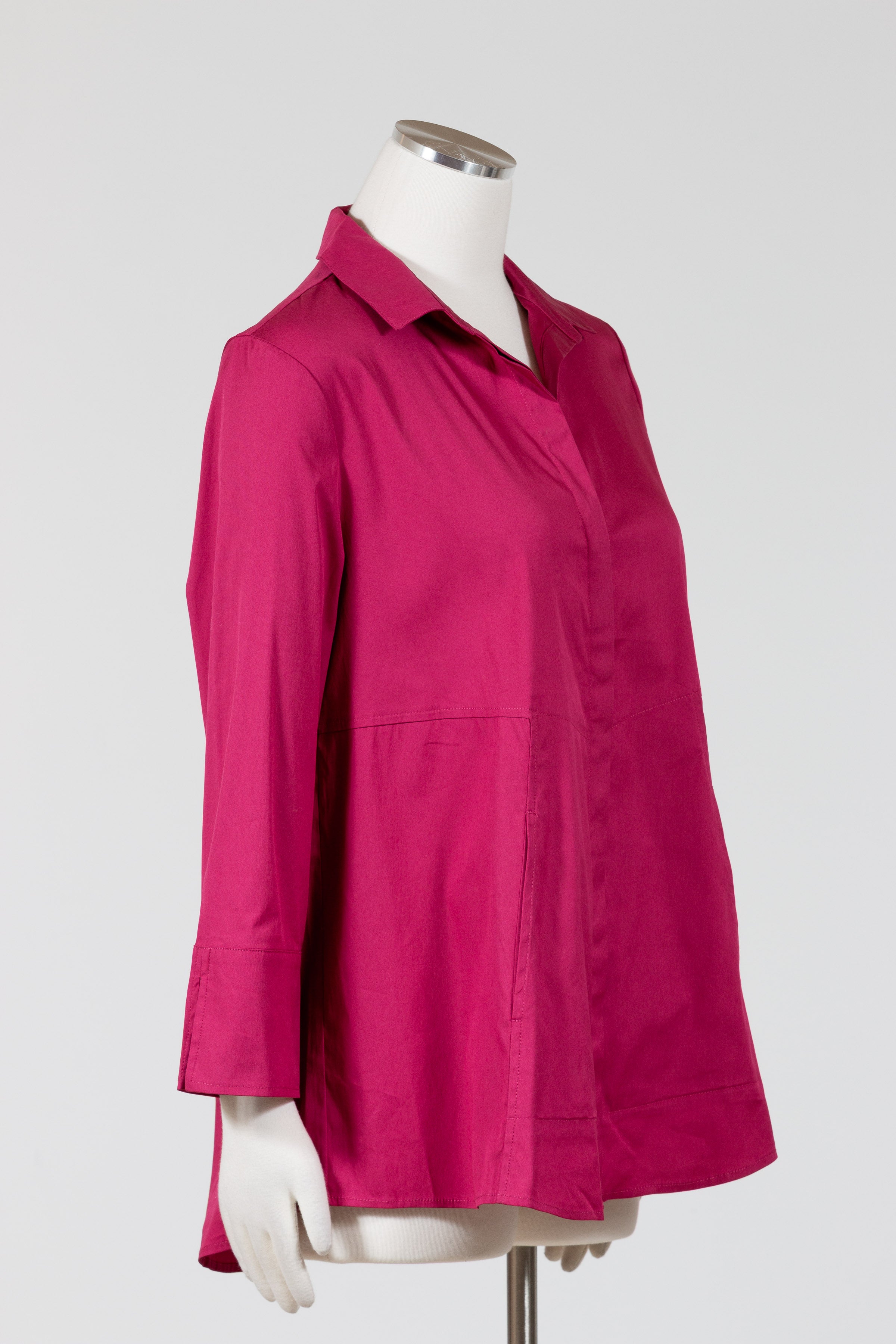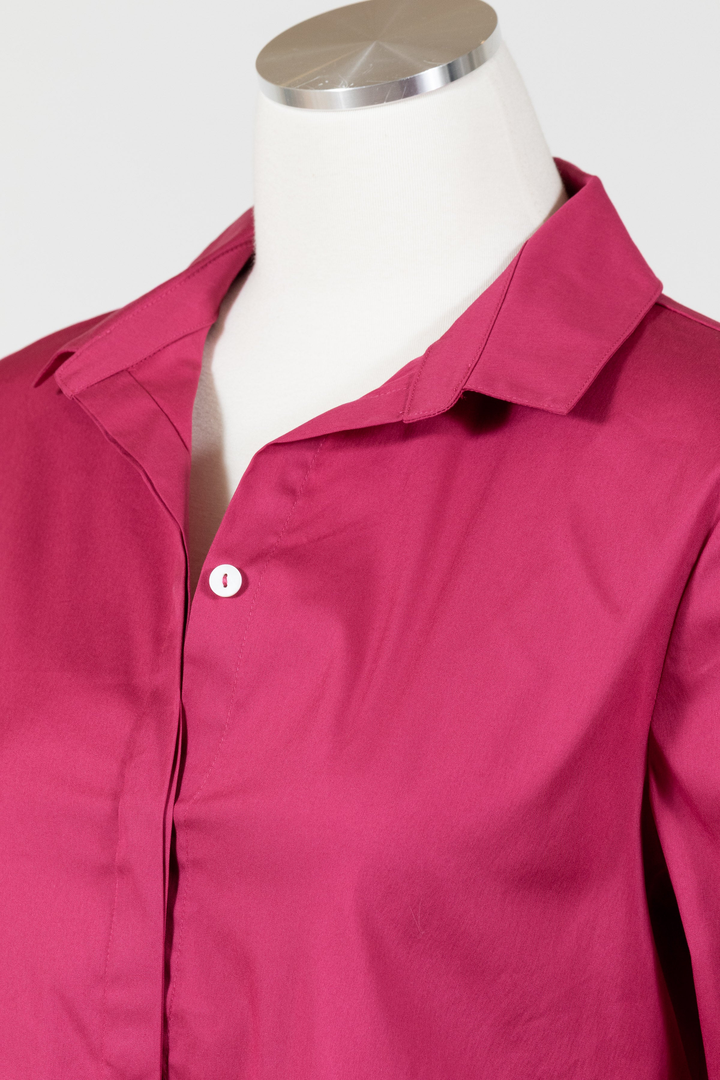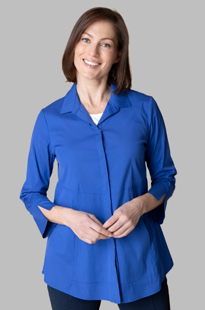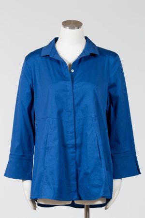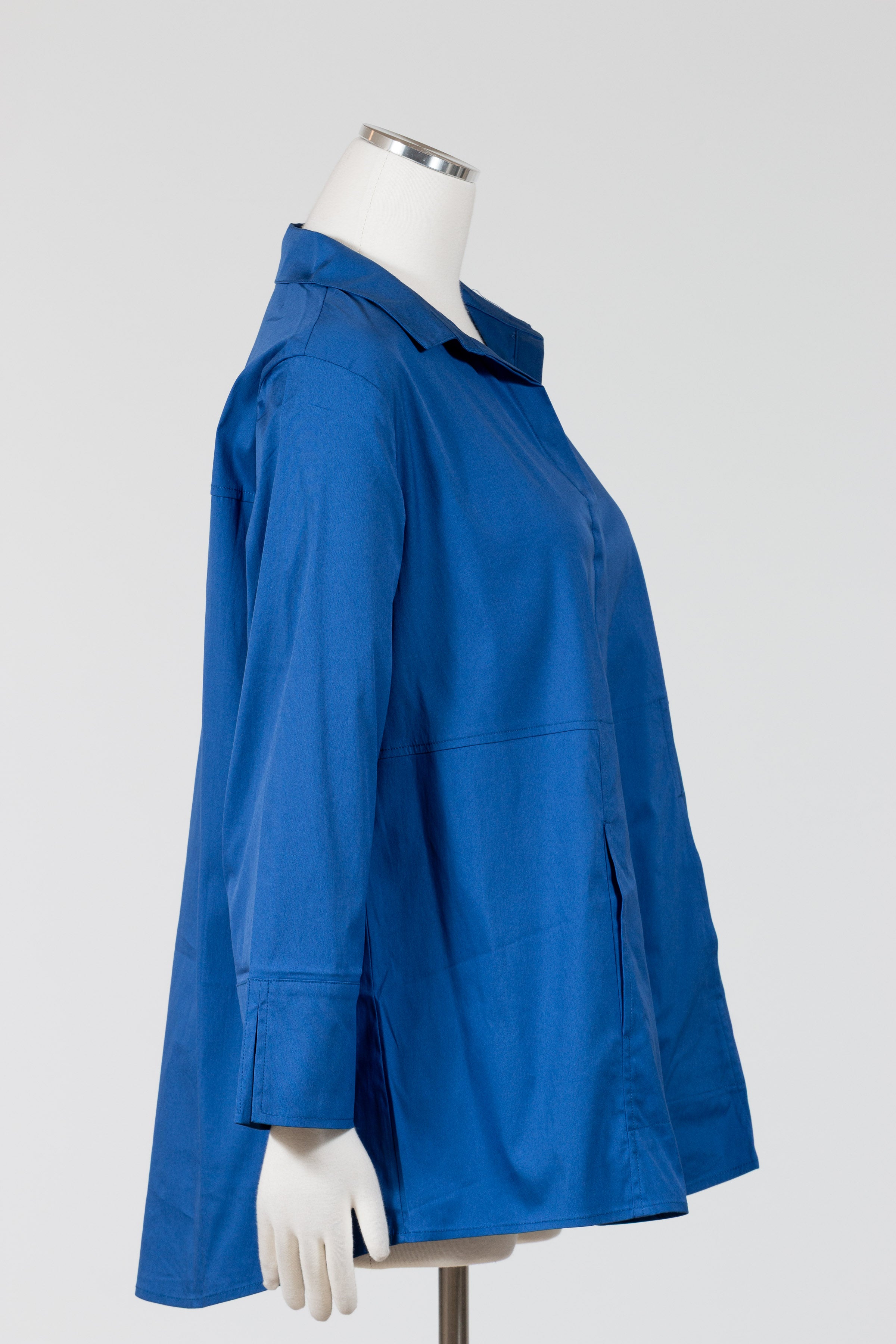 Habitat’s Hidden Placket Shirt is a relaxed button down collared shirt, streamlined with a hidden button placket. Made of a stretch woven cotton shirting fabric for a very comfortable feel. Sleeves are three-quarter length with a banded slit cuff that can be worn folded up or left down for length. Falls well over hips to be worn untucked. Curved hemline. Angled front seaming with invisible on-seam front pockets.  Â