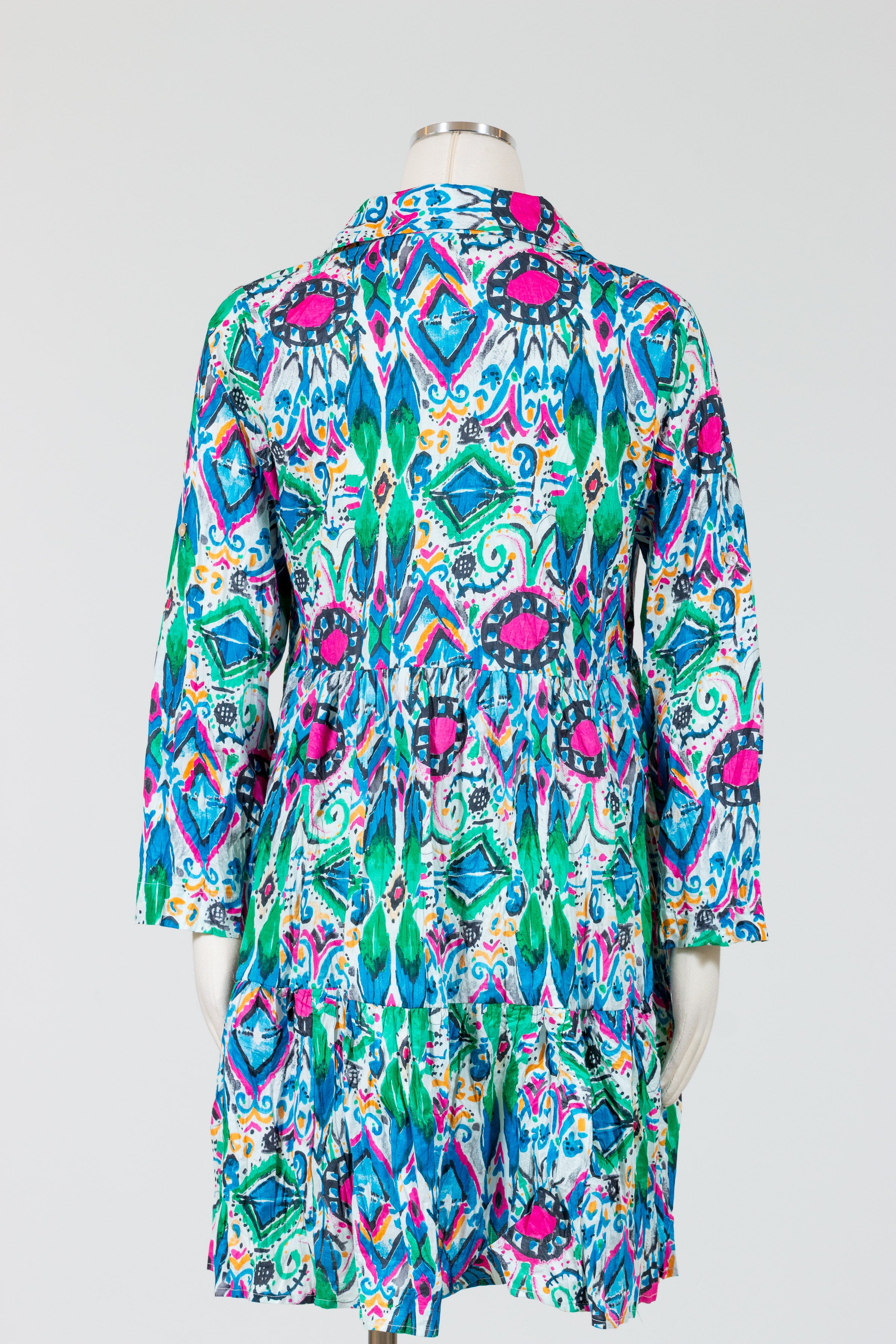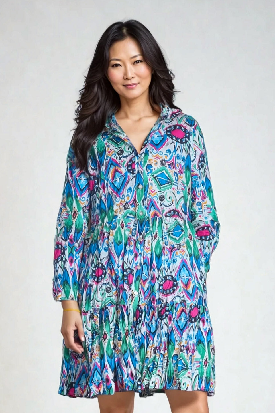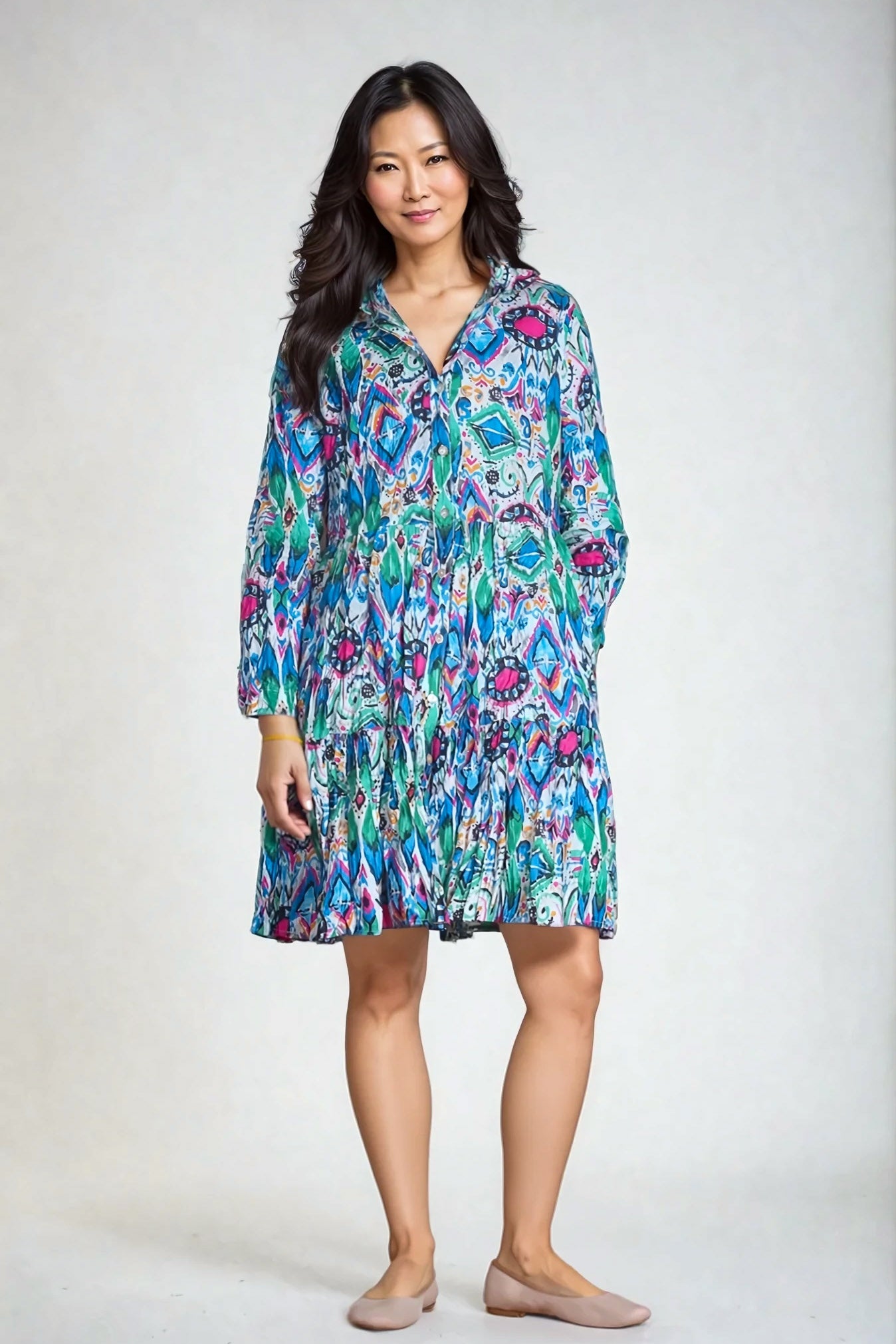 Dress Addict’s June Dress, a stunningly bold, crinkled woven cotton dress featuring a front button closure and a dress shirt style. Its long sleeves and full skirt with cascading tiers create a flowing, eye-catching silhouette. The vibrant Aztec style print adds a colorful flourish, while the relaxed dress falls gracefully above the knee. Stay stylish and functional with two convenient side pockets.