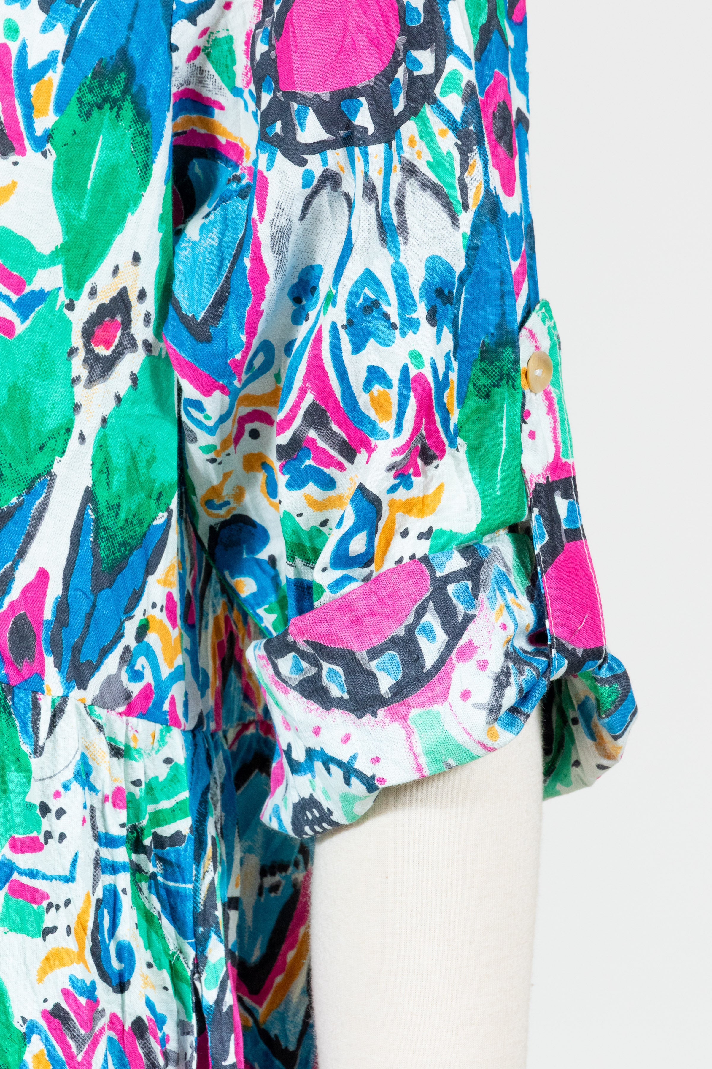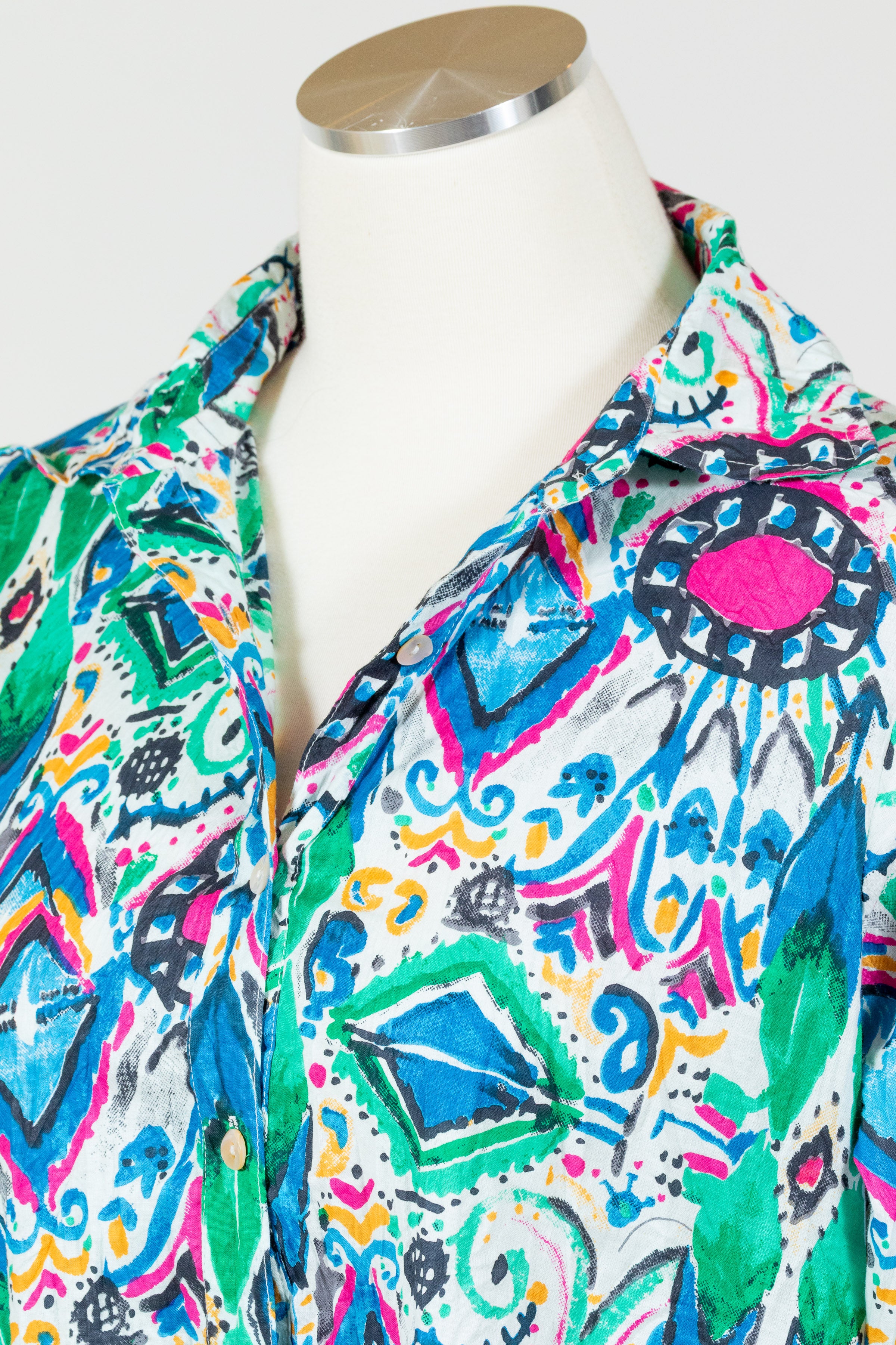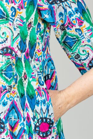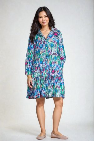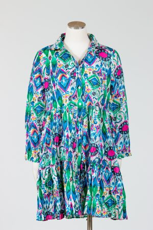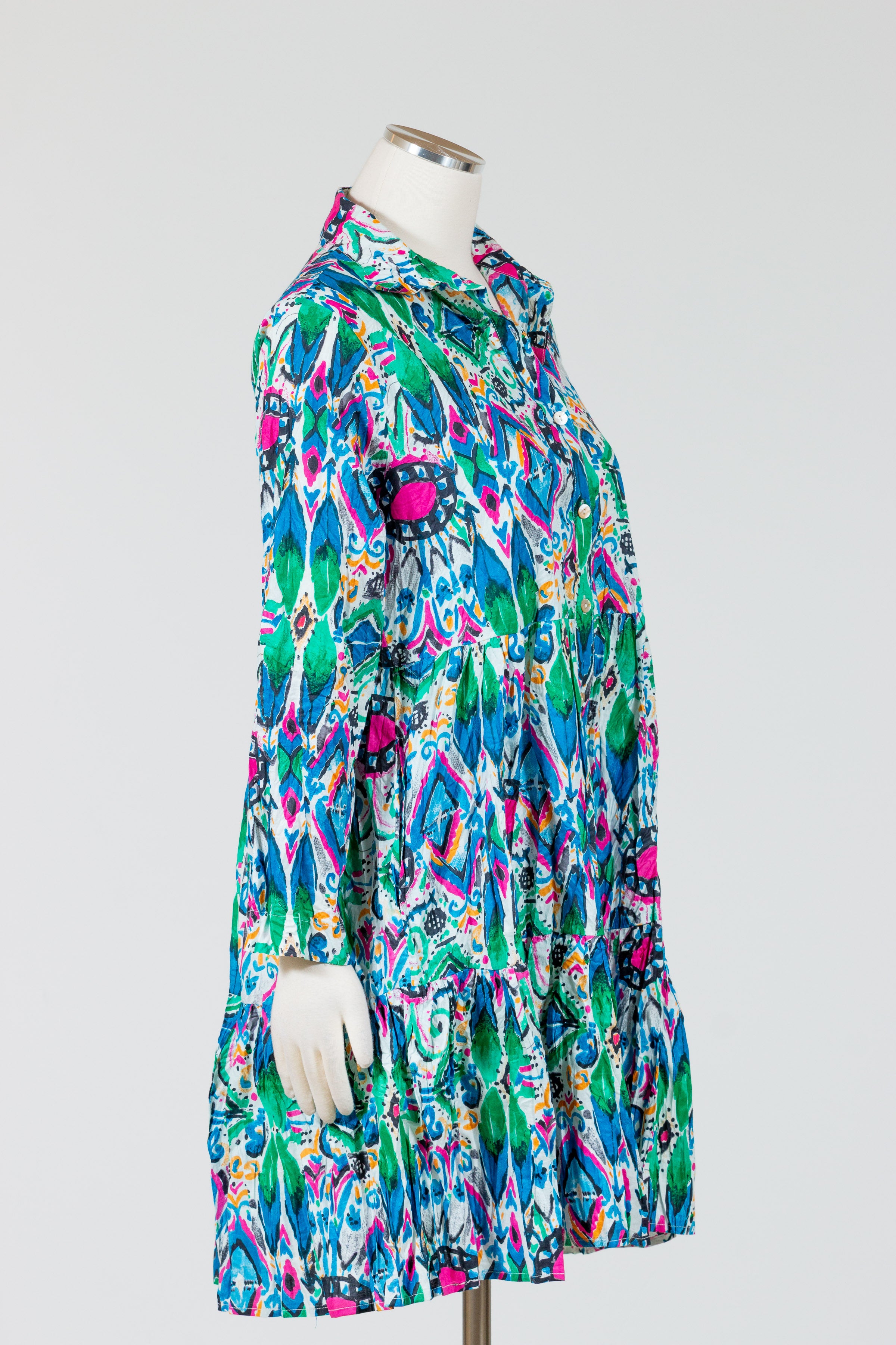 Dress Addict’s June Dress, a stunningly bold, crinkled woven cotton dress featuring a front button closure and a dress shirt style. Its long sleeves and full skirt with cascading tiers create a flowing, eye-catching silhouette. The vibrant Aztec style print adds a colorful flourish, while the relaxed dress falls gracefully above the knee. Stay stylish and functional with two convenient side pockets.