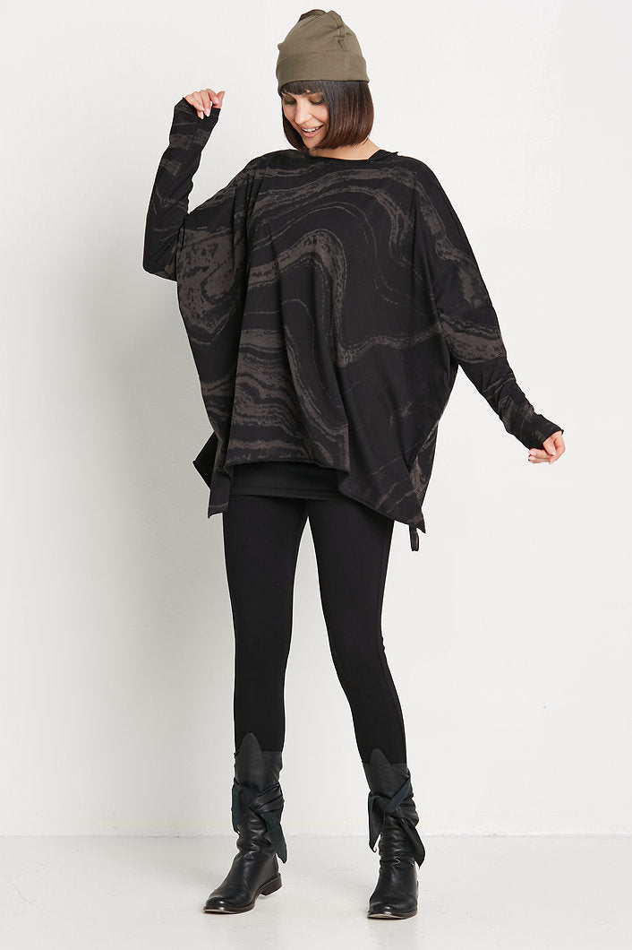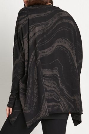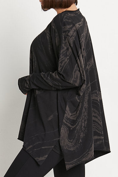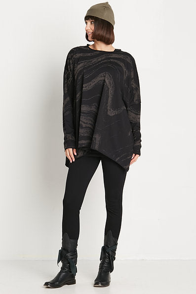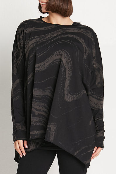 PLANET by Lauren G. Marble Crew Swing is a novelty T that is both fun and sophisticated. Features a crew neckline and a wide, boxy shape with side slits at the seam. Made from a stretchy cotton knit, it has long dropped sleeves that fit snugly for scrunching, and a wide, open bottom hemline. This top falls over the hips for a relaxed fit and is finished with raw cut edges and no pockets. Offered in a Marble print of black and a warm charcoal.Â
