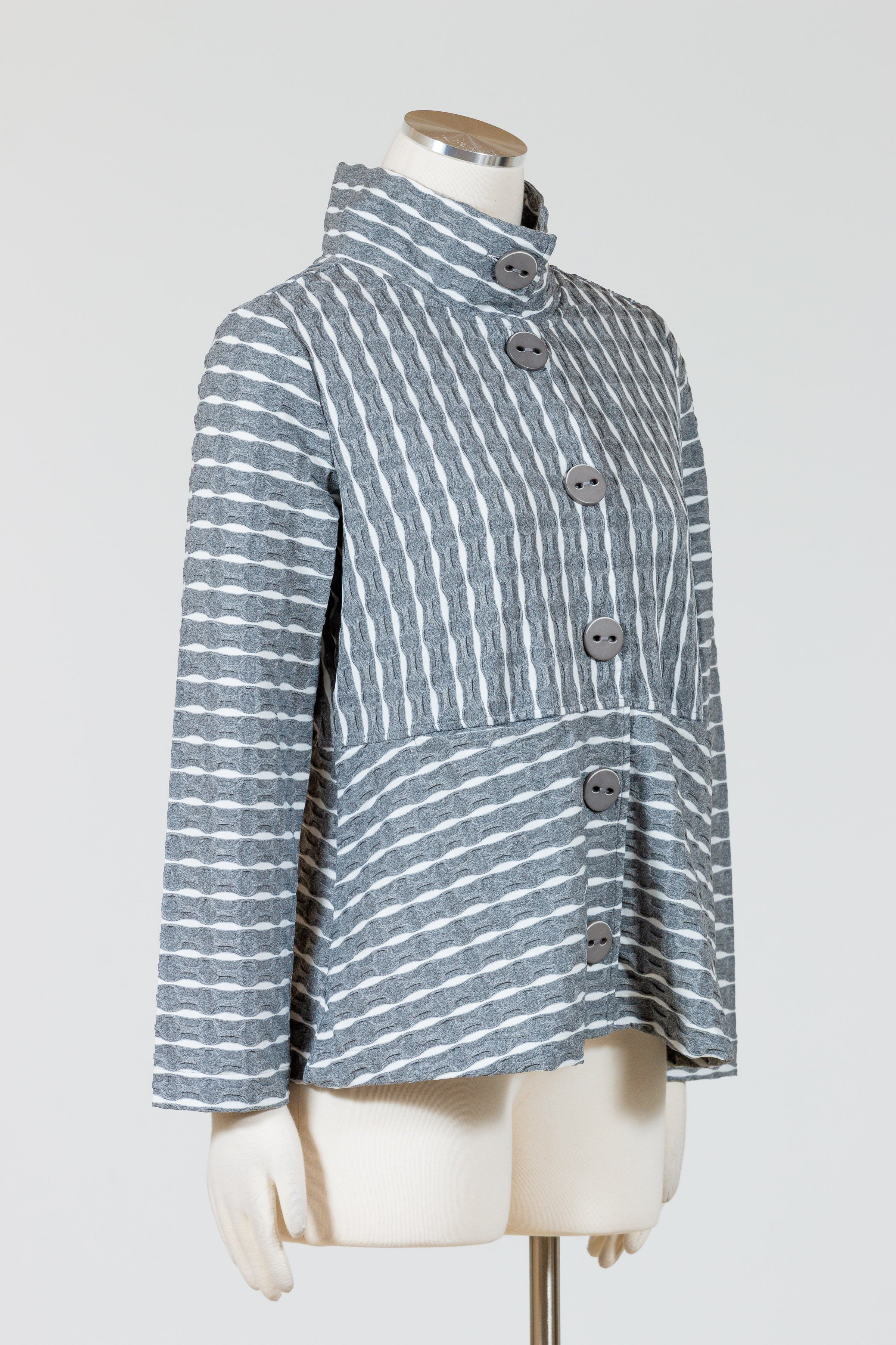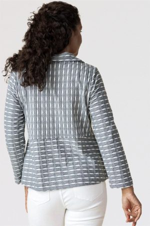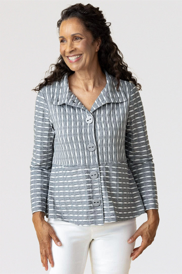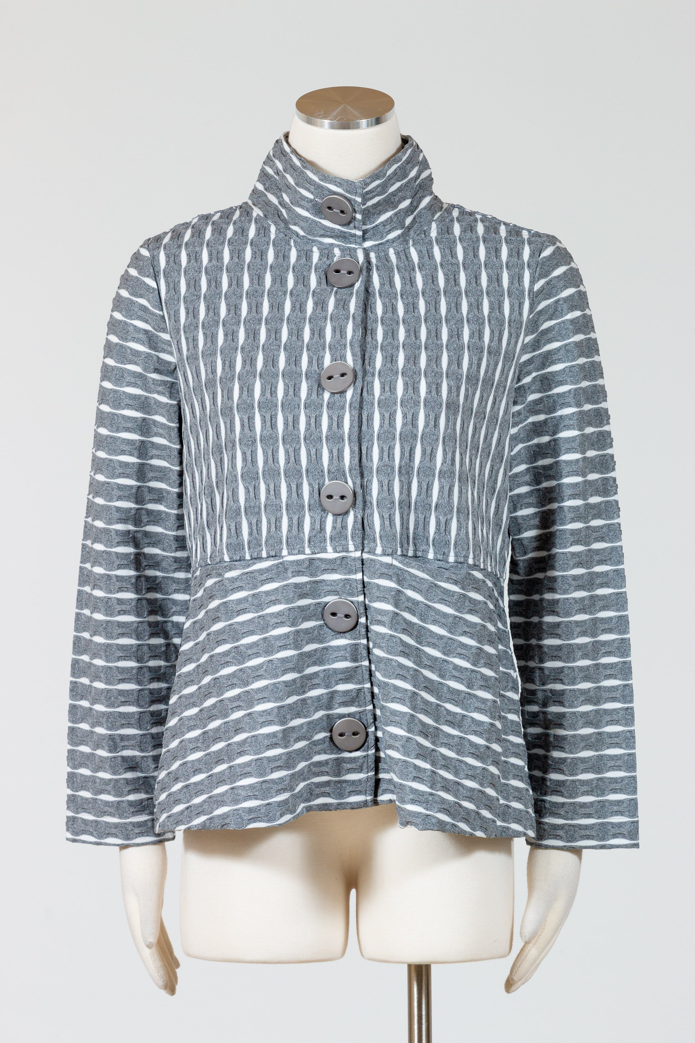 Revamp your wardrobe with Habitat’s Newport Knit Downtown Jacket. This must-have button front stretch knit jacket has a unique puckered stripe pattern that adds a touch of texture. Made with a comfortable and relaxed fit, this jacket is perfect topper that can be worn as a shirt or jacket. Features a high, stand-up collar with oversized decorative buttons and invisible on-seam front pockets. Effortlessly stylish and sophisticated, it hits just below the hips for a polished finish.