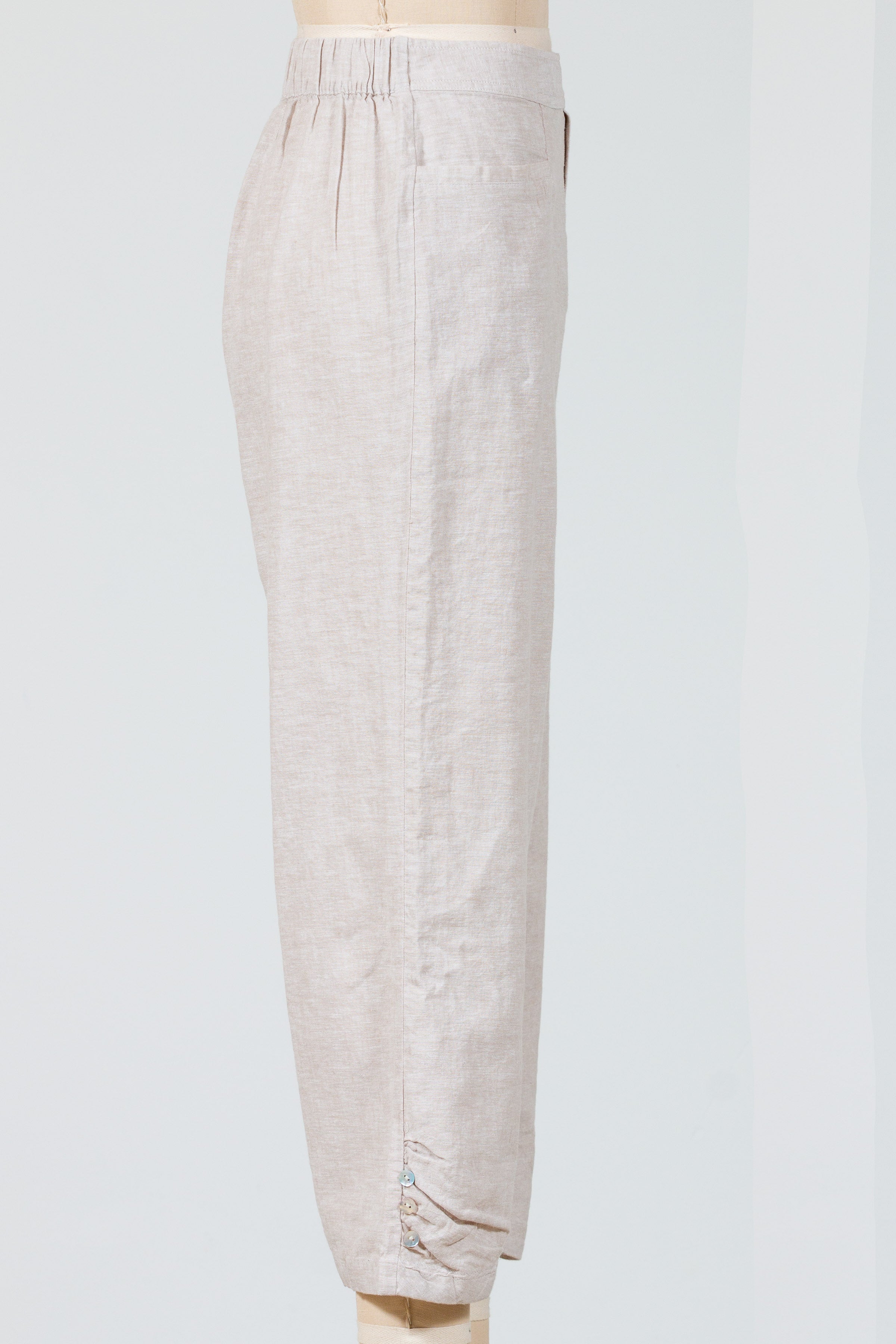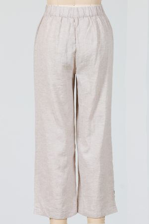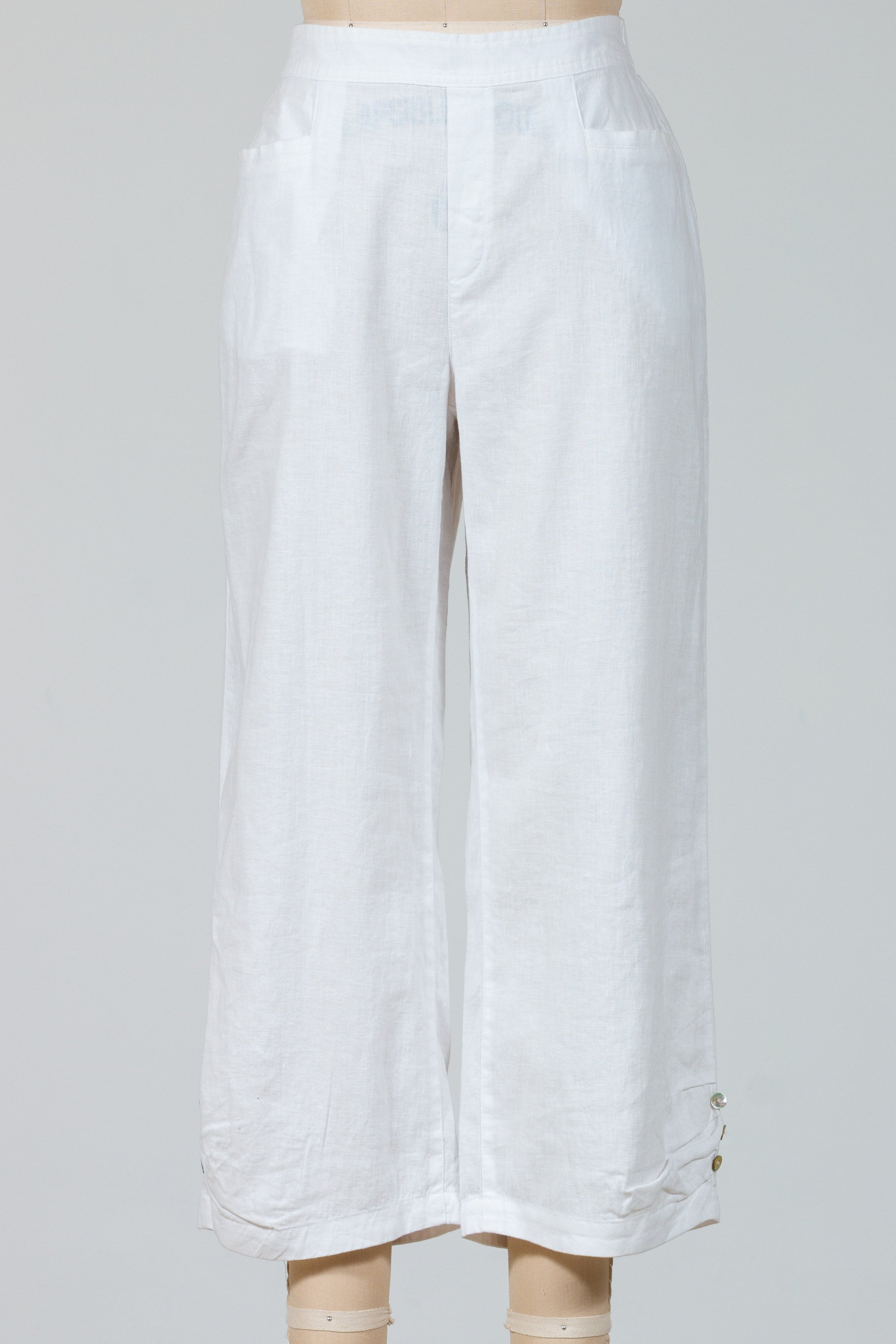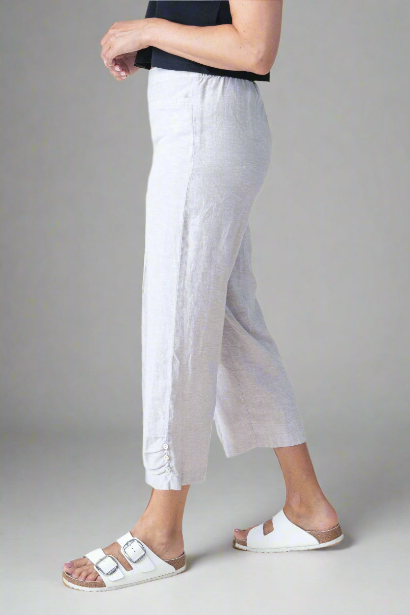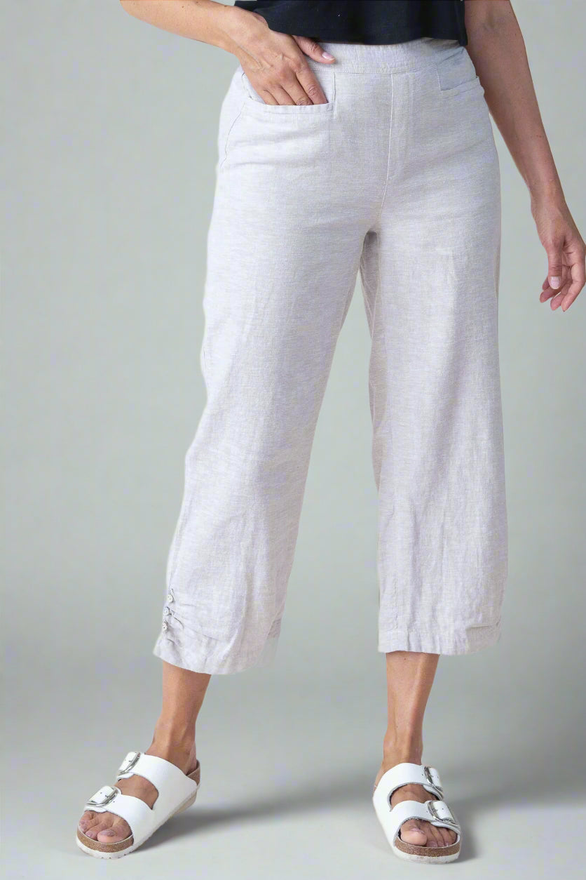 Embrace the relaxed vibe of summer with Habitat Pleat Button Capris – a versatile and comfortable pull-on linen pant with pleats and buttons at the hem for added interest. Crafted from a lightweight linen-cotton fabric, these capris feature a flat front and elastic back for a perfect fit, along with two front angled pockets. Easy to style and perfect for warm weather, these capris will become your go-to for effortless style and comfort.Â