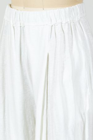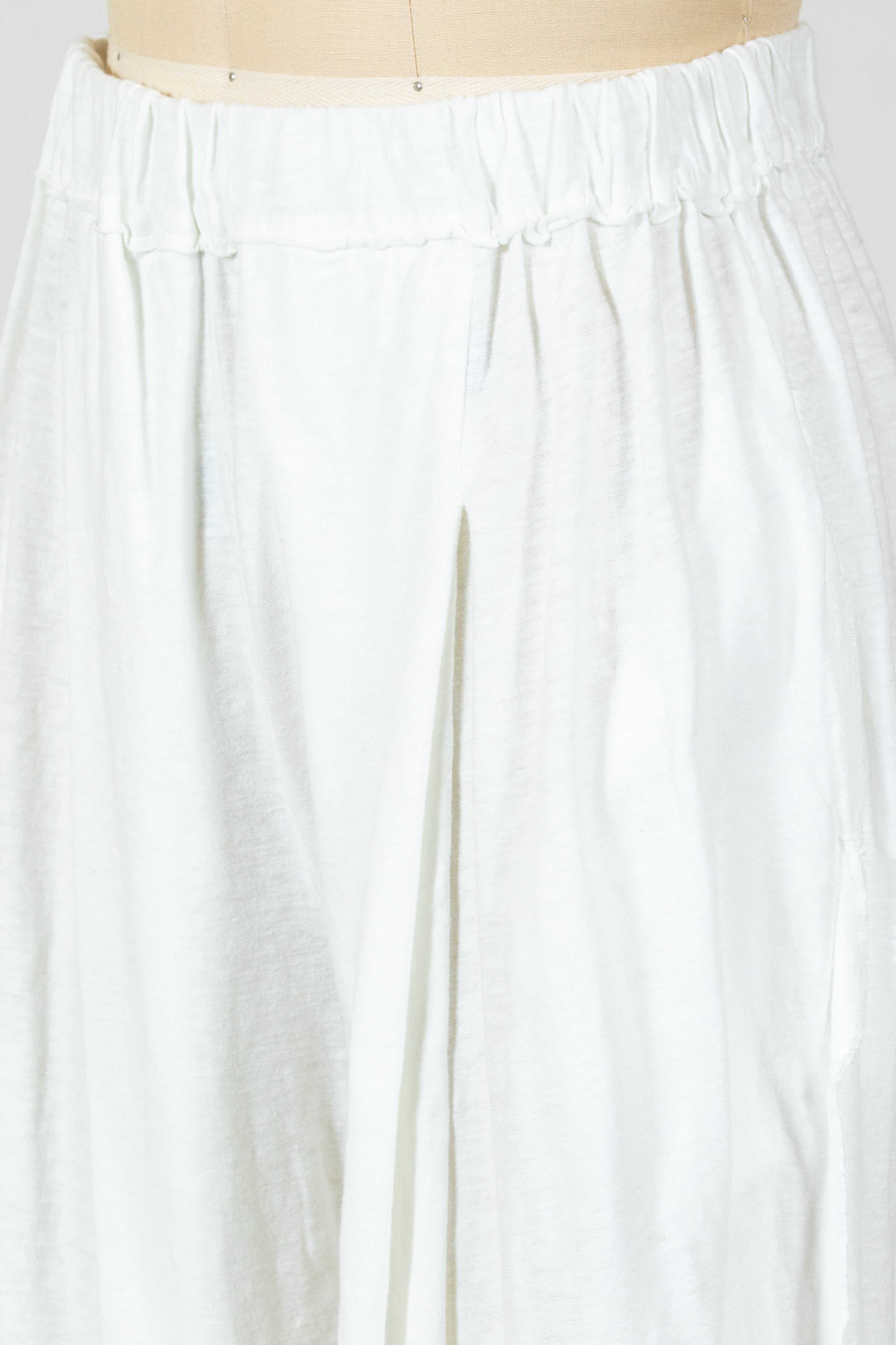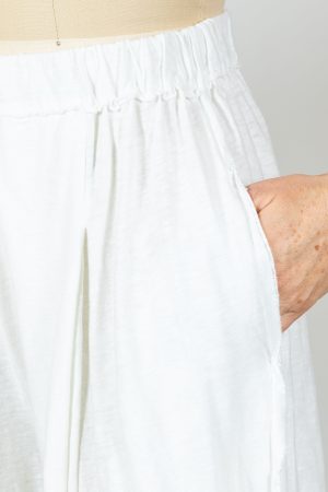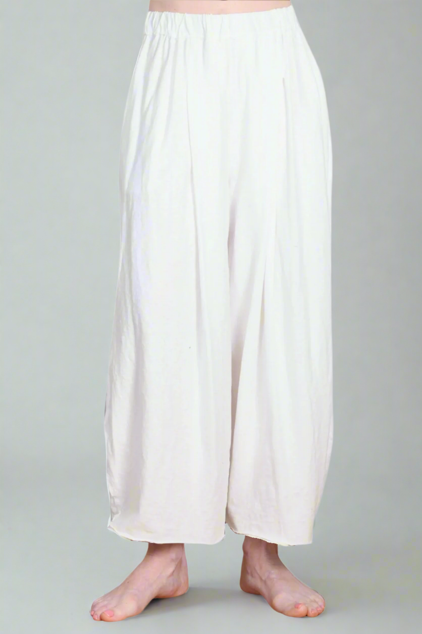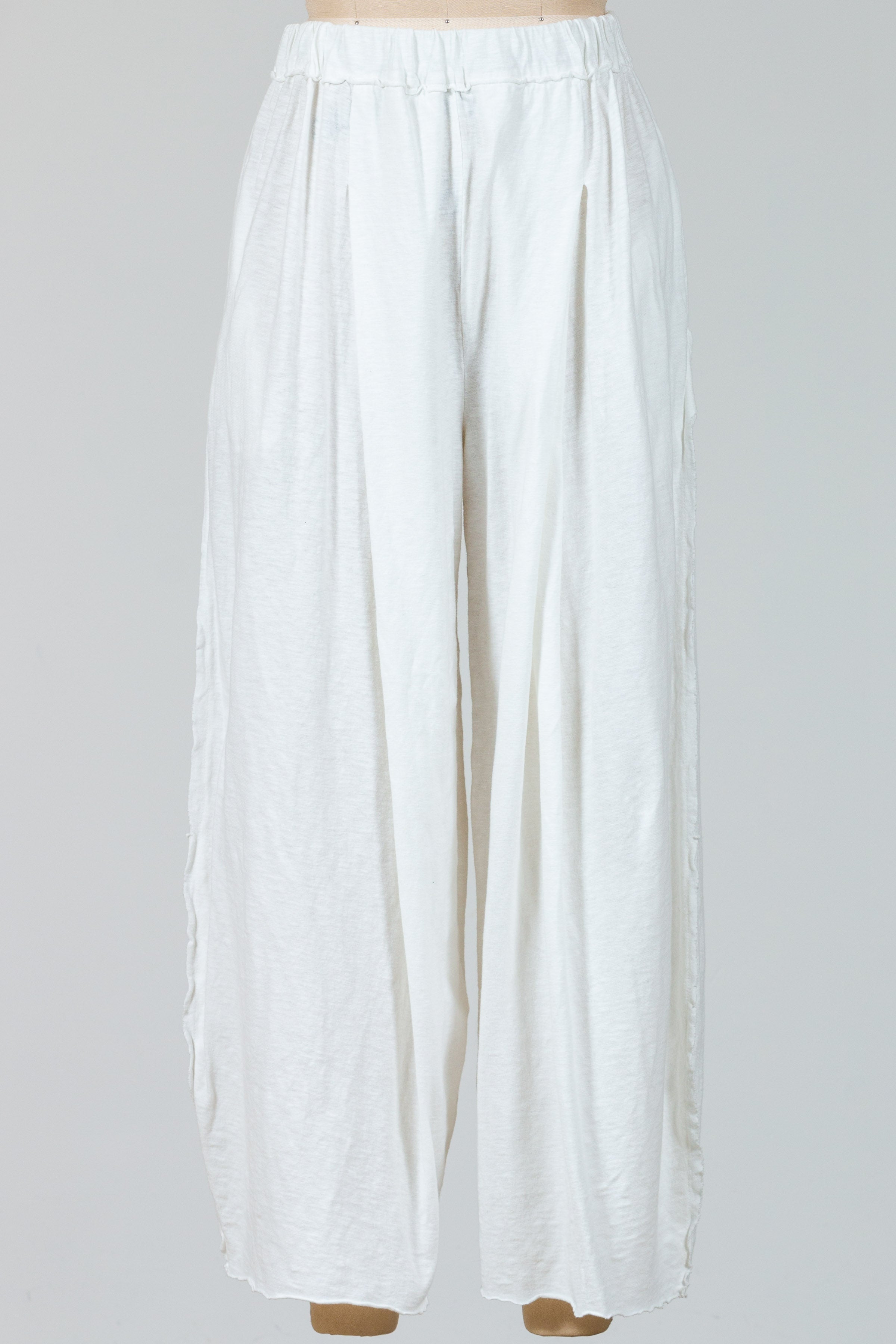 Cut Loose’s Pleat Pant is a pull on pleated pant with wide leg that falls long, just over the ankles on most. This pant has a wide elastic waistband and a comfortable and stylish fit. Wide legs taper in towards the bottom hem for a slight barrel shape. Contemporary pleated style for day to night wear. Knit cotton and linen jersey fabric is mid-weight and breathable. Two side pockets.