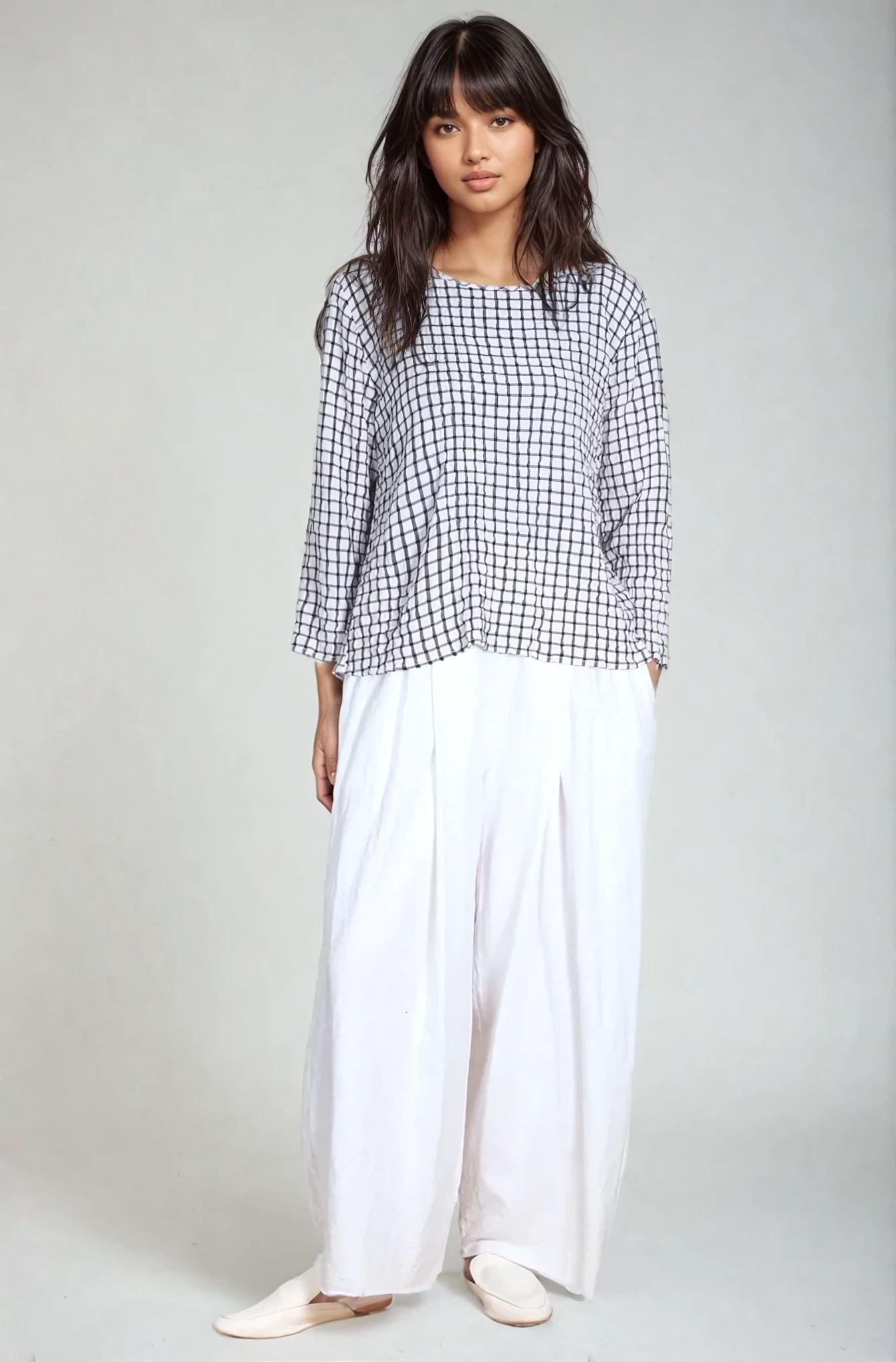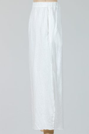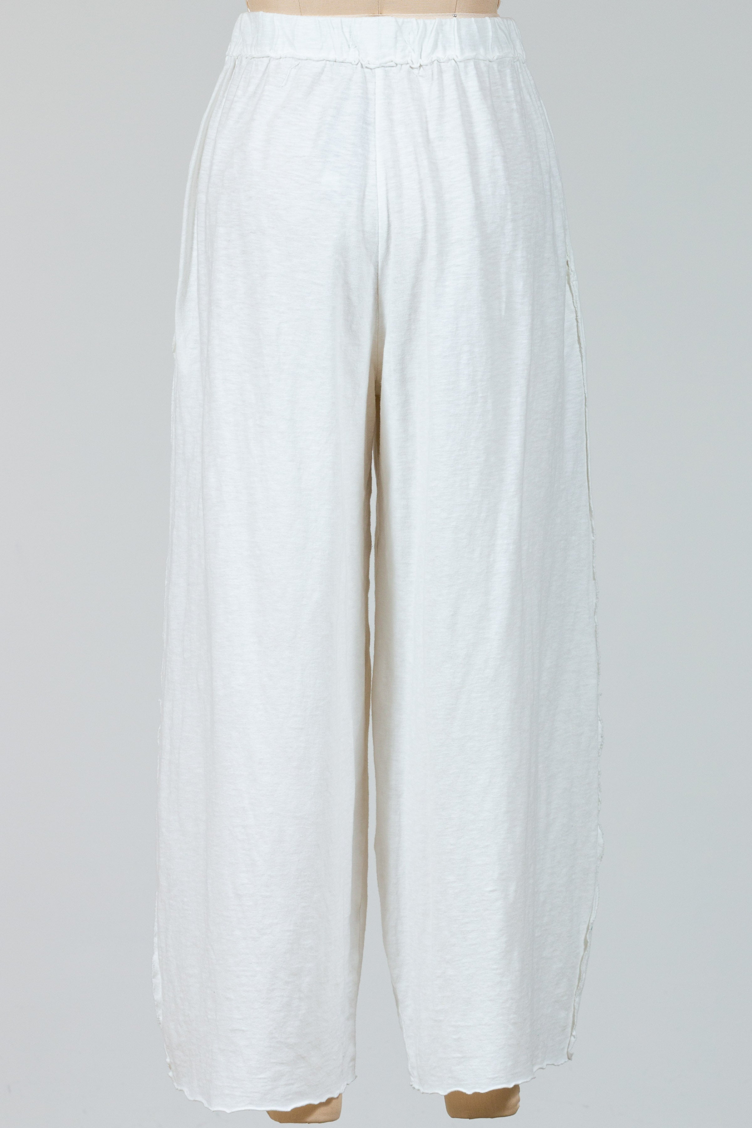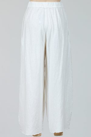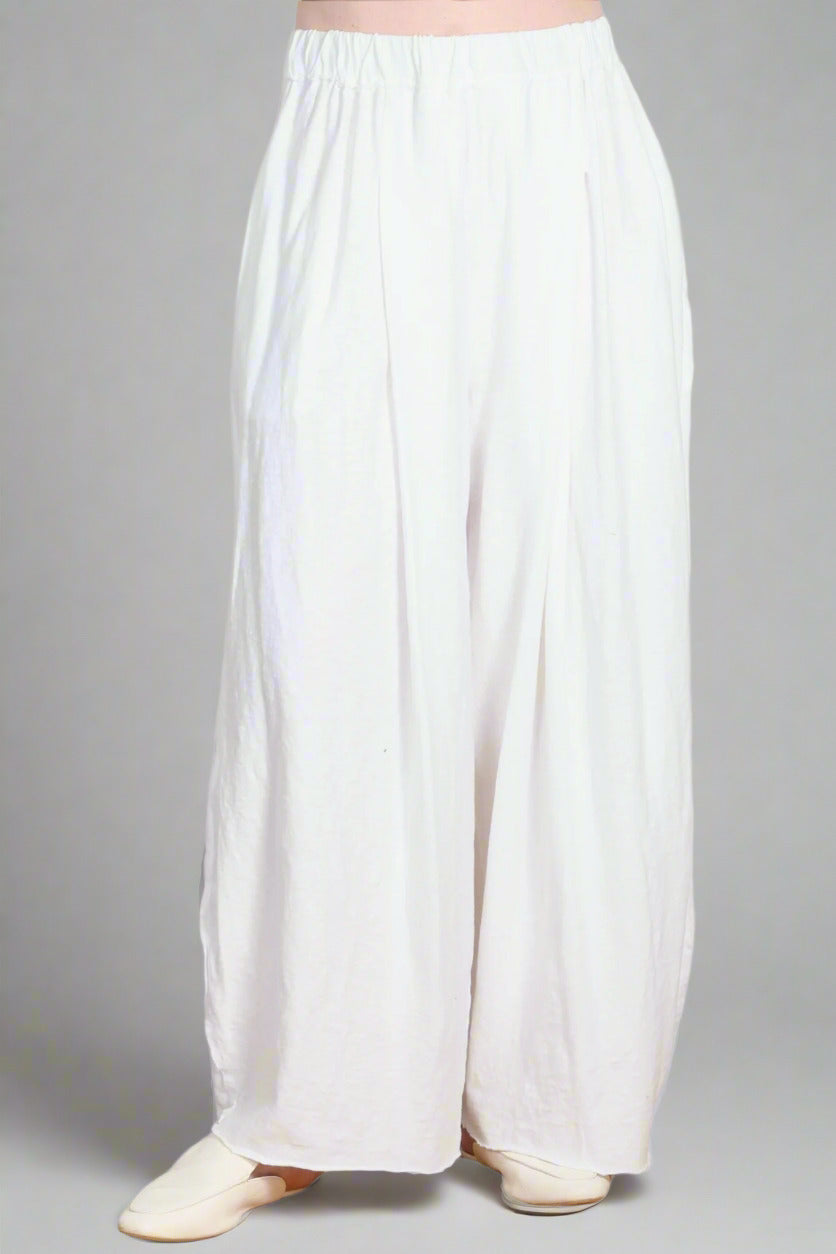 Cut Loose’s Pleat Pant is a pull on pleated pant with wide leg that falls long, just over the ankles on most. This pant has a wide elastic waistband and a comfortable and stylish fit. Wide legs taper in towards the bottom hem for a slight barrel shape. Contemporary pleated style for day to night wear. Knit cotton and linen jersey fabric is mid-weight and breathable. Two side pockets.