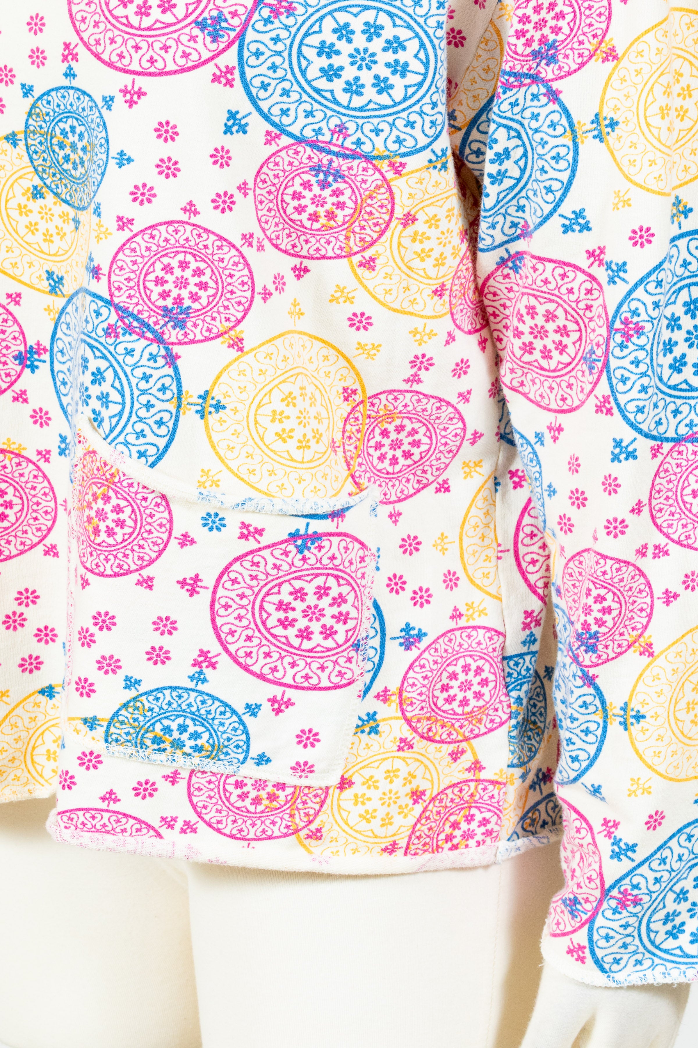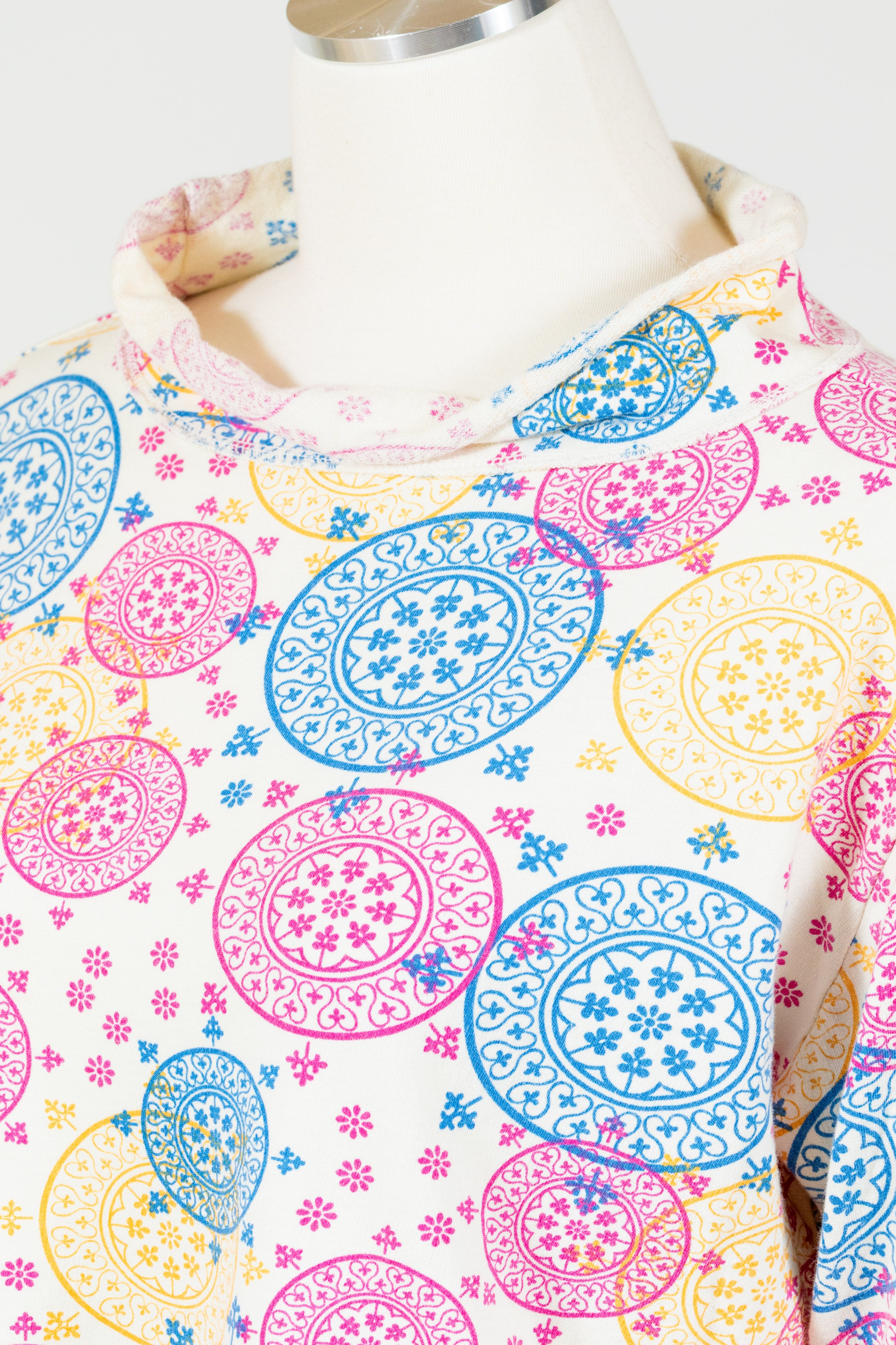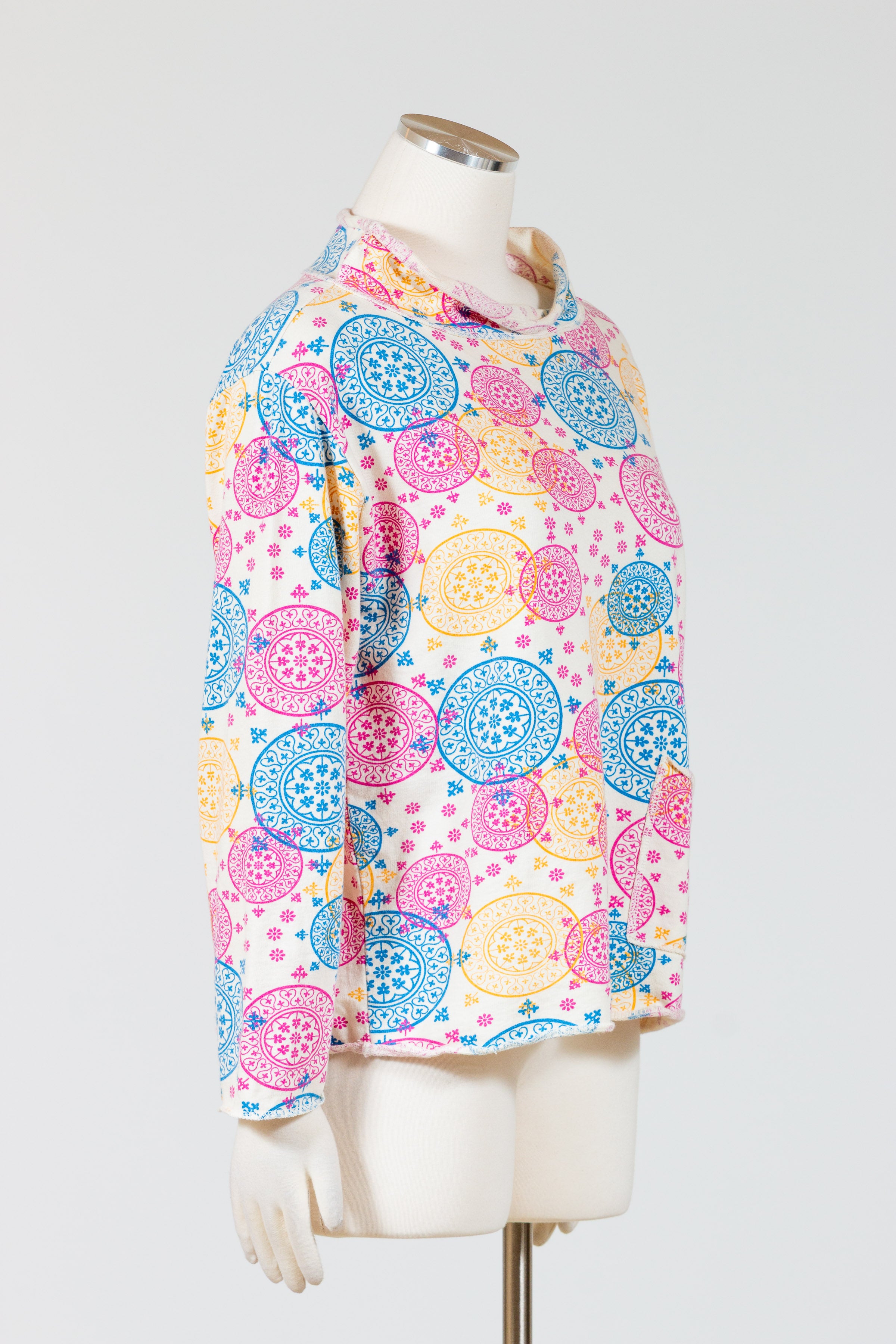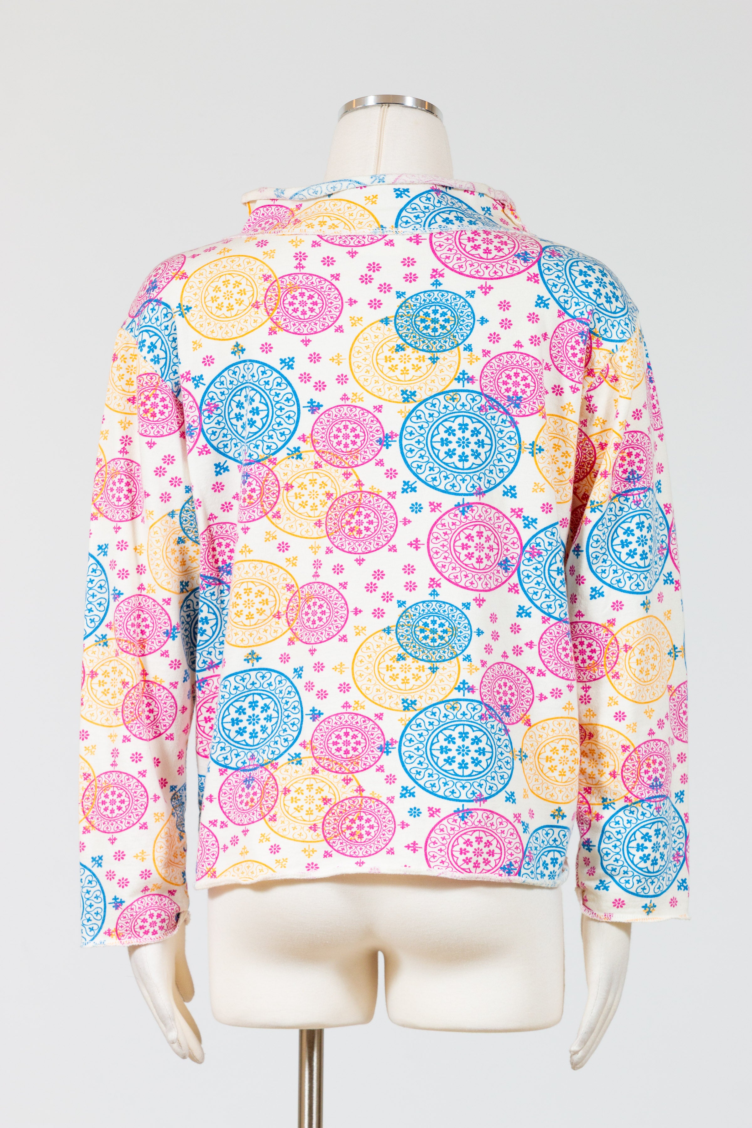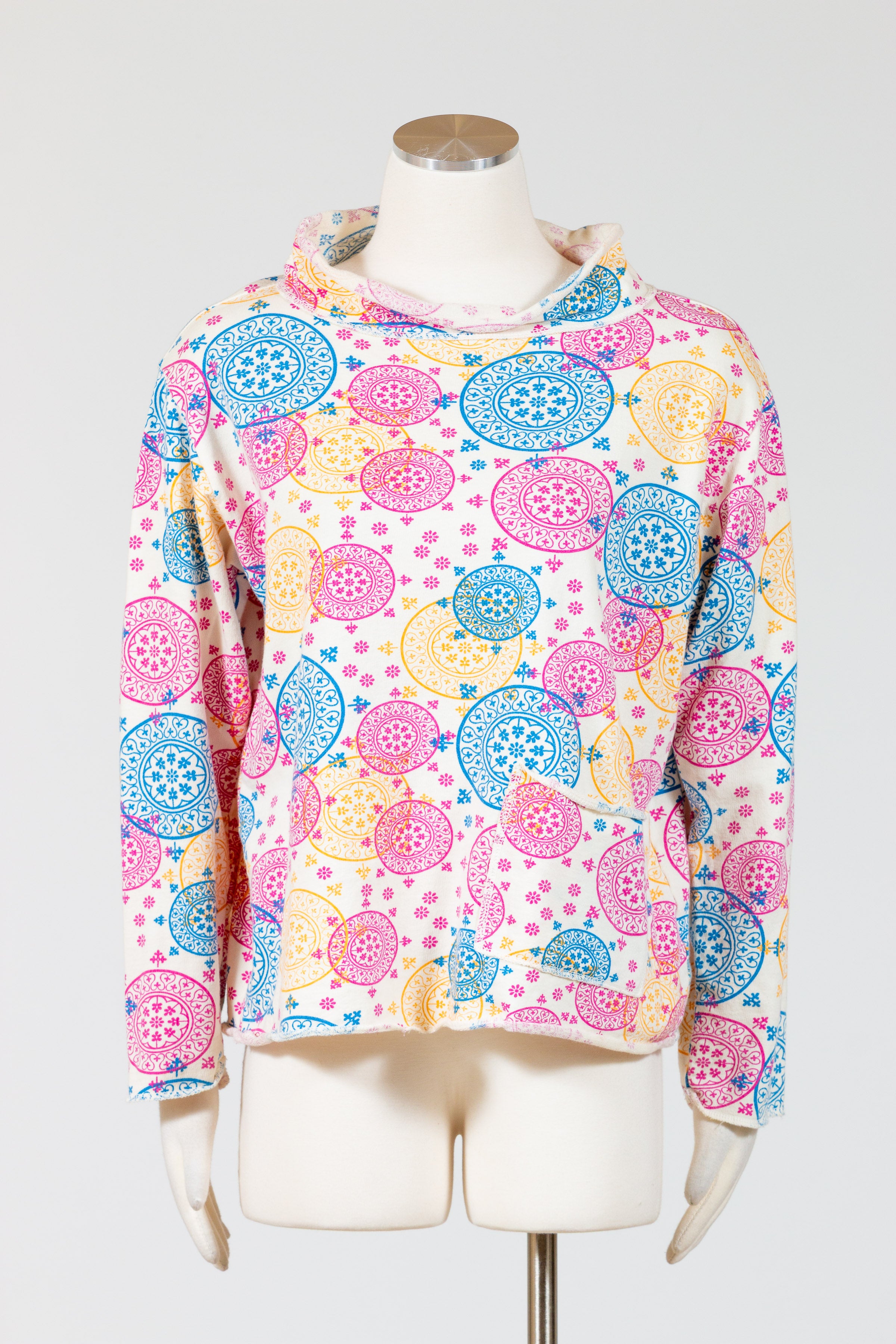 The Relaxed Yoga Top in Prairie Cotton is a printed pullover with a boxy fit, made from stretchy cotton fabric. It boasts a rolled mock neck, long sleeves, and wide design, with rolled hems for a laid-back, cozy appearance. The abstract circular print adds a unique touch, and there’s even a handy front patch pocket! This top falls just below the waist for a flattering silhouette.