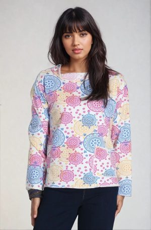 The Relaxed Yoga Top in Prairie Cotton is a printed pullover with a boxy fit, made from stretchy cotton fabric. It boasts a rolled mock neck, long sleeves, and wide design, with rolled hems for a laid-back, cozy appearance. The abstract circular print adds a unique touch, and there’s even a handy front patch pocket! This top falls just below the waist for a flattering silhouette.