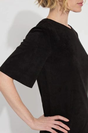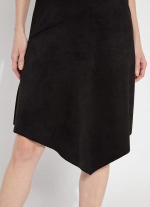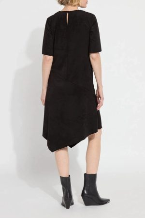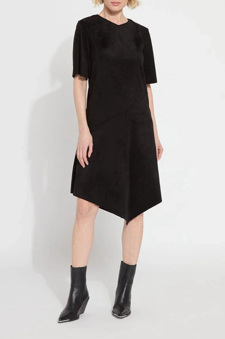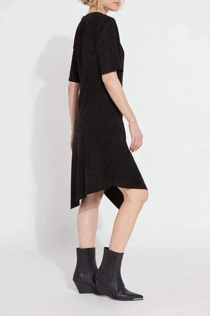 The LYSSÃ Sadie Asymmetric Dress is an elegant and exclusive piece that draws inspiration from origami, created with smooth 4x-stretch Vegan Suede fabric and boasting a simple, relaxed silhouette. It has a bias seam, a rounded V-neck, and a back center seam, as well as a back keyhole with a self-covered button. This dress is unlined and can be easily shortened, and pairs beautifully with boots. It is also machine washable and we recommend to wash separately and hang dry upon delivery.Â