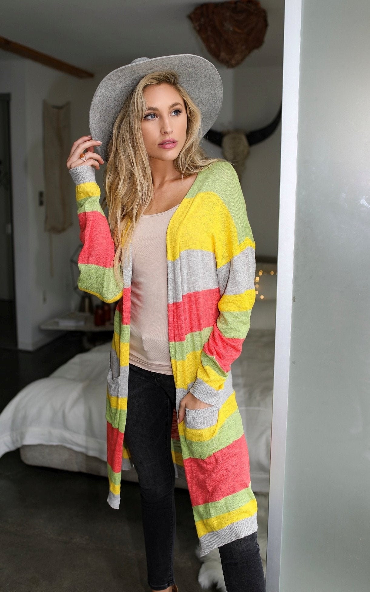 Lightweighted open-front cardigan in a vibrant, pop colored stripes.