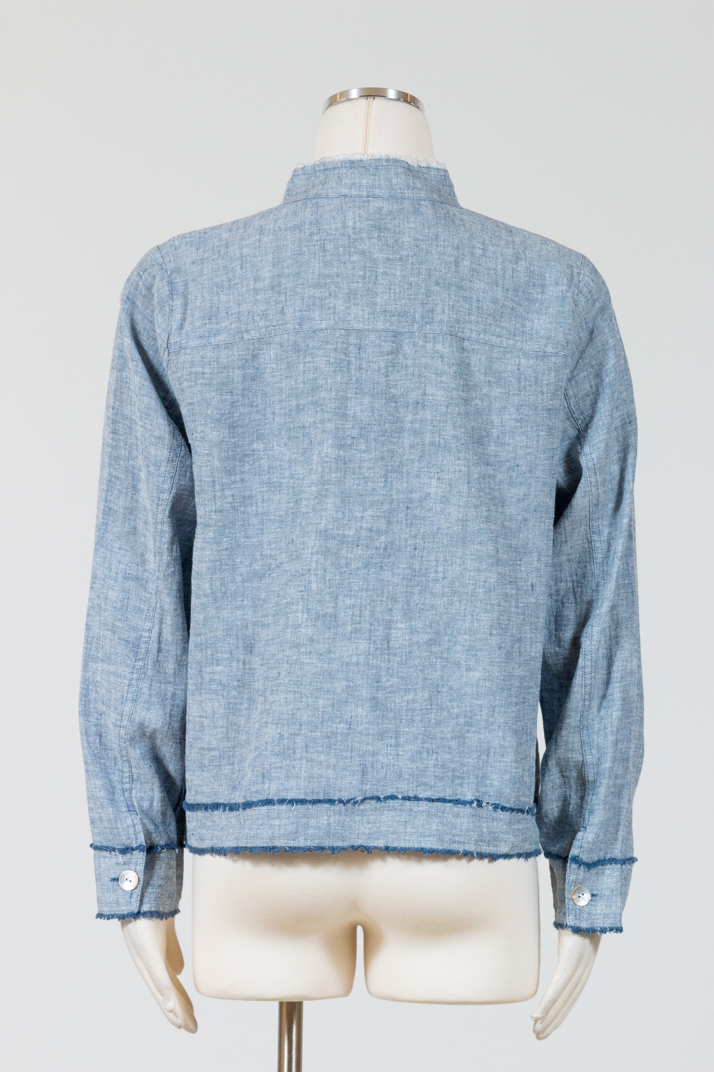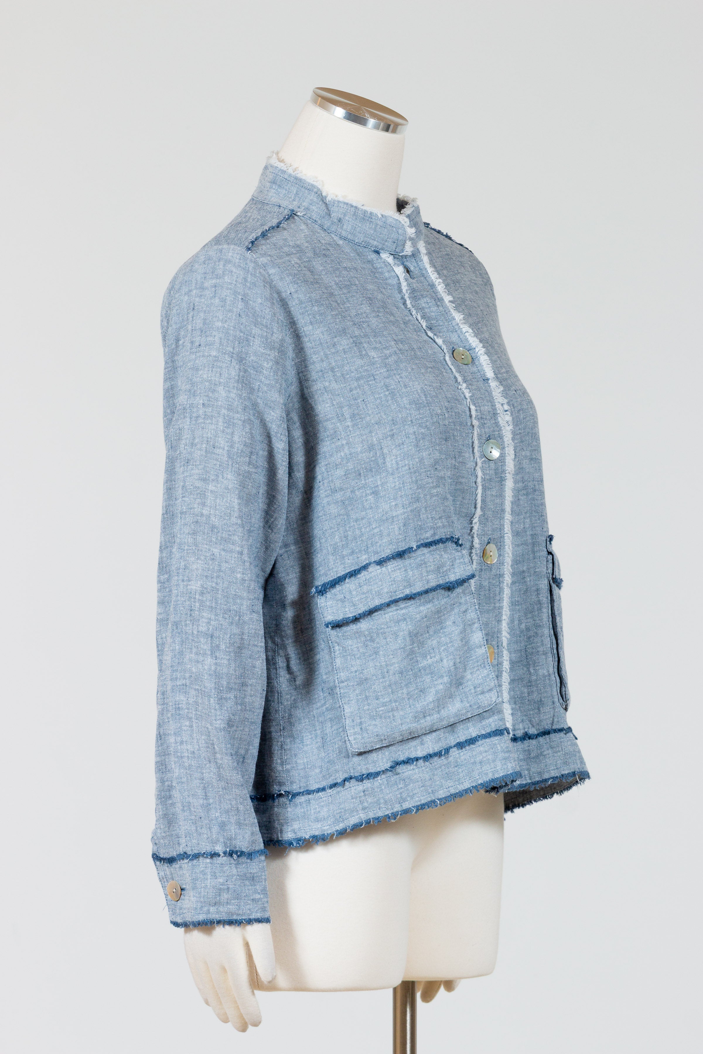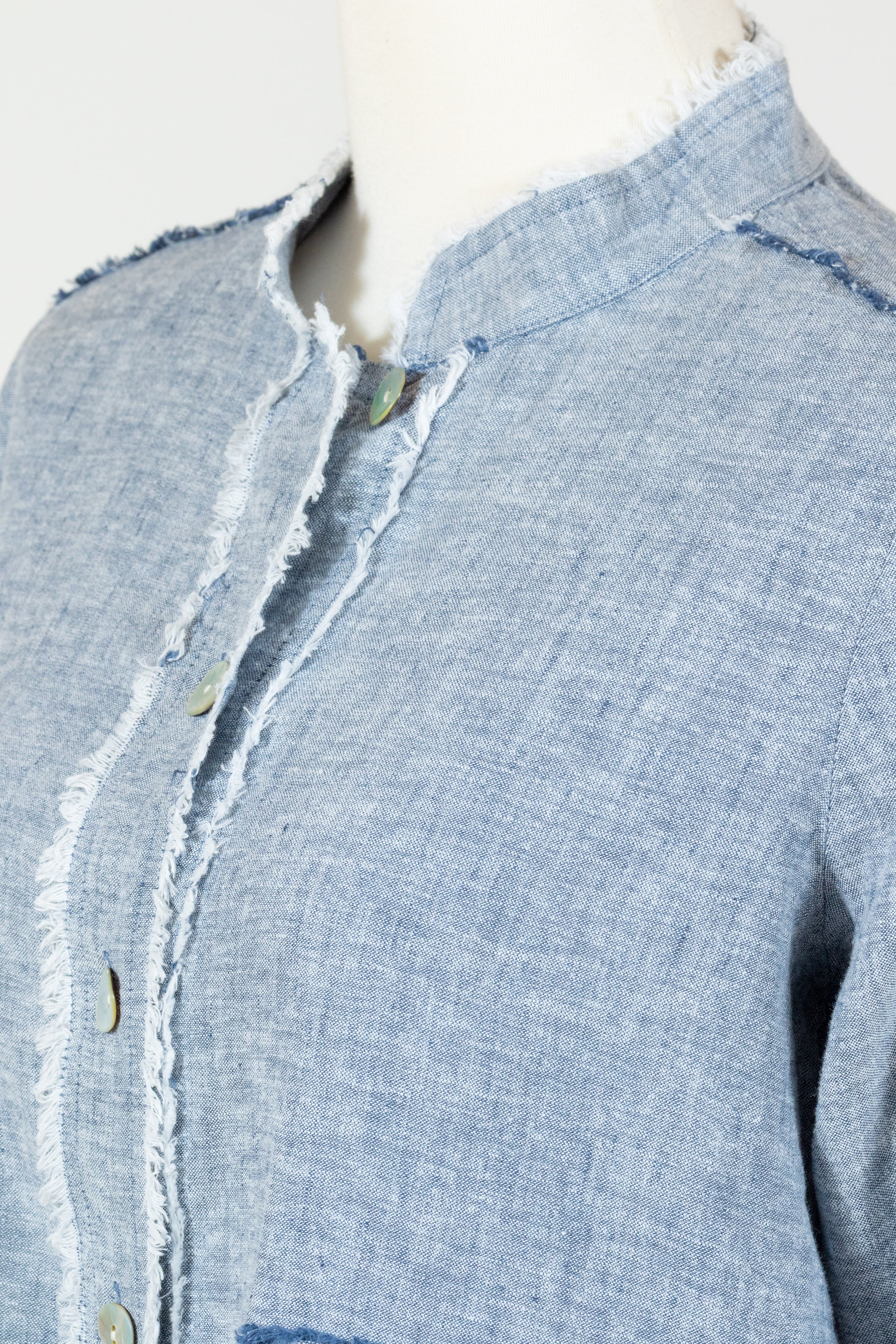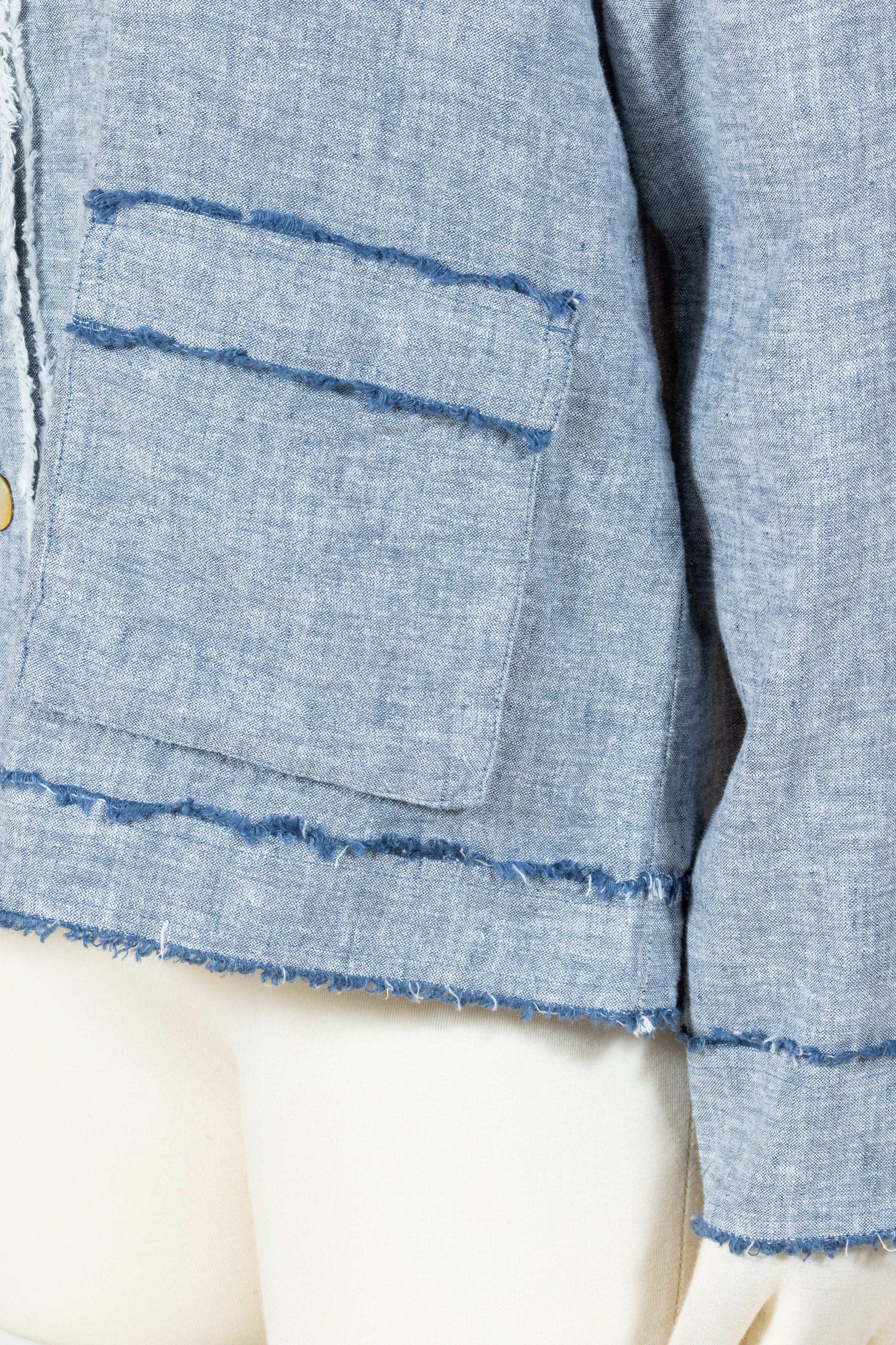 Introducing the Summer Breeze Jacket from Habitat – a luxuriously soft, linen statement piece. Featuring a button front closure, fringe seams, and a mandarin tab collar, this jacket is both functional and stylish. With front patch pockets and banded button cuffs, it offers a loose, boxy fit that falls at the hips. Versatile enough to be worn as a shirt or lightweight jacket, it’s the ideal choice for warm weather. Elevate your wardrobe with this must-have topper.