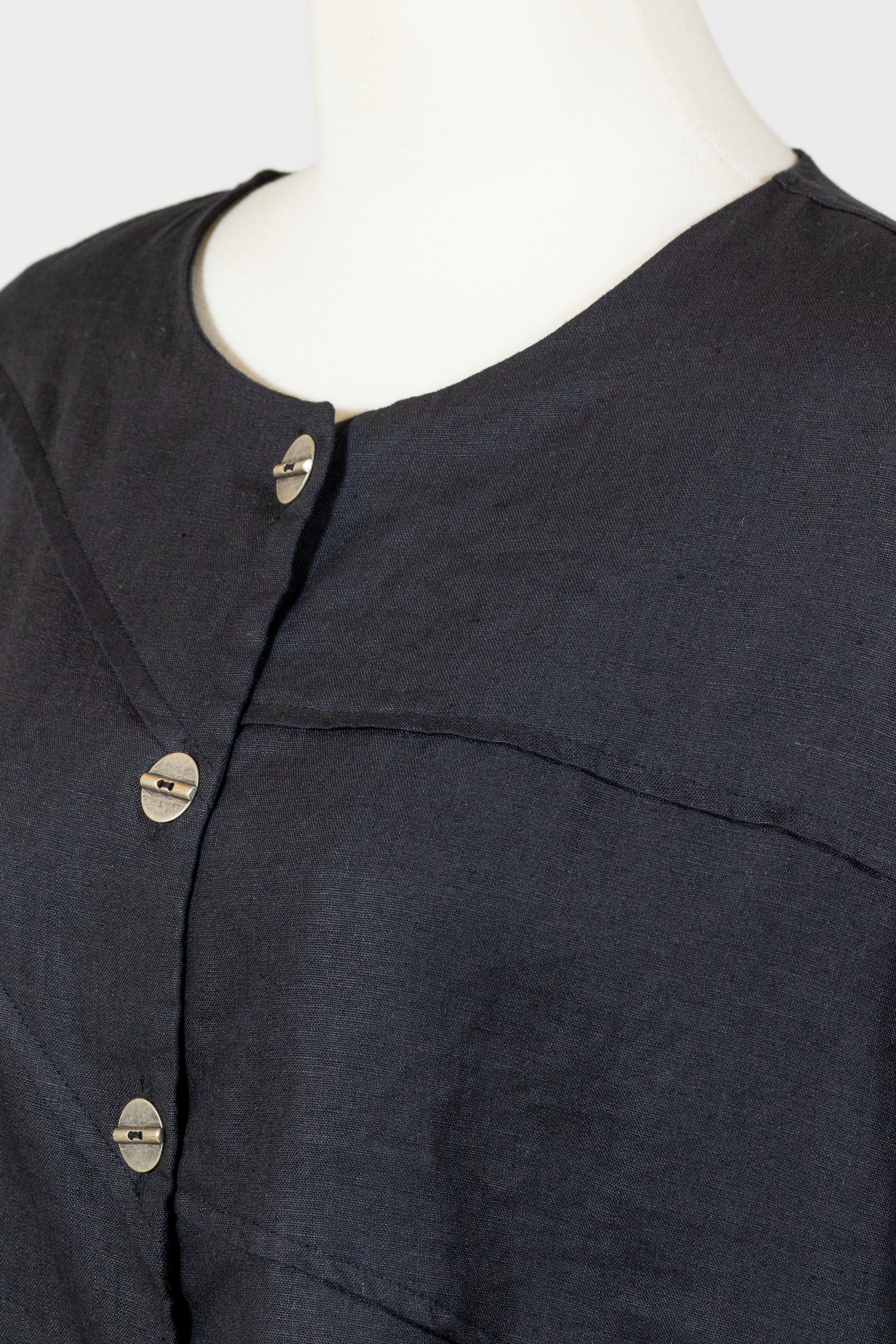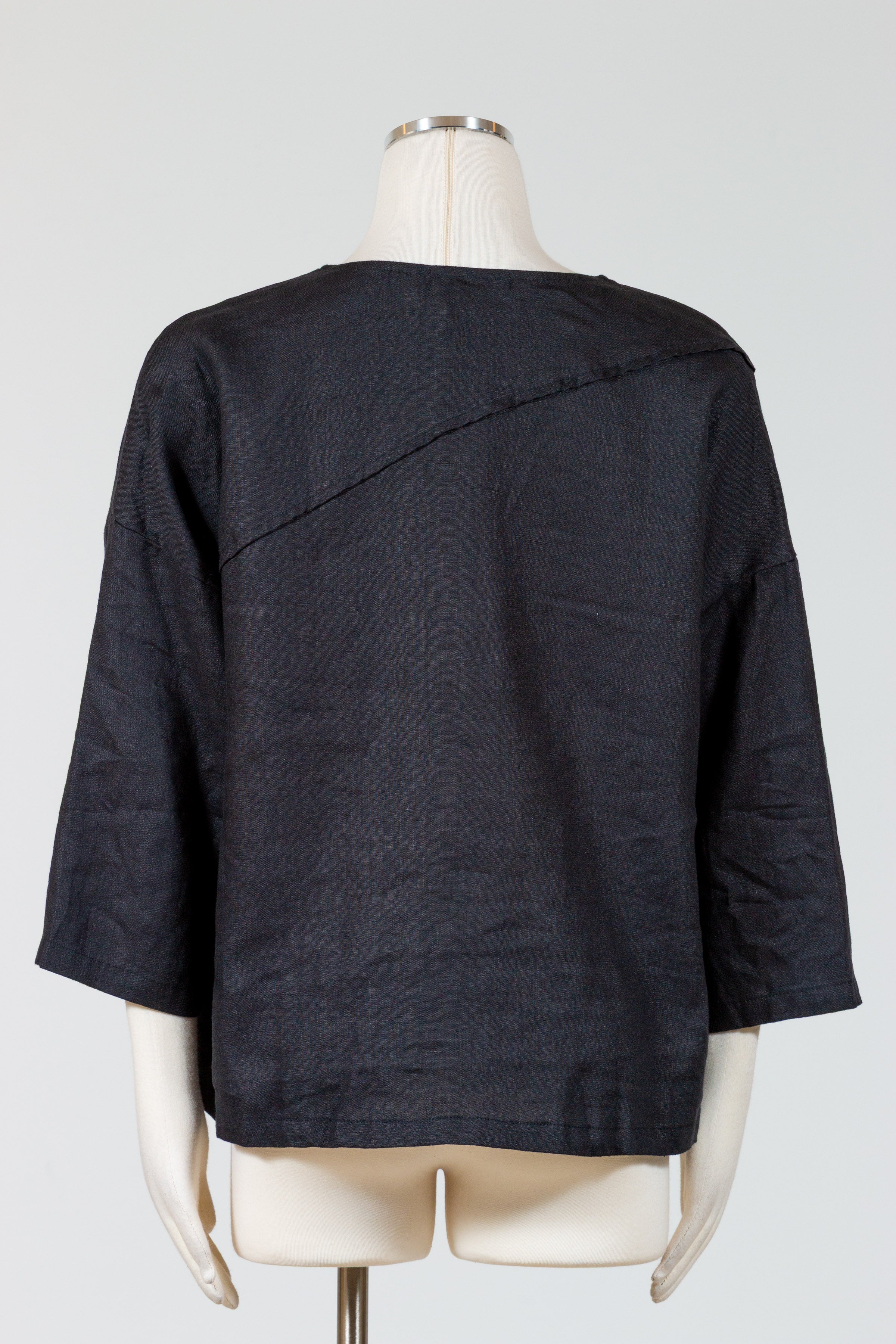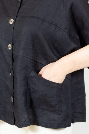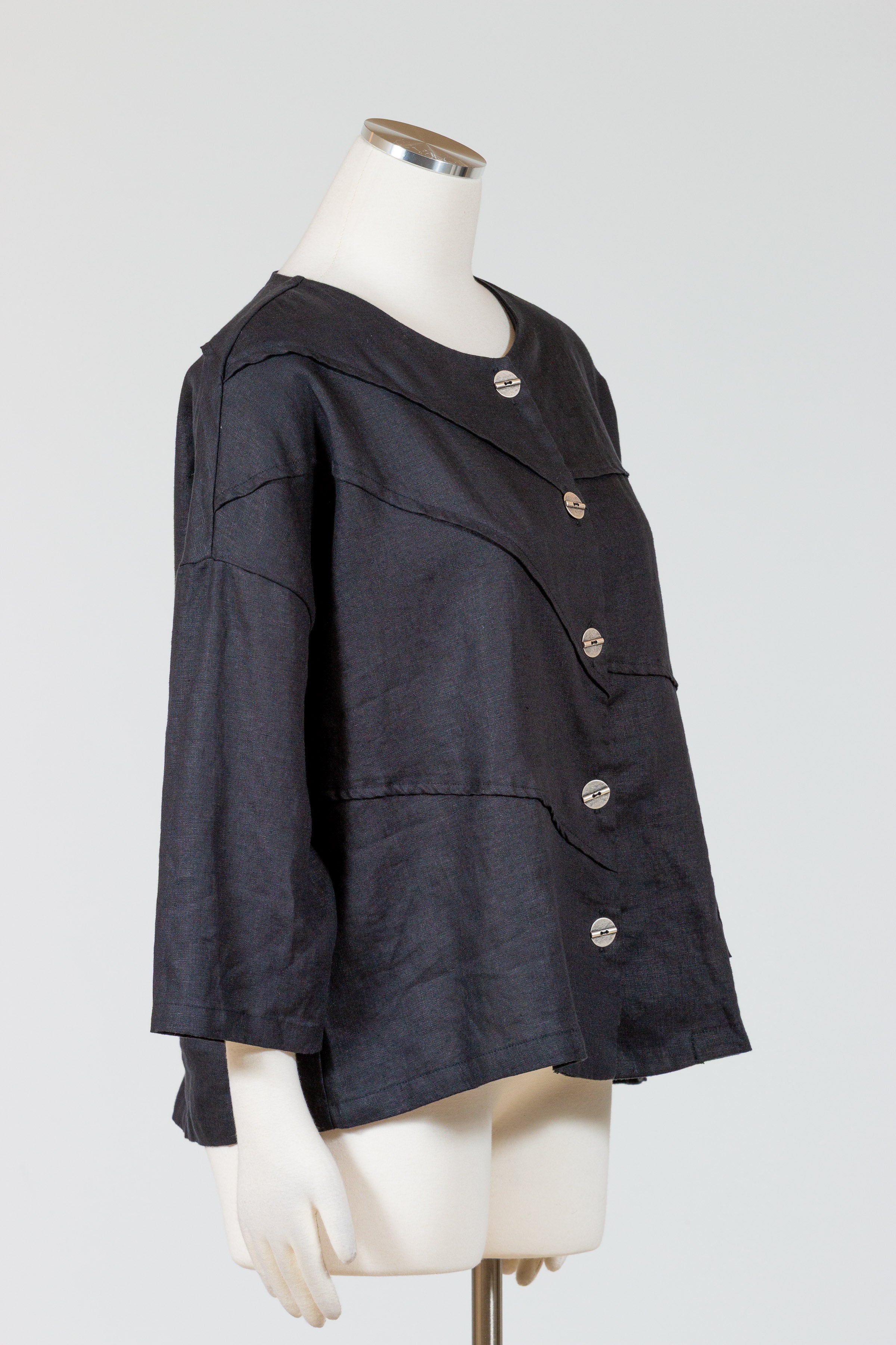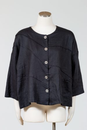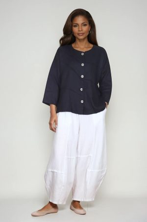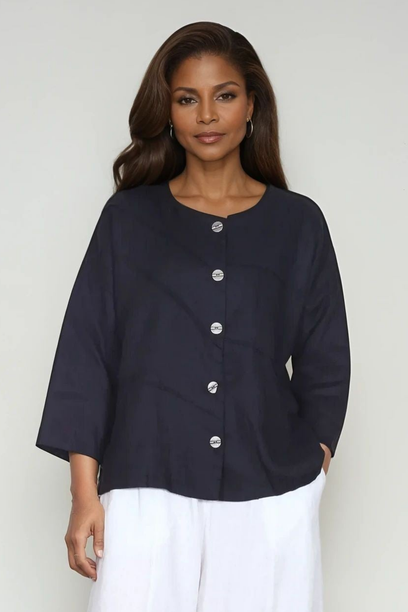 Experience the effortless elegance of Chalet’s Tenley Jacket – a chic button front jacket featuring a relaxed collarless design and unique diagonal seaming. Made from lightweight linen, this versatile topper can be worn open or closed for a sophisticated look. With three quarter length sleeves with dropped shoulders, the Tenley Jacket boasts a stylish boxy fit. This jacket has a straight hem that falls just over the hips and one convenient front pocket.