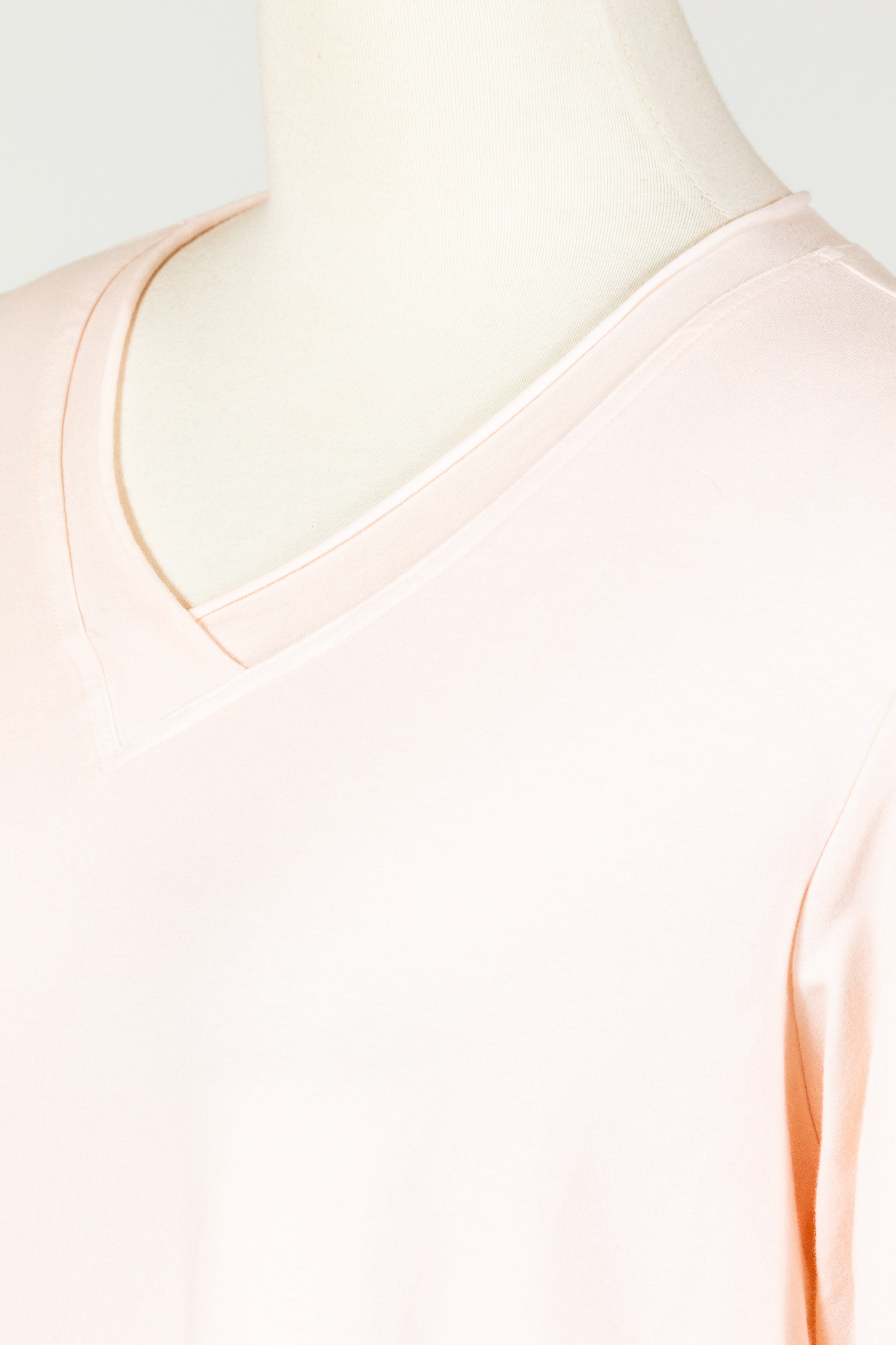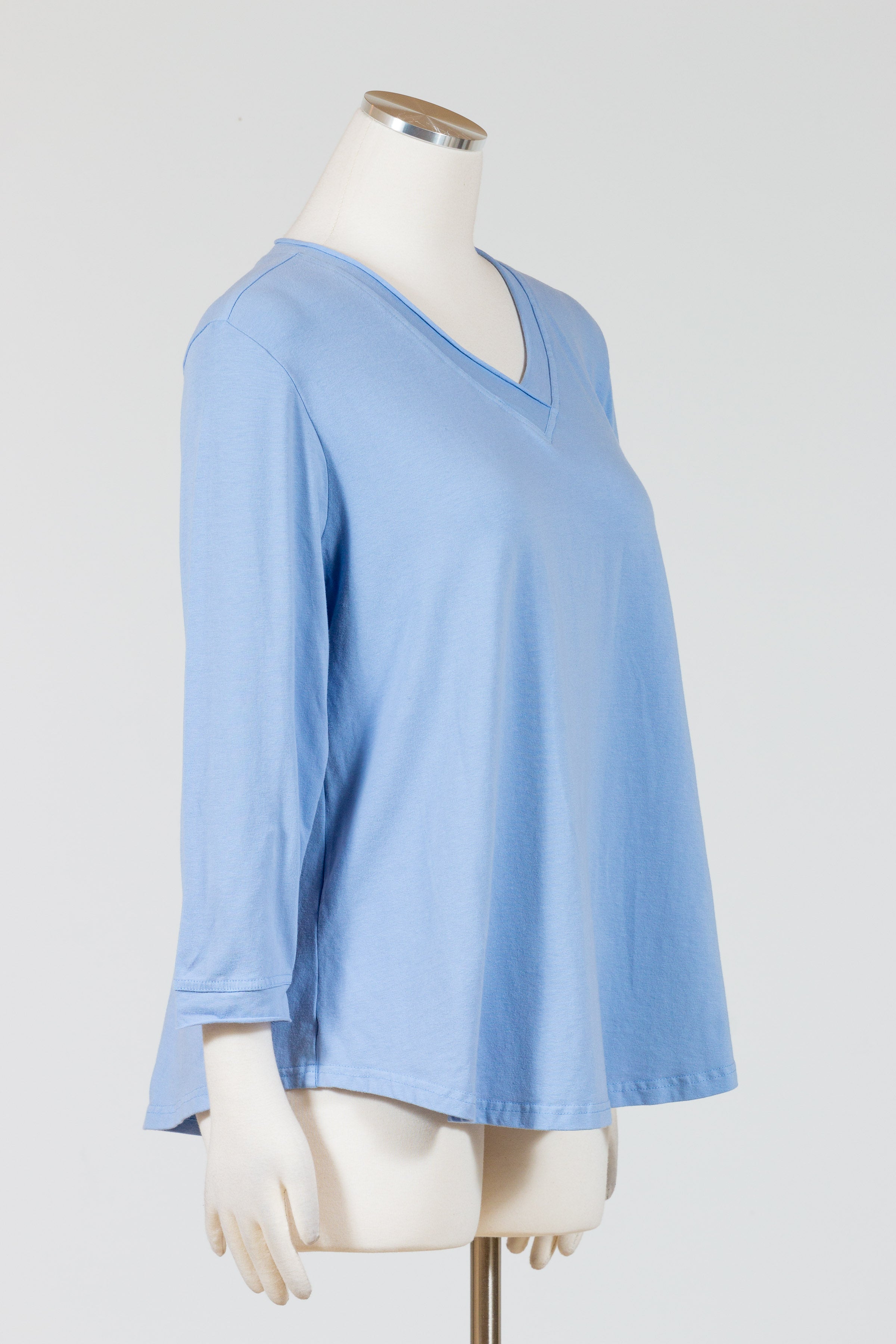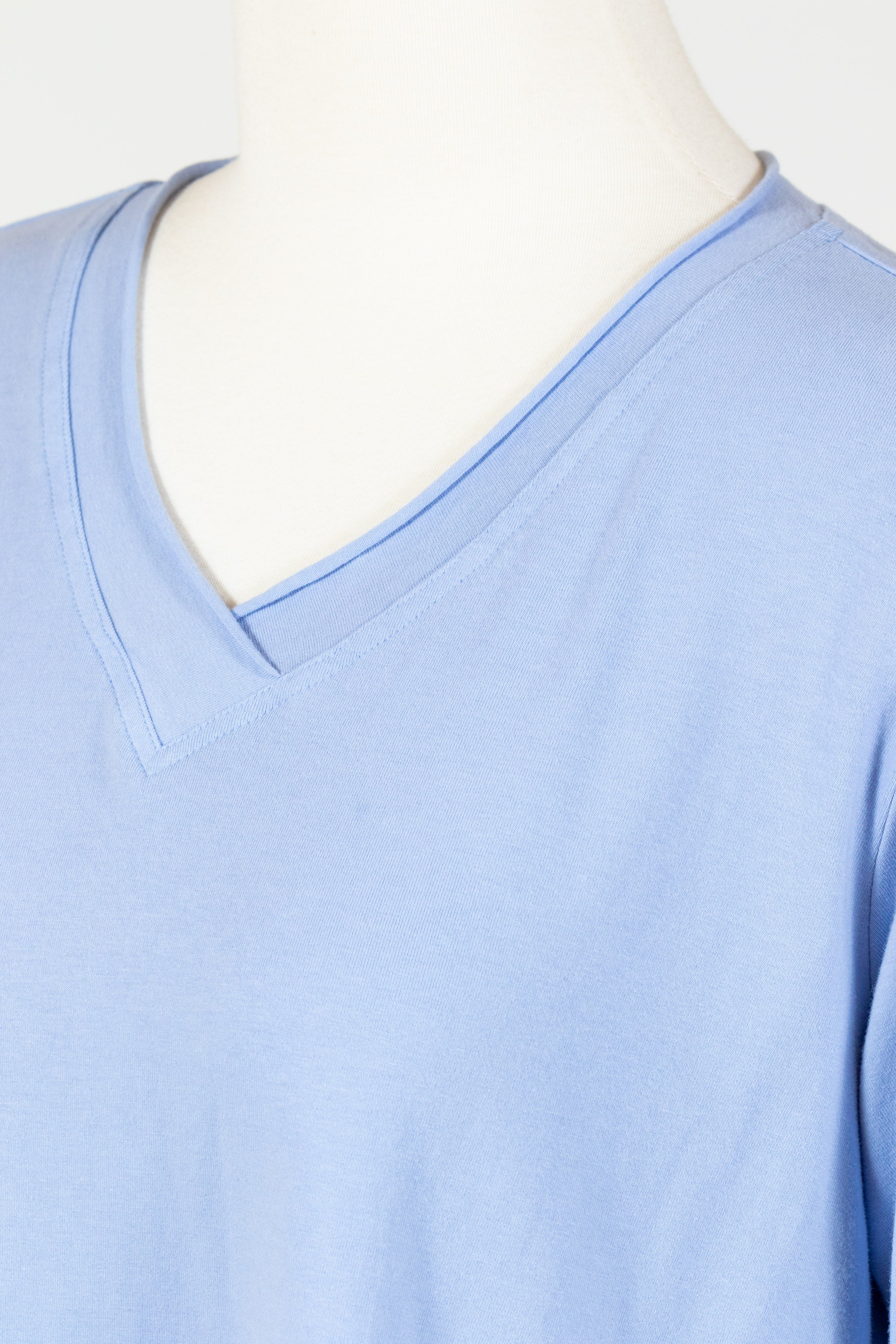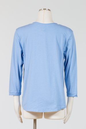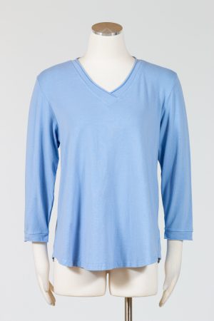 Kleen’s Three Quarter Sleeve V-Neck Tee is a breezy, cotton knit top that’s ideal for easygoing days. Featuring raw edges and rolled hems, this tee has a laid-back vibe. The loose A-line fit and curved hem that falls at the hips add to its flattering silhouette. No pockets.