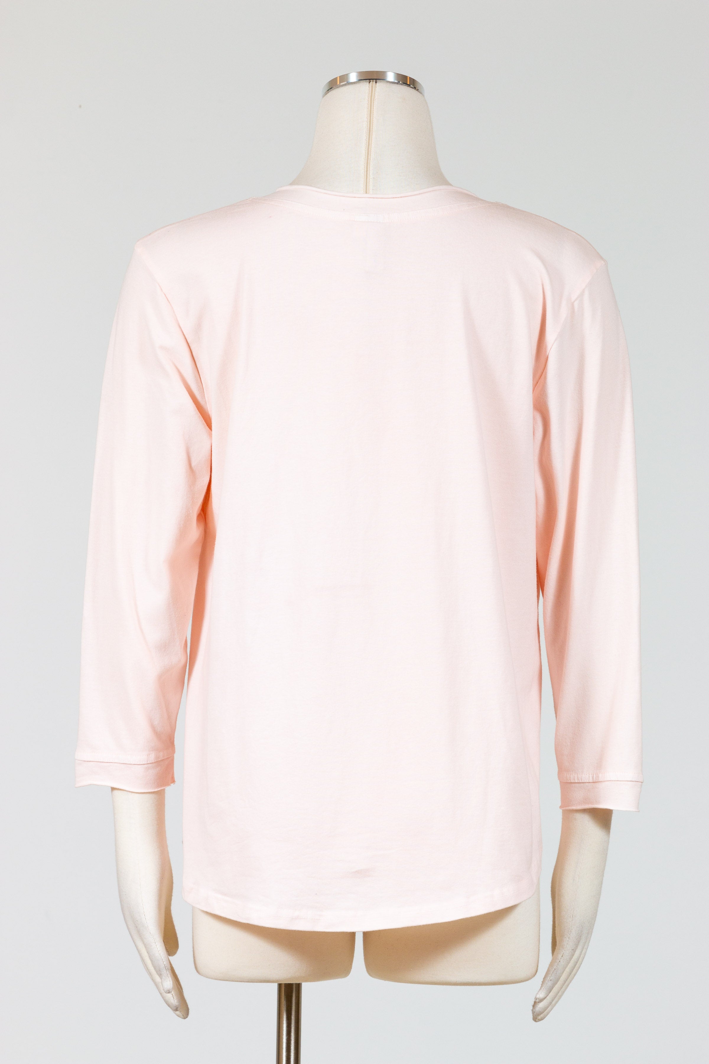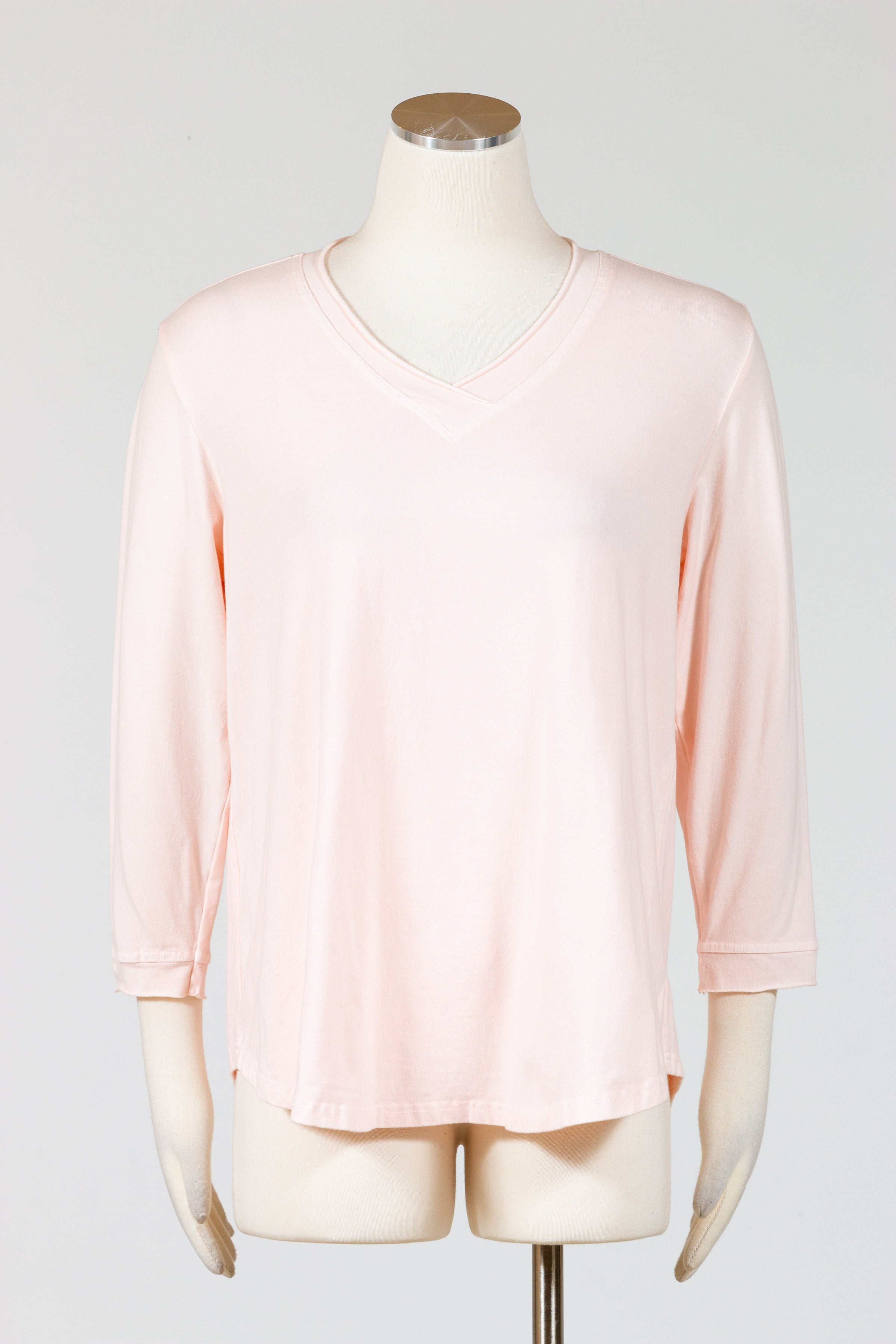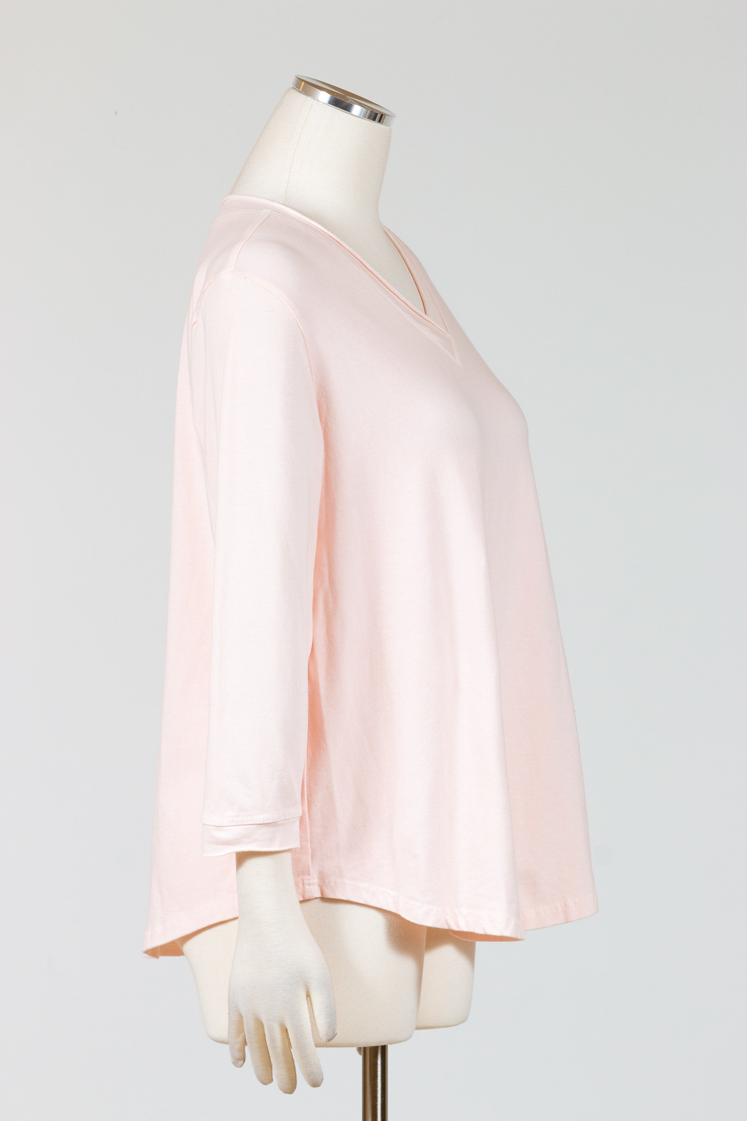 Kleen’s Three Quarter Sleeve V-Neck Tee is a breezy, cotton knit top that’s ideal for easygoing days. Featuring raw edges and rolled hems, this tee has a laid-back vibe. The loose A-line fit and curved hem that falls at the hips add to its flattering silhouette. No pockets.